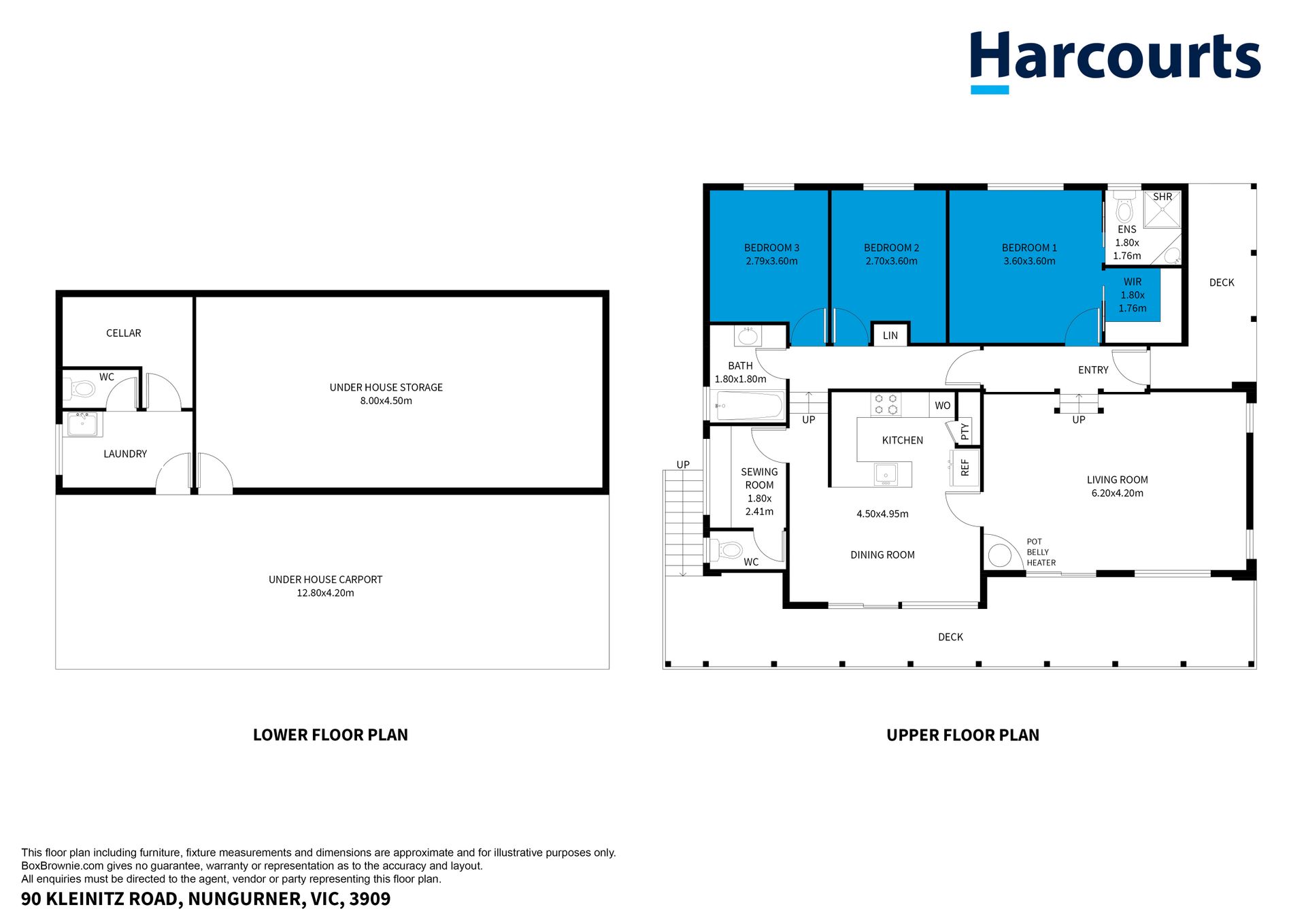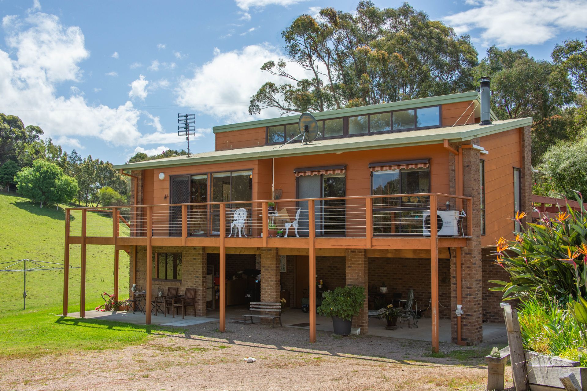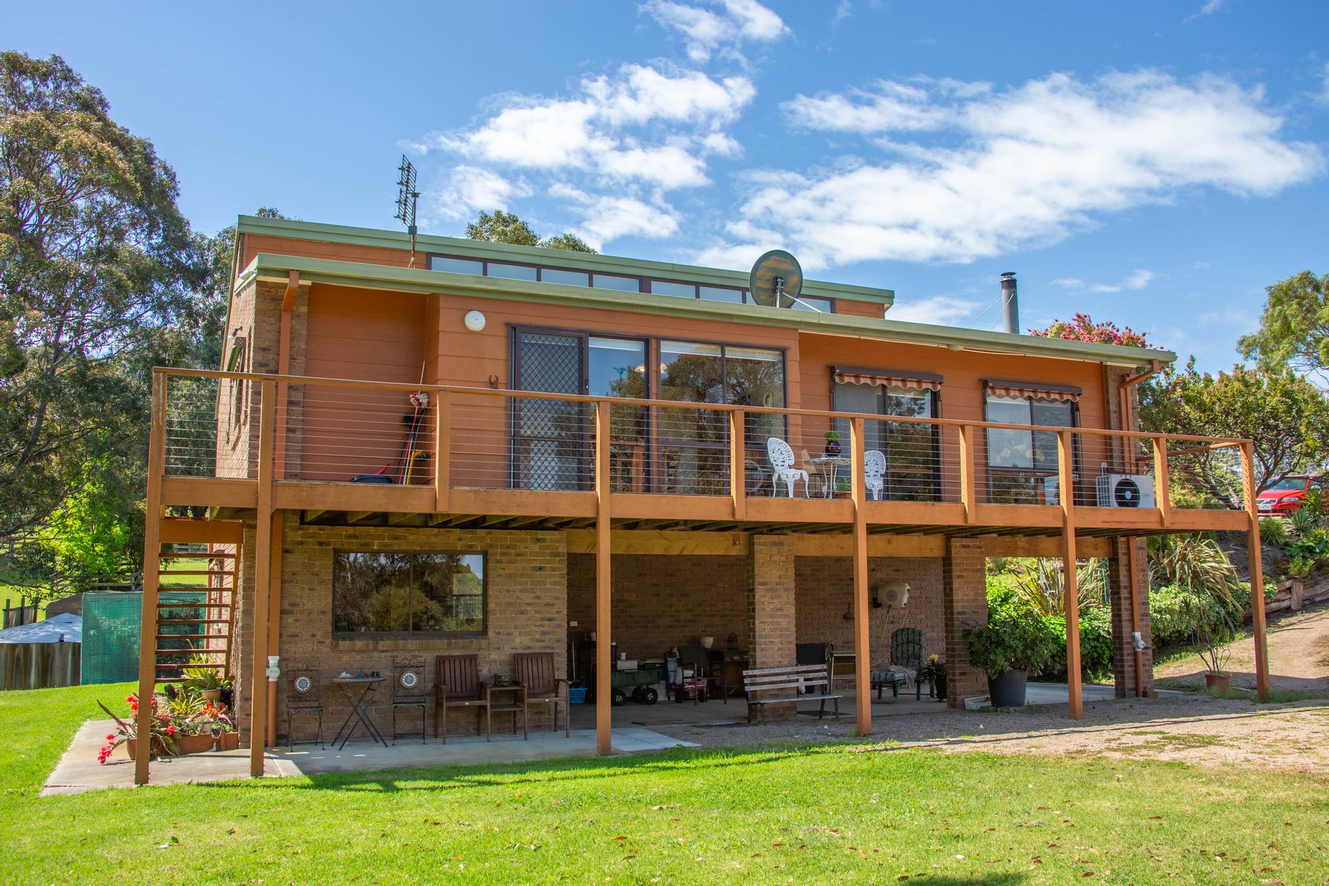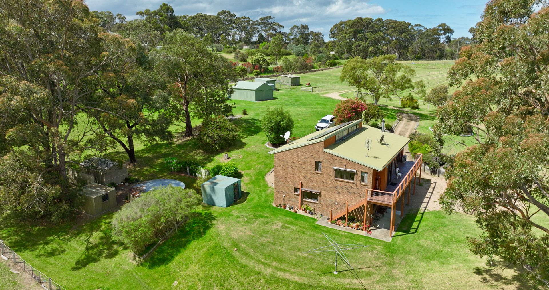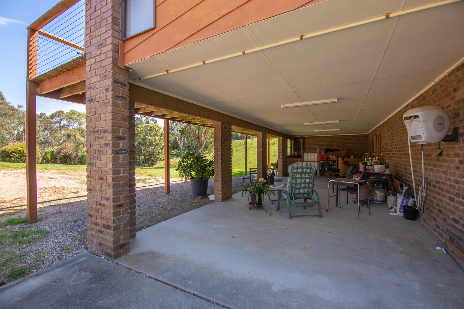 Under the home it has a full-length carport along with a downstairs laundry with a fourth toilet, a cellar and storage area. In the grounds there is a lockup colorbond shed with PA & sliding door access with concrete floor suitable for workshop trades, or dry storage for vehicles and toys. Auxiliary garden sheds, green houses and a concrete water tank service the property.