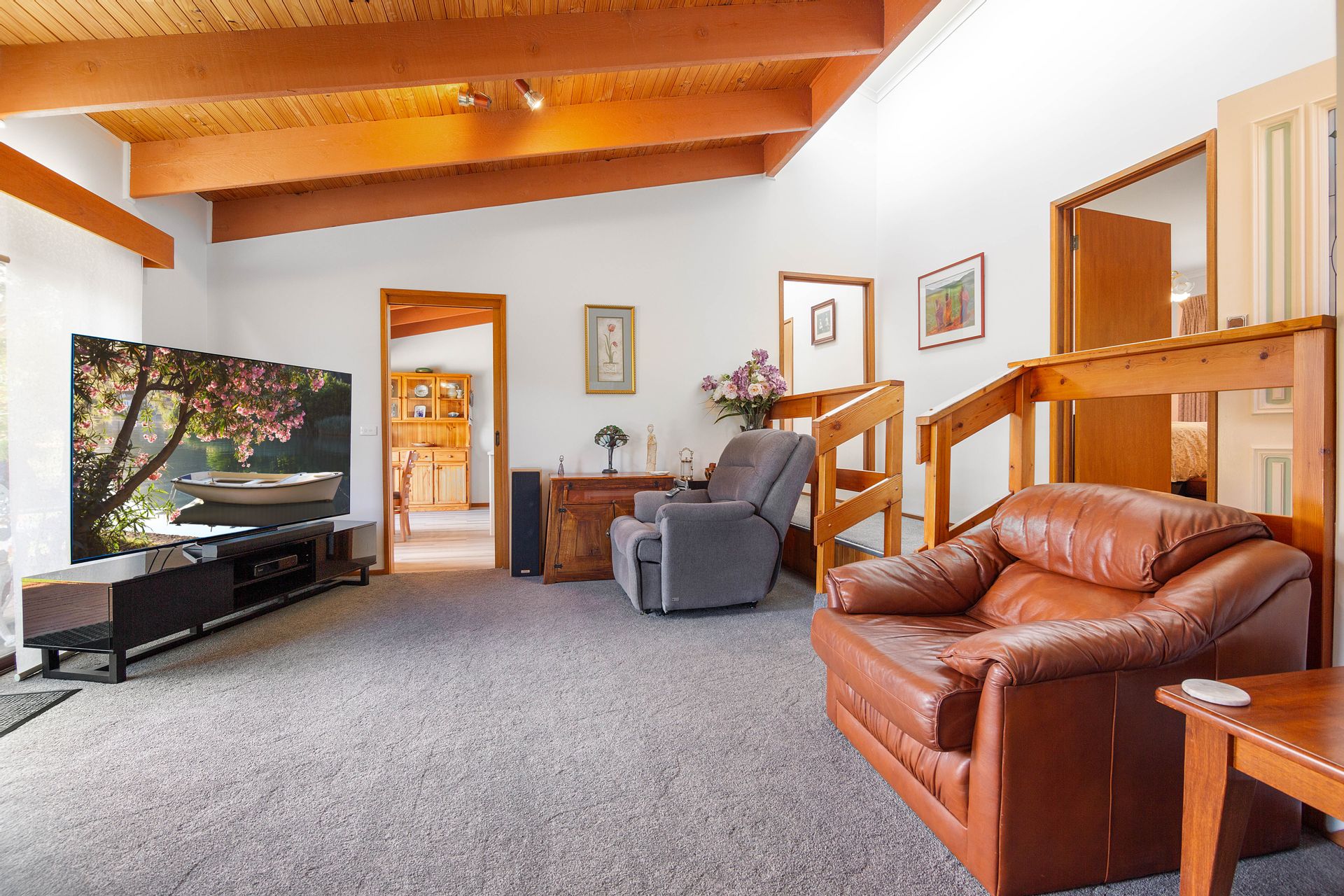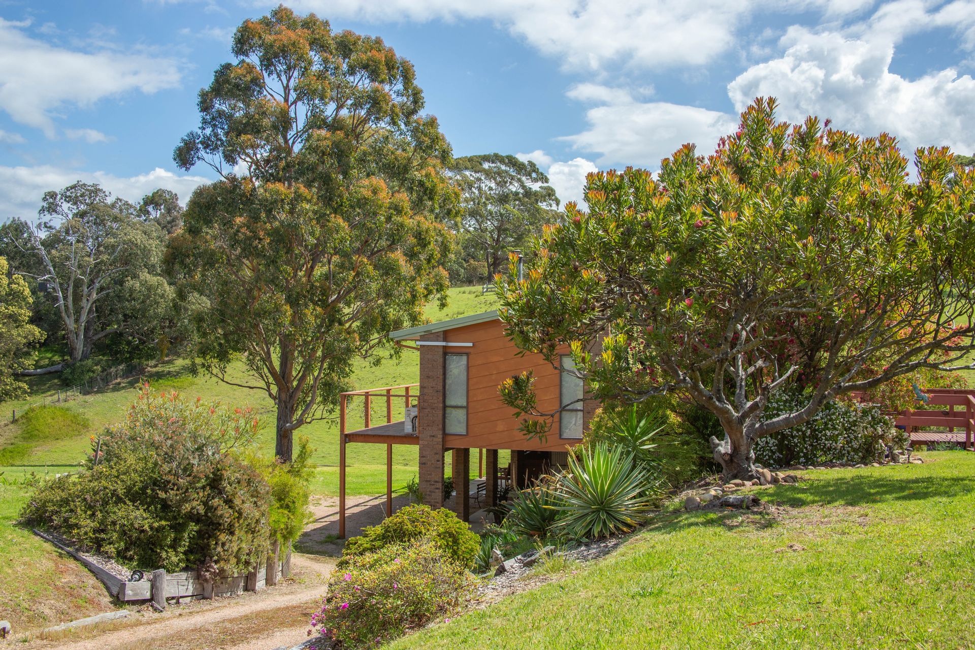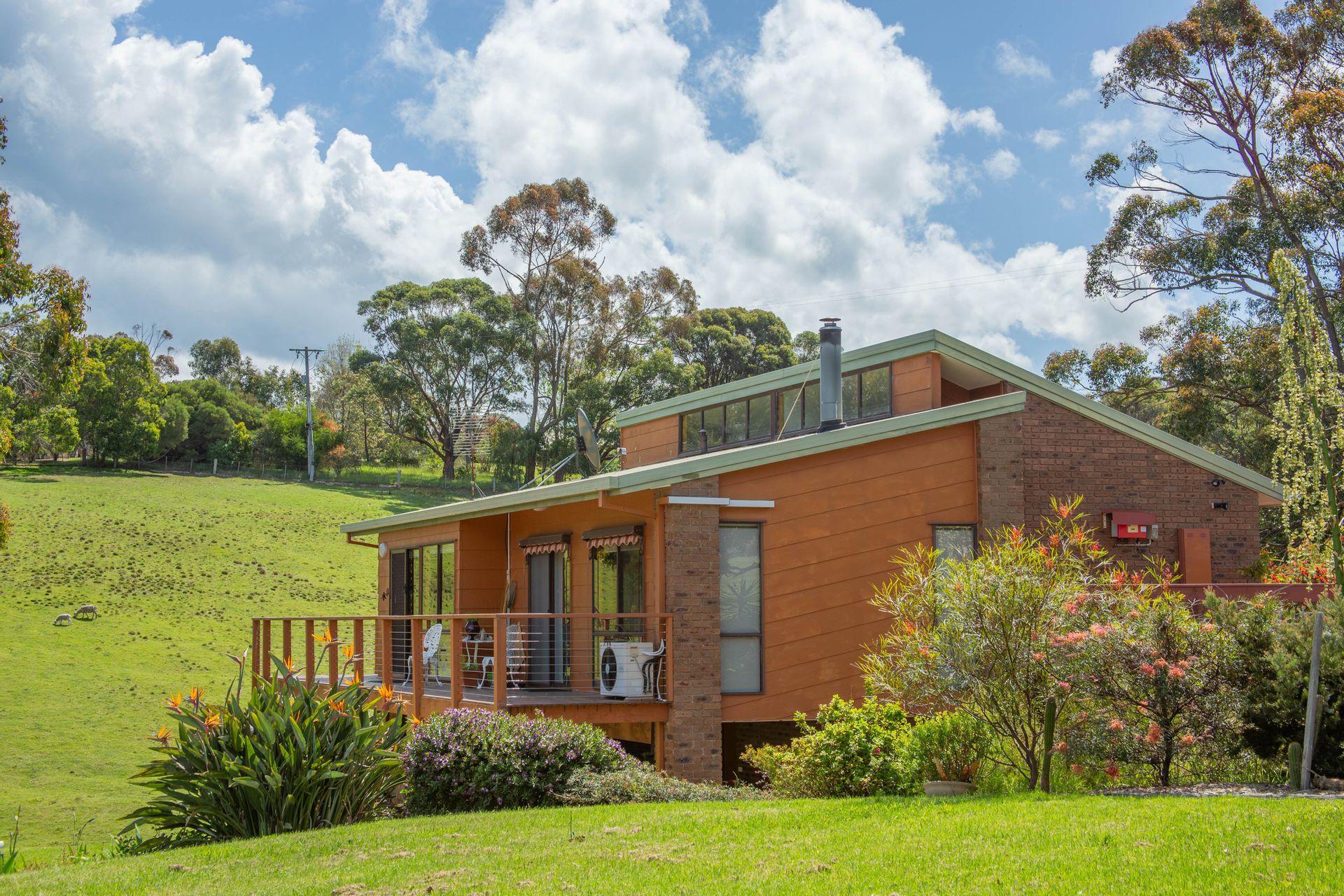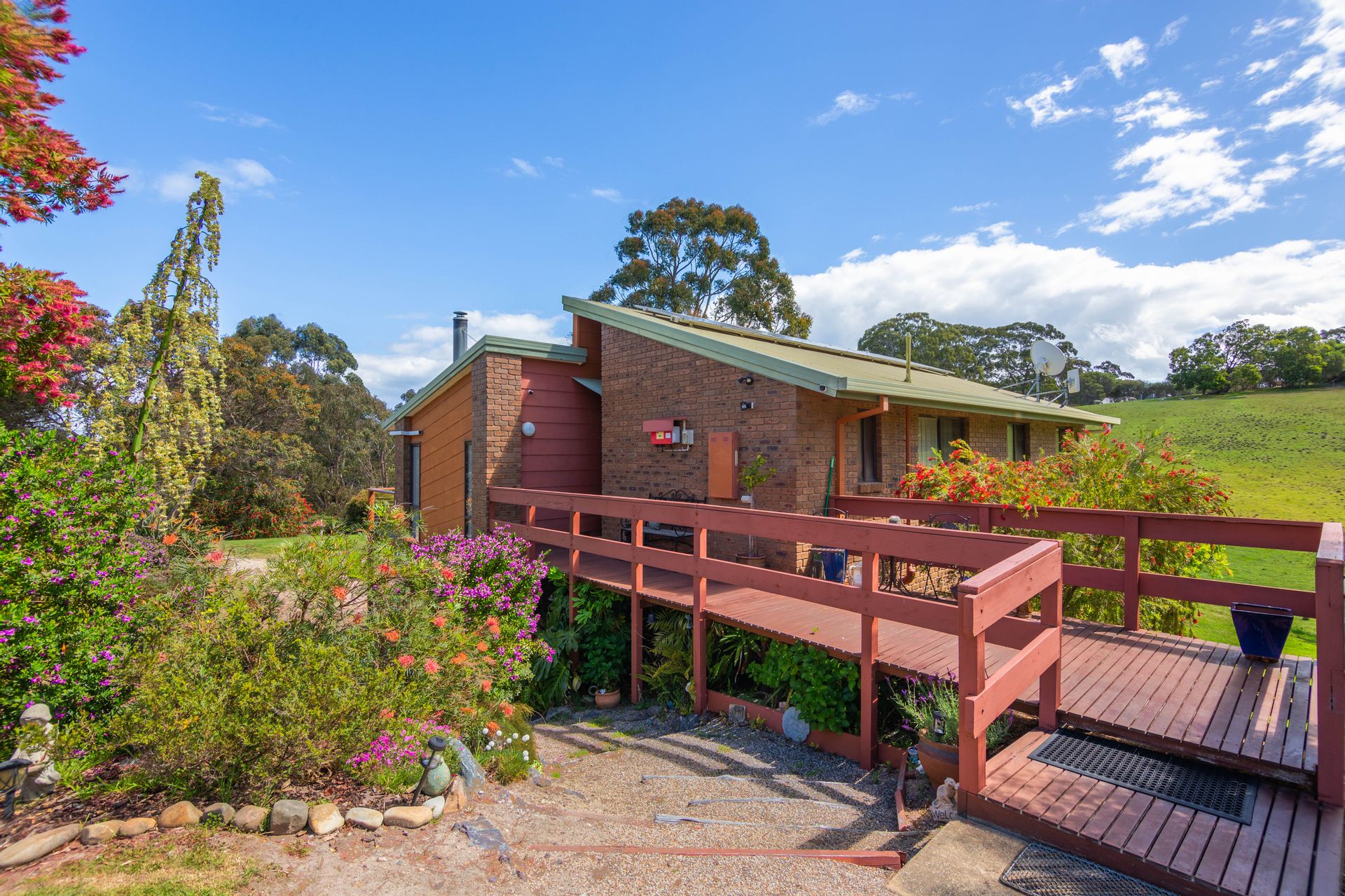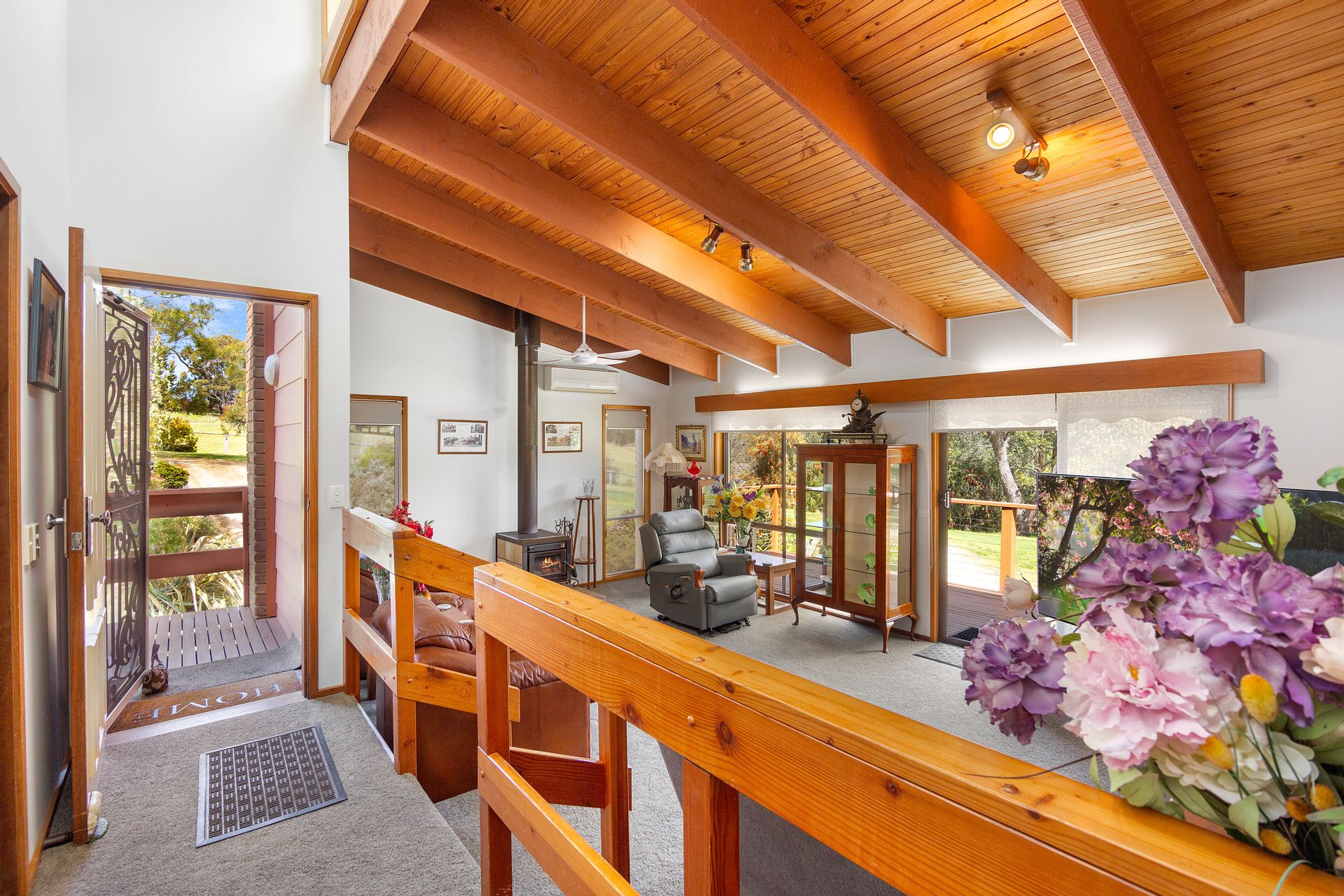 The dwelling is set well back from the entrance and positioned nicely into the landscape with the top level of the home boasting three bedrooms, the master with a new ensuite, a second bathroom, a generous living room, kitchen and dining with a separate study sewing room and third toilet. New carpet and vinyl plank flooring is complimented with some fresh paint through the home generating a very comfortable feeling and extending from the dining area a sliding door provides access to the balcony to take in the district surrounds. Heating and cooling is taken care of by the free standing wood heater and reverse cycle providing comfort in the changing seasons, and with the solar feedback helping offset electrical living costs.