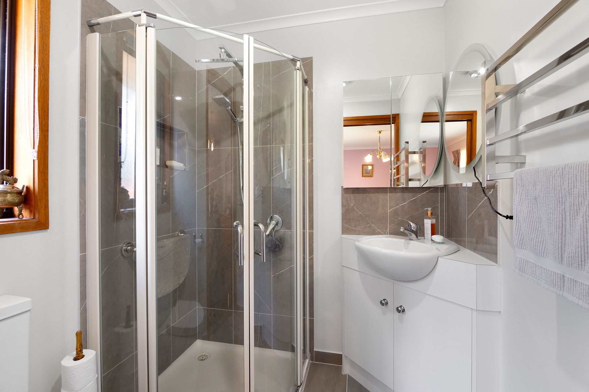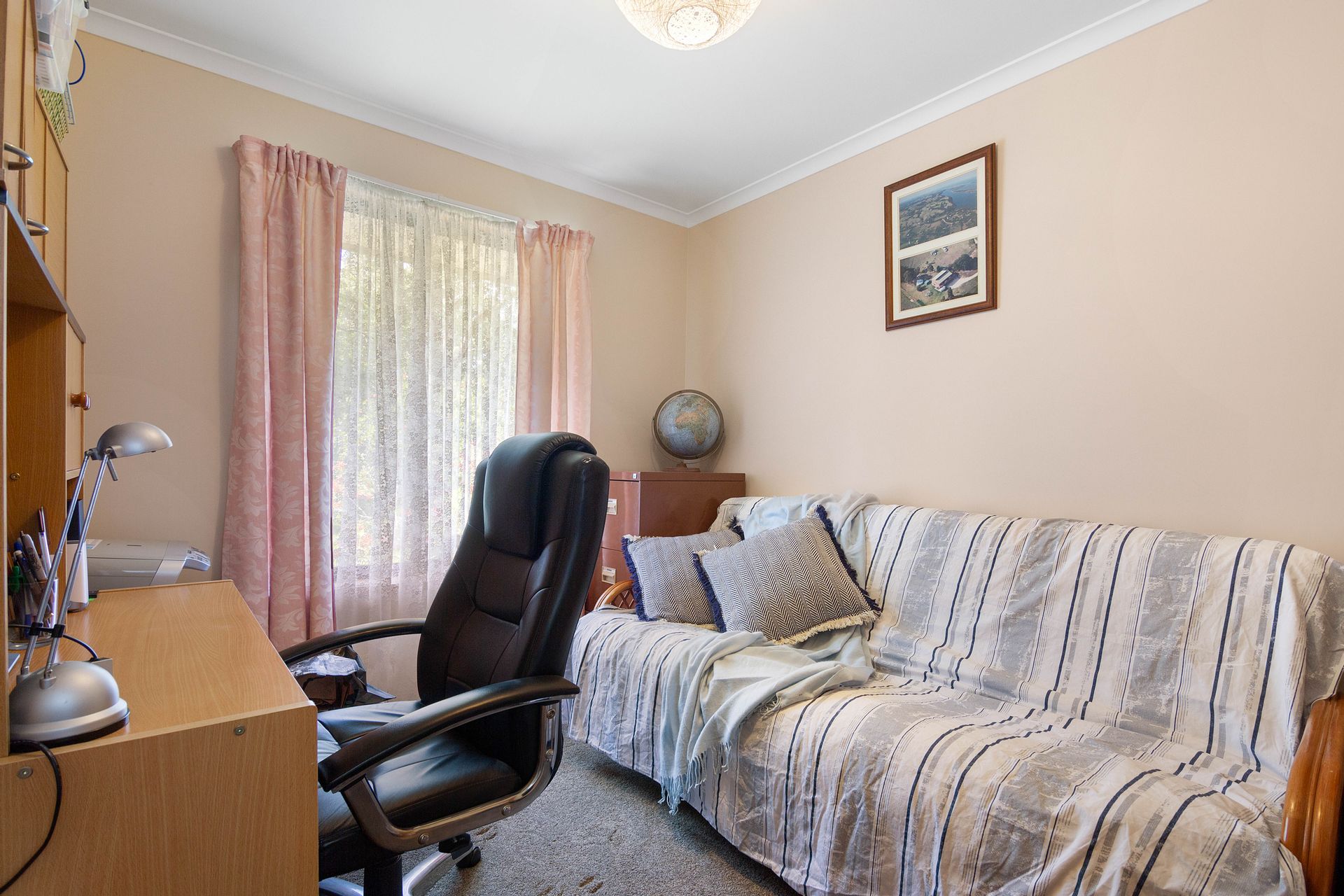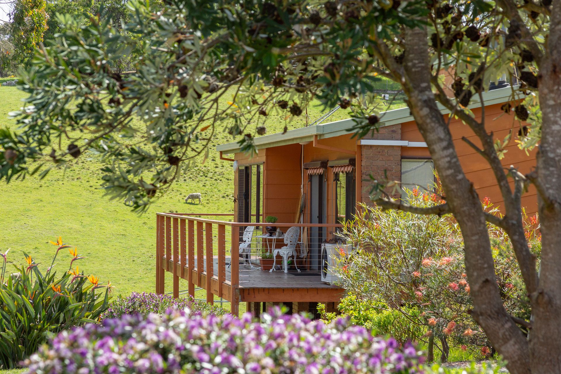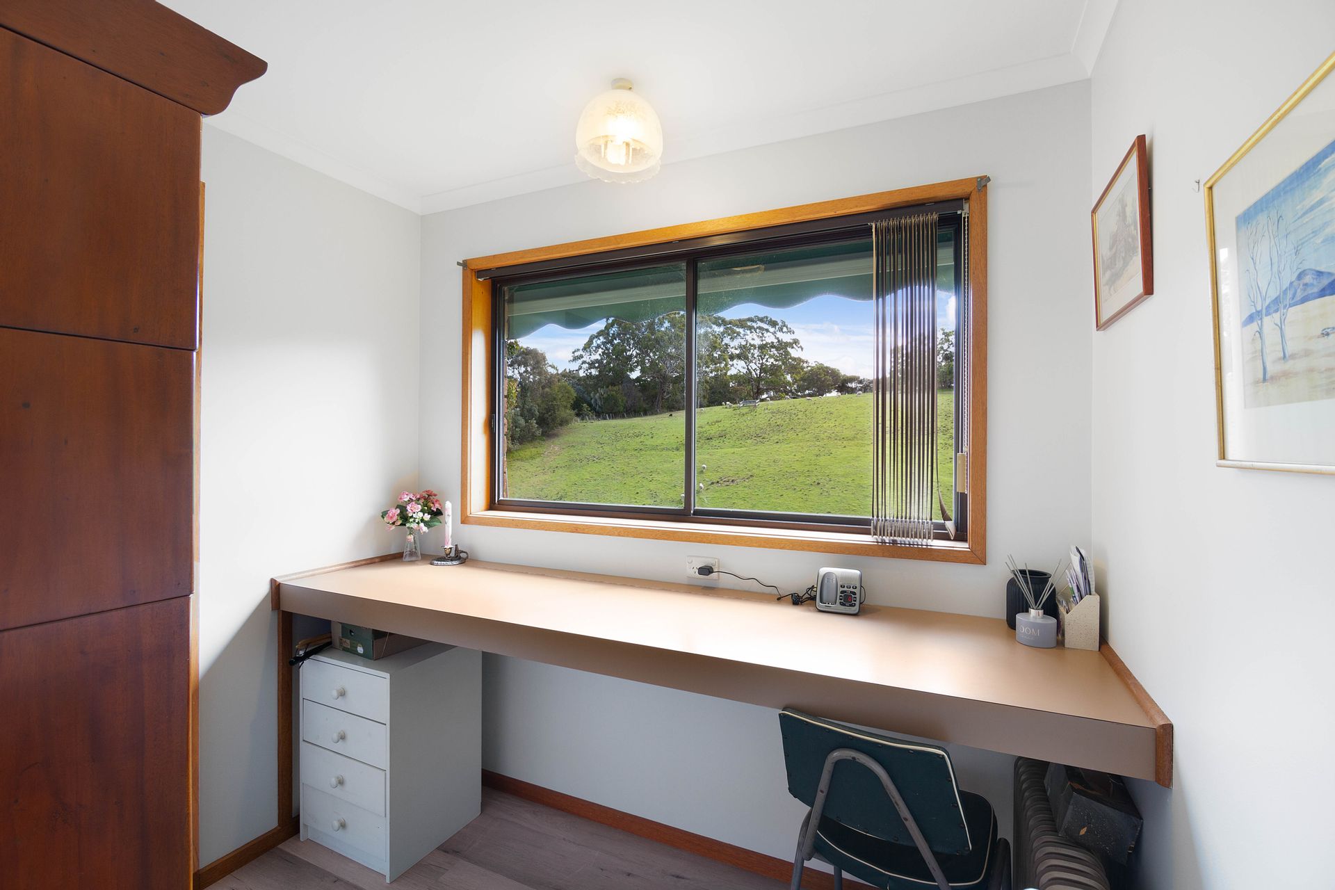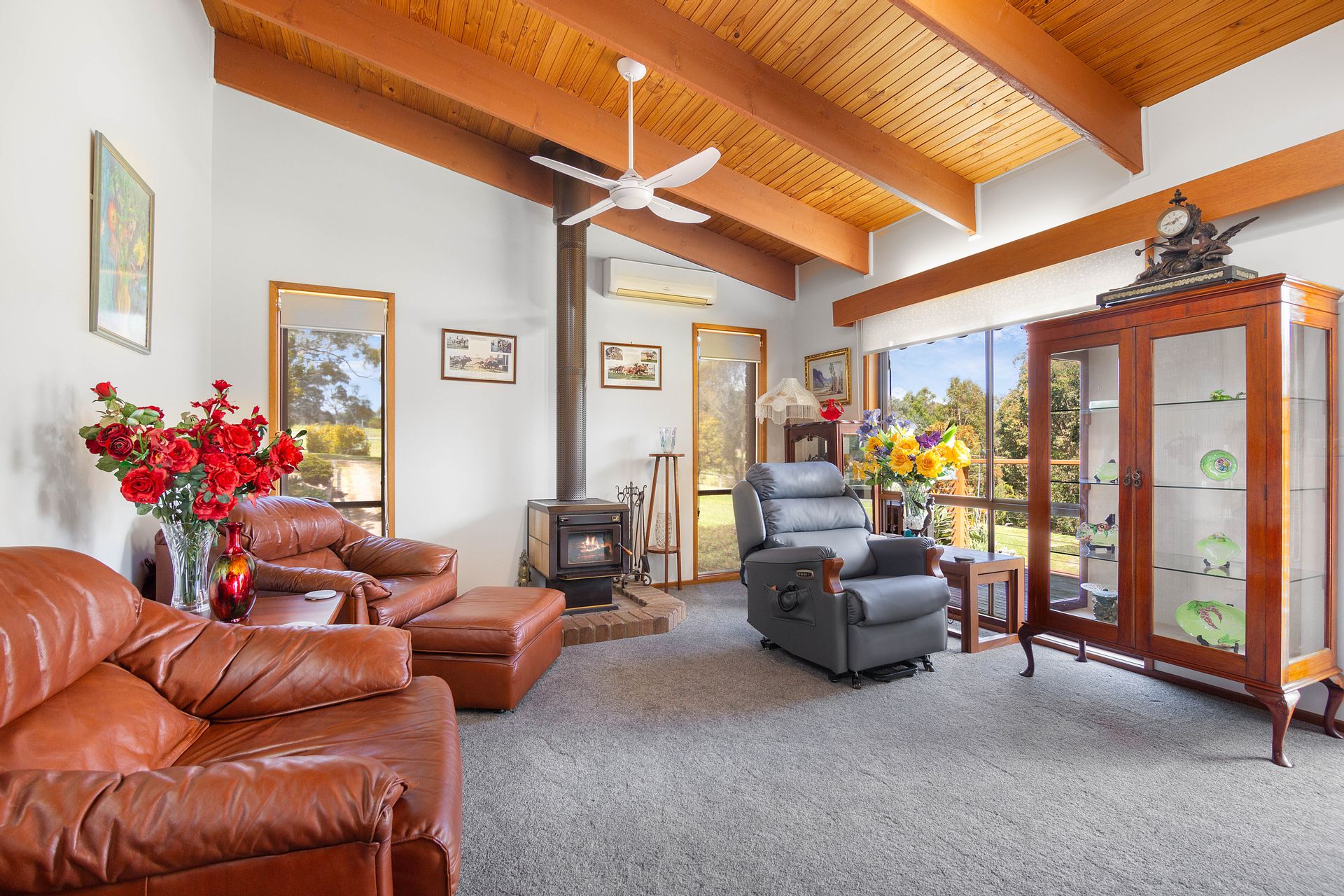 The dwelling is set well back from the entrance and positioned nicely into the landscape with the top level of the home boasting three bedrooms, the master with a new ensuite, a second bathroom, a generous living room, kitchen and dining with a separate study sewing room and third toilet. New carpet and vinyl plank flooring is complimented with some fresh paint through the home generating a very comfortable feeling and extending from the dining area a sliding door provides access to the balcony to take in the district surrounds. Heating and cooling is taken care of by the free standing wood heater and reverse cycle providing comfort in the changing seasons, and with the solar feedback helping offset electrical living costs.