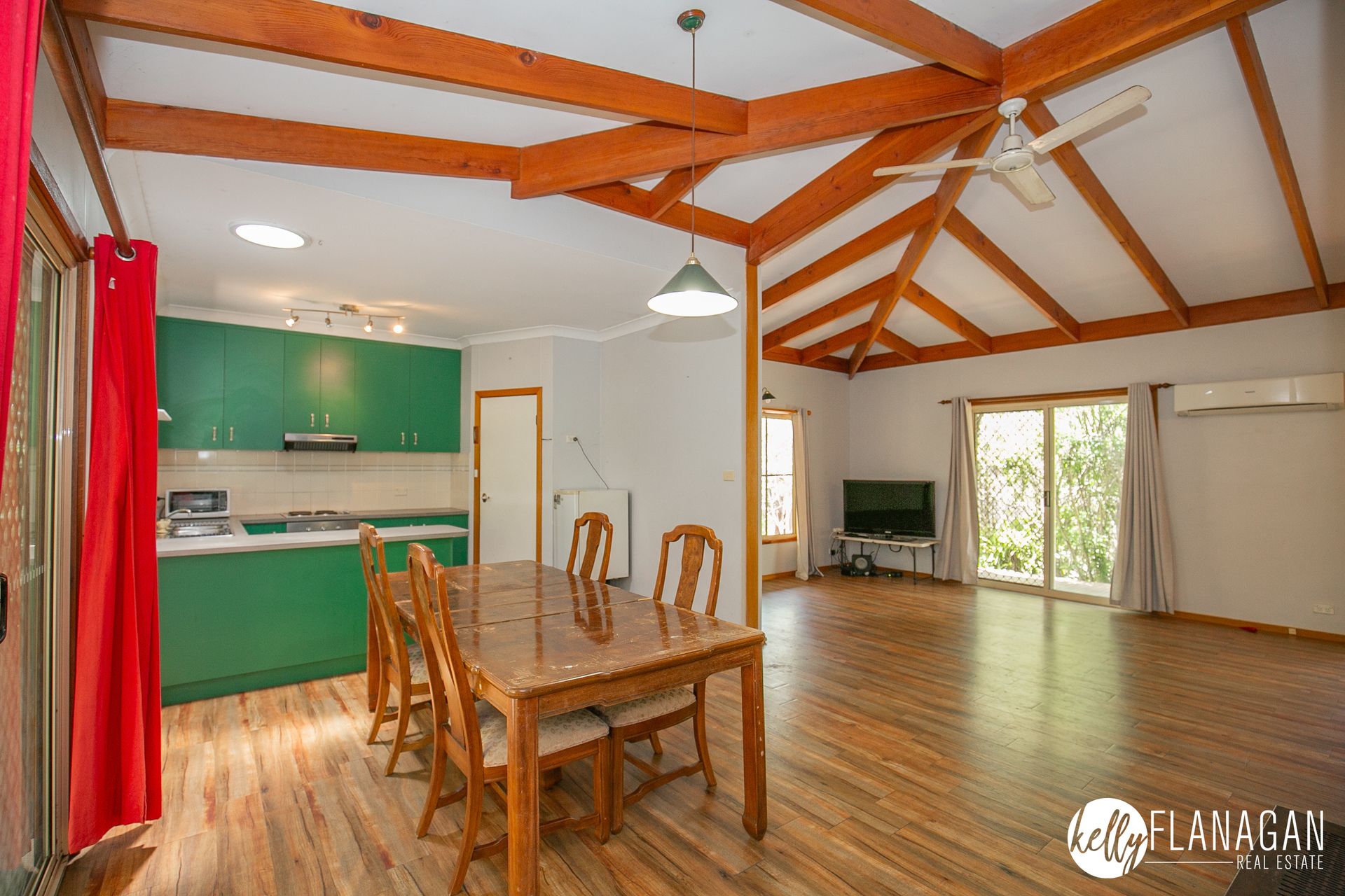 - Captivating open-plan living with high rakes ceiling and large glass windows and door bringing in a garden view.