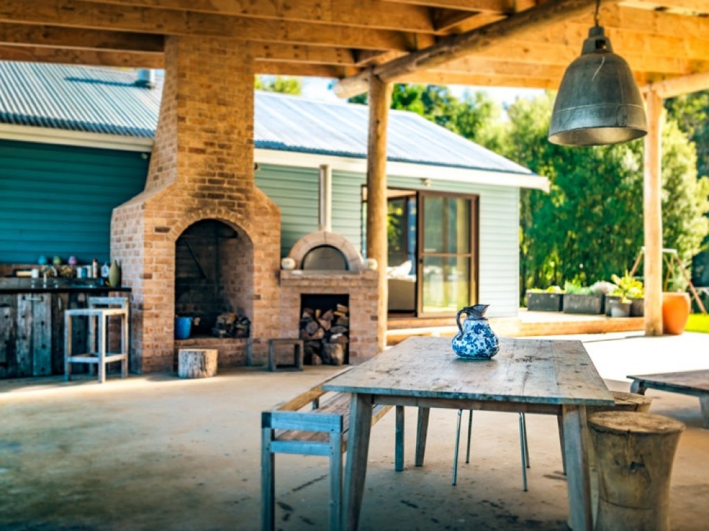 concrete floor, large pizza oven plus outdoor fireplace, bench and sink for food preparation.