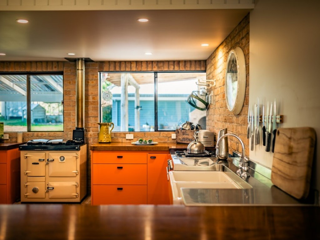 throughout the house, a separate gas cooktop, gas and electric ovens. large timber bench top, separate pantry.