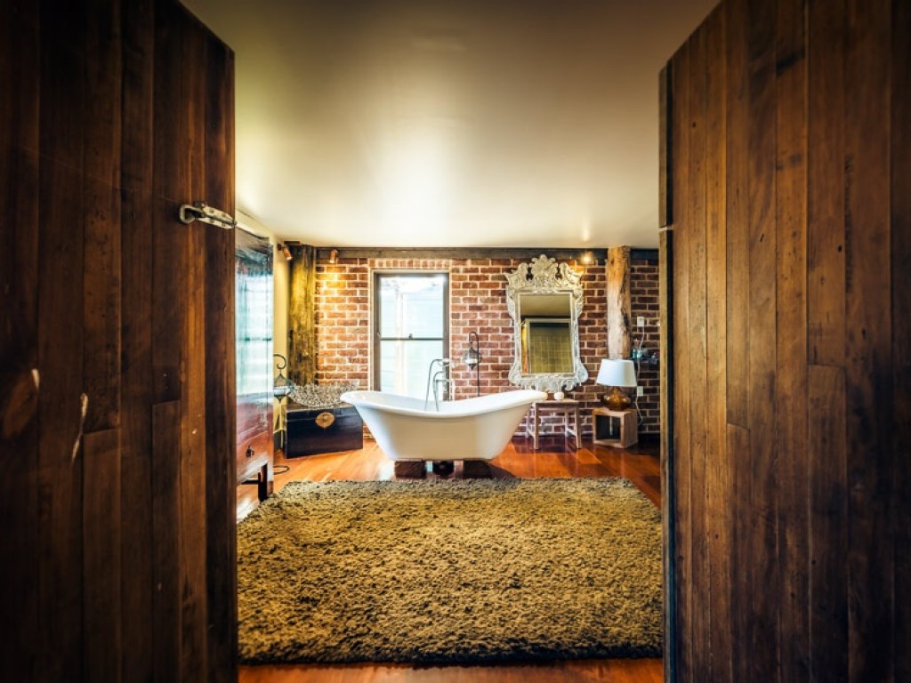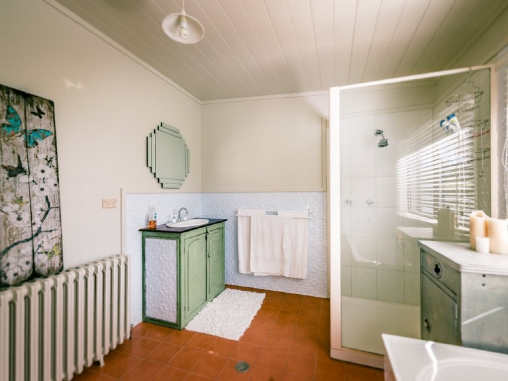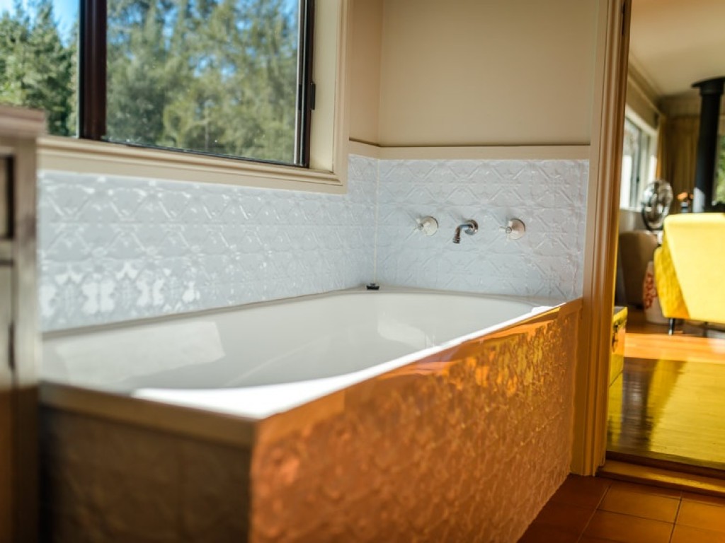 leading into a dream bathroom featuring a gorgeous claw foot bath looking out to the paddocks and beyond, large
