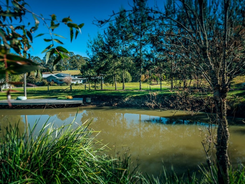 * A tree lined driveway past a waterhole with timber pontoon takes you to the expansive lawn and garden area with a