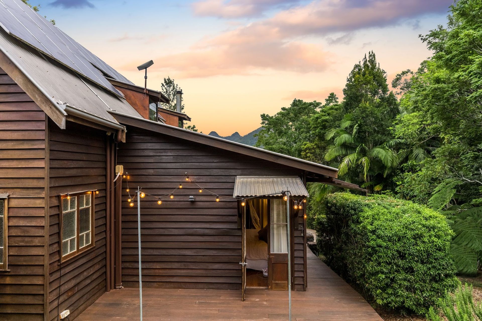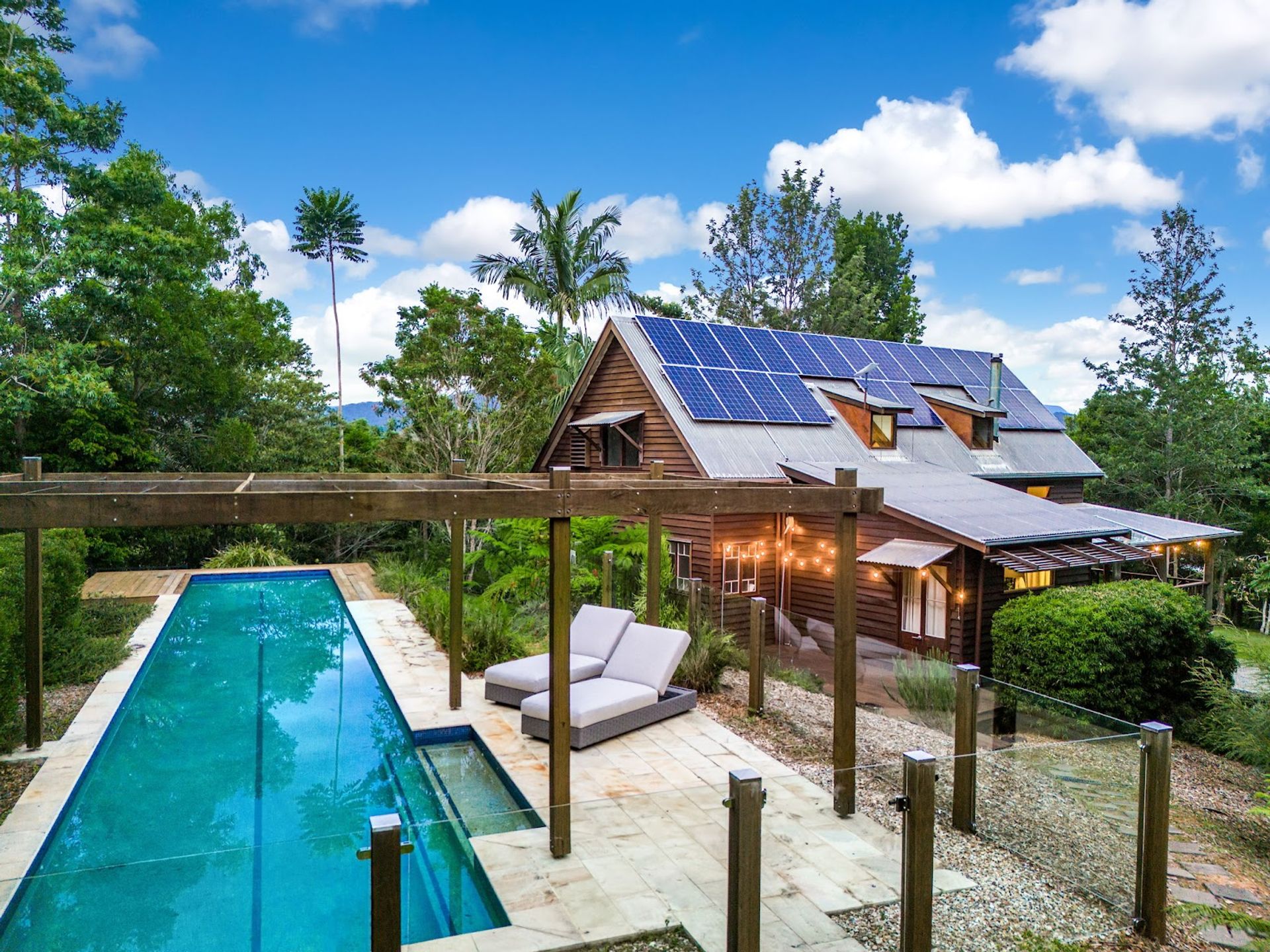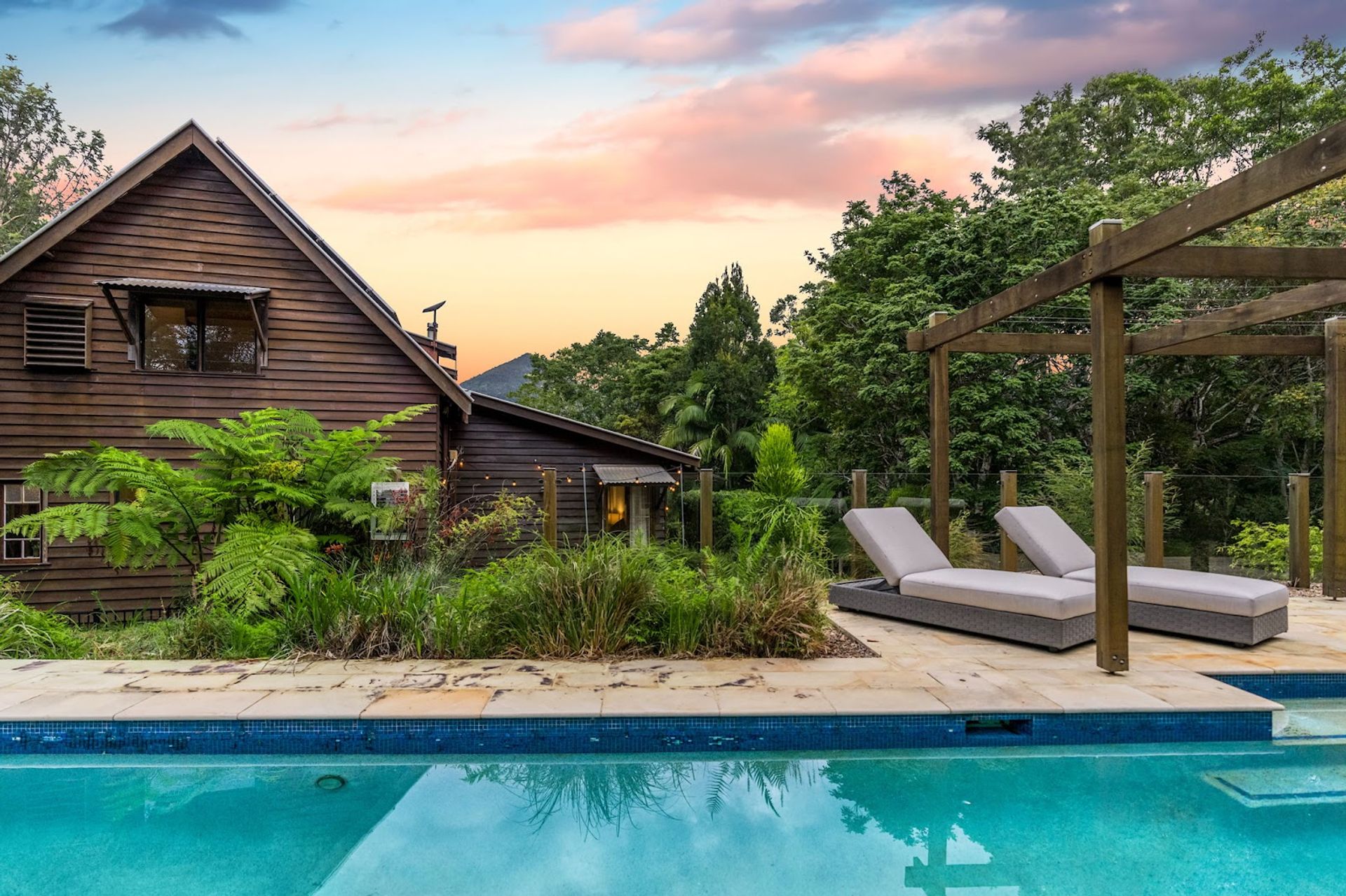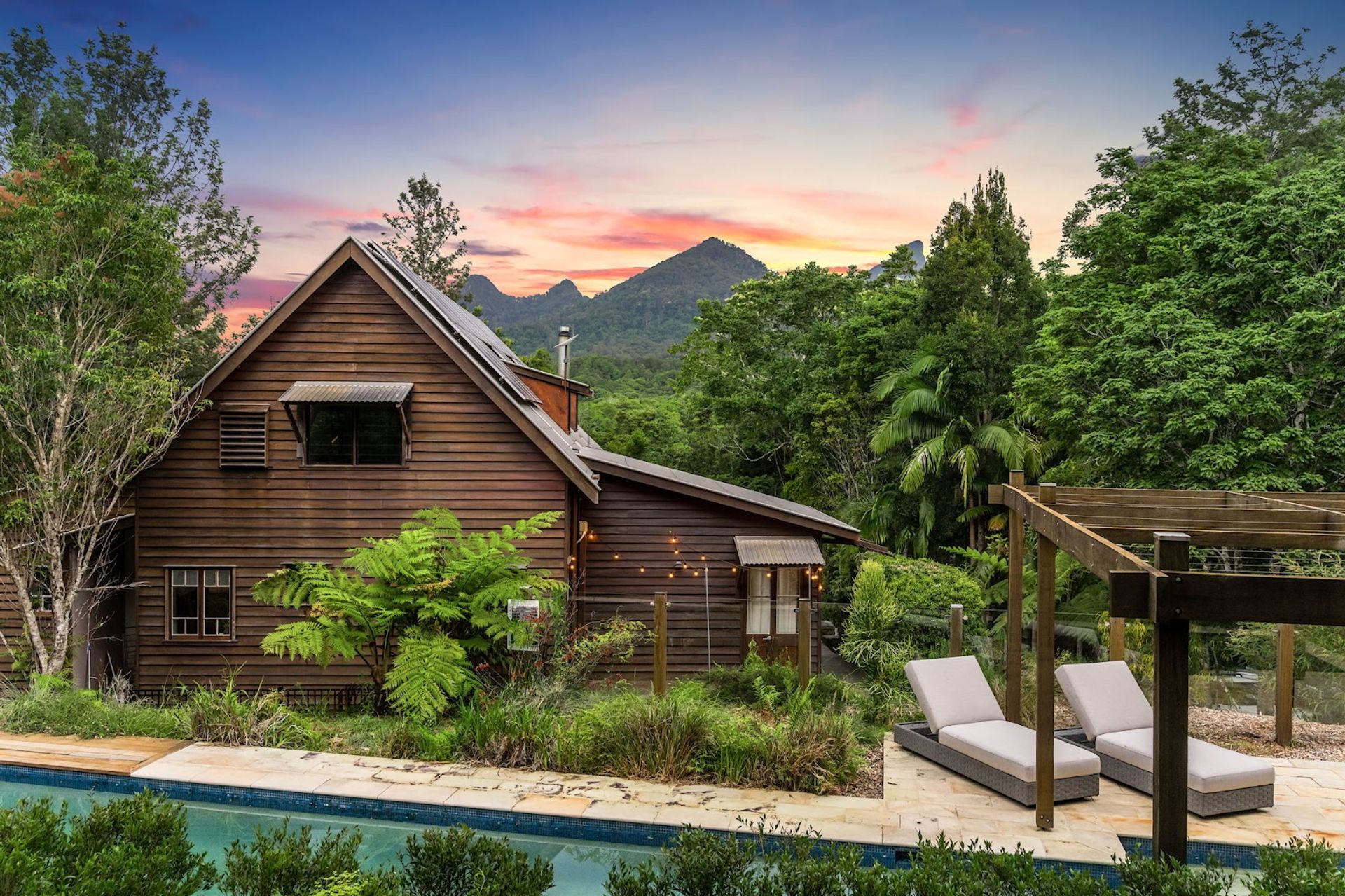 You will love coming home to this high set quality built timber home, situated tucked away on its very own 7+ acre sanctuary in nature at the top of a ridge just minutes to Uki village. There is a feeling of peace and serenity in this home with its wrap around deck affording a stunning vantage point to view magical Wollumbin (Mount Warning) in all its glory and its ever changing moods. Upon awakening after a restful sleep you will hear the sounds of birdsong as the morning mists rise to give way to a new day and a sun drenched vista in every direction. If a morning swim is your thing then the 18mtr lap pool is beckoning...what a way to start your day! Your rainforest gardens are an allure to the abundance of wildlife here including the resident black wallaby ("Wally") and a plethora of birds, including kookaburras, black and white cockatiels and rosellas. Take an afternoon walk on the rainforest path near the creek and enjoy some of your orchard harvest as you head back up the path to perhaps have an afternoon or early evening swim under the stars. This is a call to nature lovers who will feel a million miles away from the madding crowd yet still be handy to local amenity including the bustling Northern Rivers arts and food scene of Murwillumbah and the Gold Coast international airport.