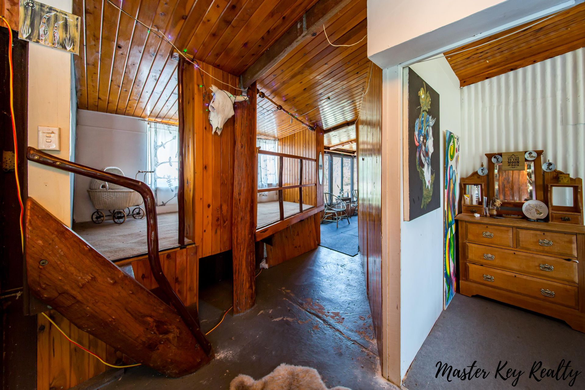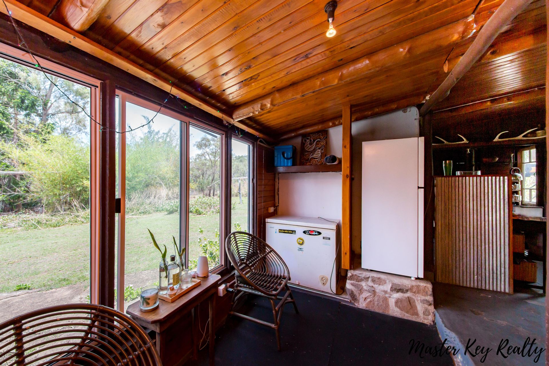 • Rustic Details: Exposed brick and timber give this custom-built home a log cabin feel, making you feel right at home with nature. The home features a large lounge room with exposed log beams, wood panelling, a wood fire, and air-conditioning in the living area, along with an indoor garden that brings nature indoors.