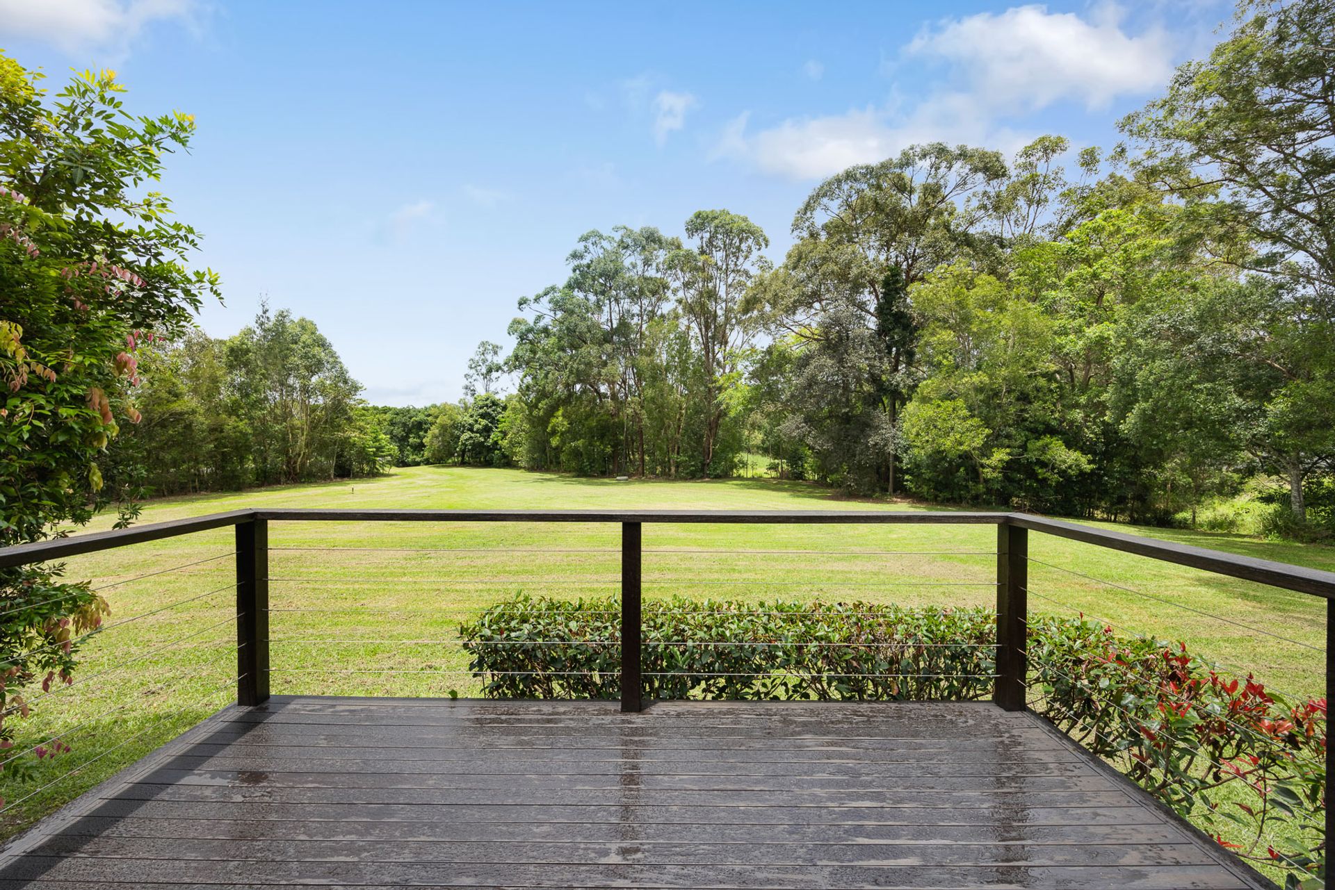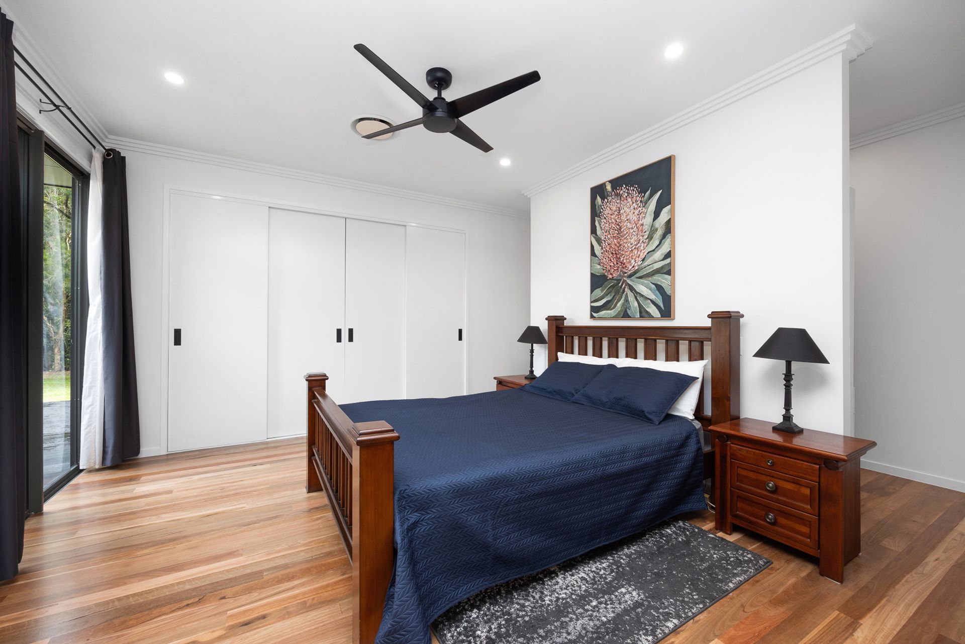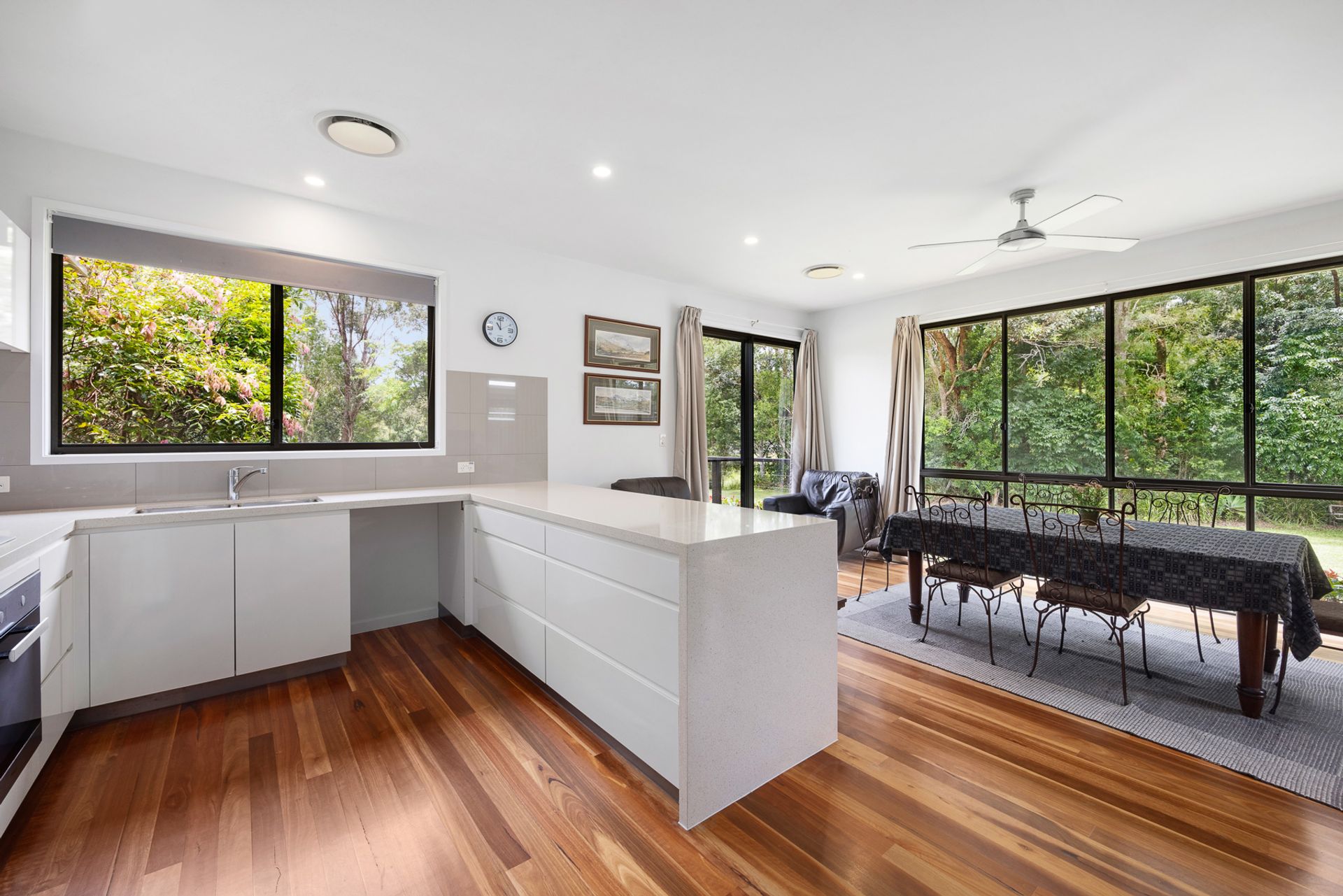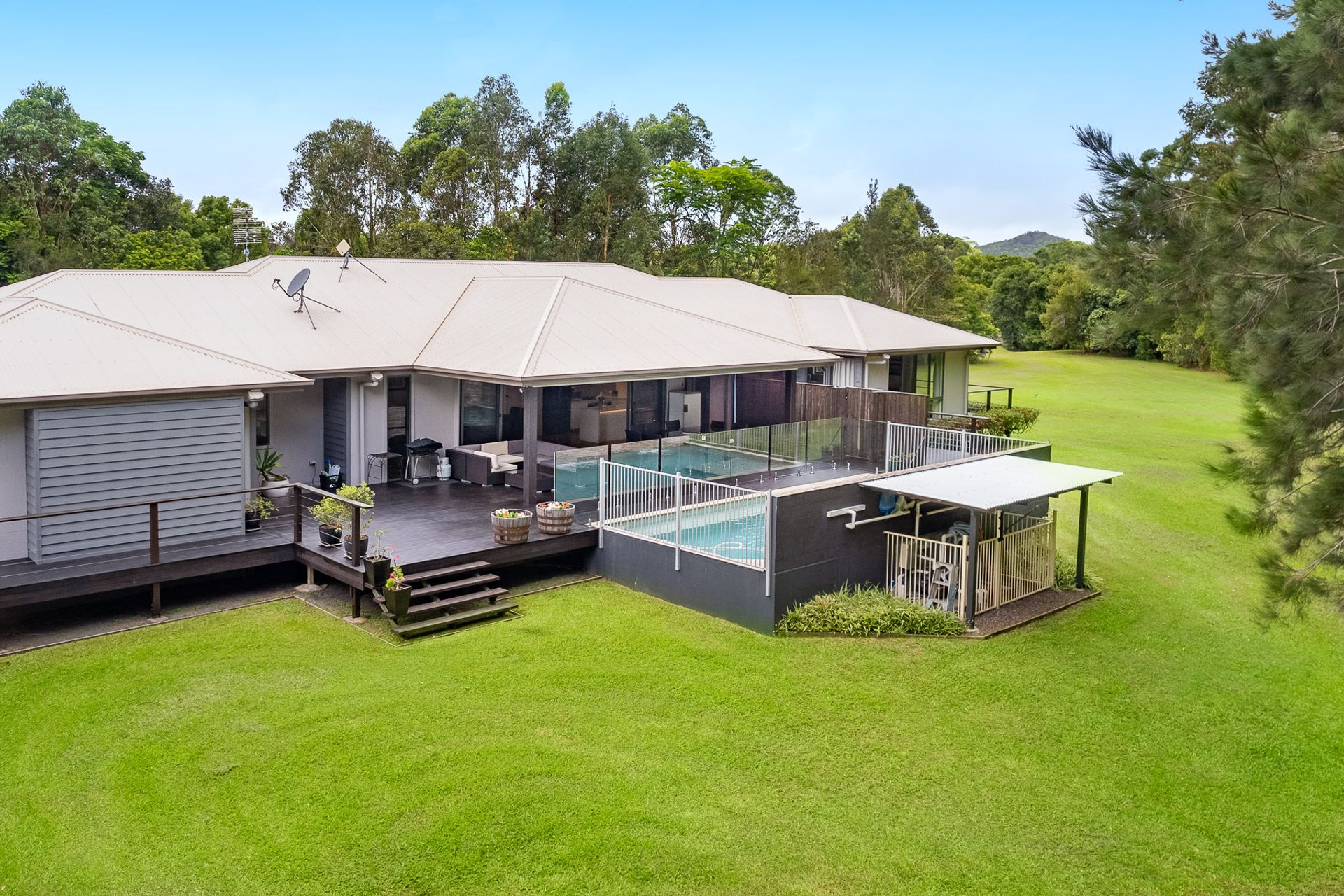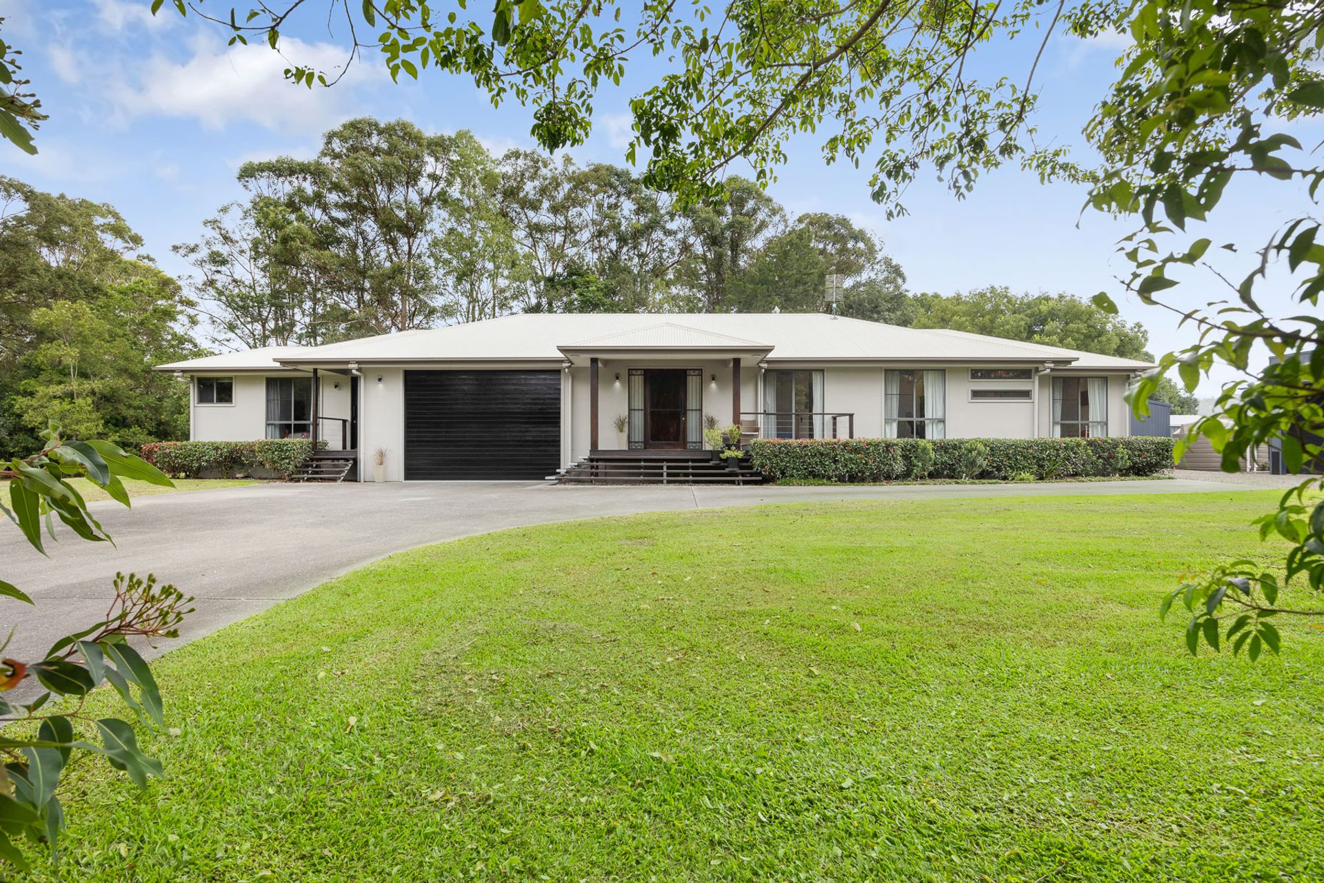 Whether you're seeking to run a home-based business, accommodate extended family, or enjoy peace and privacy with plenty of space (and no neighbours), this stunning property fits the bill. With 5.6 level acres, dual living and abundant infrastructure, the options here are near limitless. A wide coloured concrete driveway leads to the impressive main residence, which embodies understated elegance. Your first impressions of space and contemporary style are carried throughout, with soaring raked ceilings, genuine Australian hardwood floors in the living areas and main bedroom, ducted air-conditioning, fans, and high windows and doors to capture the lush green outlook from every room.