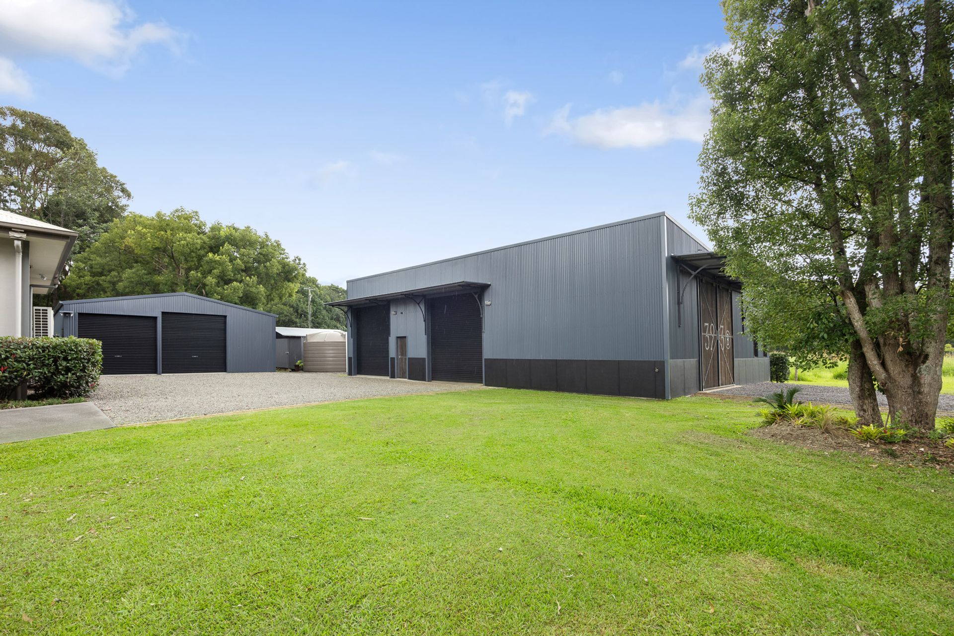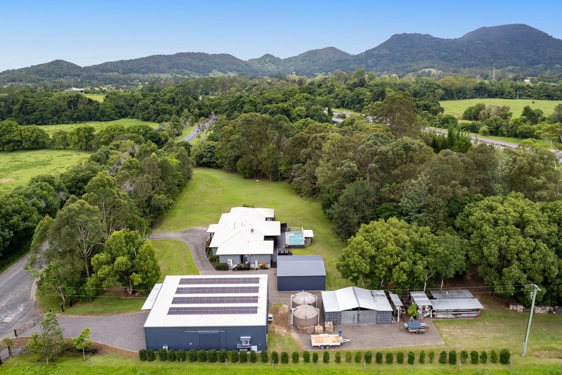 There is more infrastructure on the property than can be listed here, but the 14 x 18 m fully insulated shed is a standout, with 3-phase power, vehicle hoist, overhead 2 tonne capacity gantry crane system, LED lighting, a separate room with 3-phase fume extraction system, and feature barn doors suitable for semi-trailer access (with separate gated driveway access appropriate for semi-trailers). There's also a 9 x 9 m shed with LED lighting and power, several shipping containers, a 20 kw solar system with 3-phase inverter capable of returning 15 kw per hour to the grid, fenced paddocks suitable for livestock, multiple hardstand areas, and a Biocycle sewerage treatment system. Water should always be plentiful with 2 x 7,500-gallon water tanks and pump, a tree-lined creek and large dam.