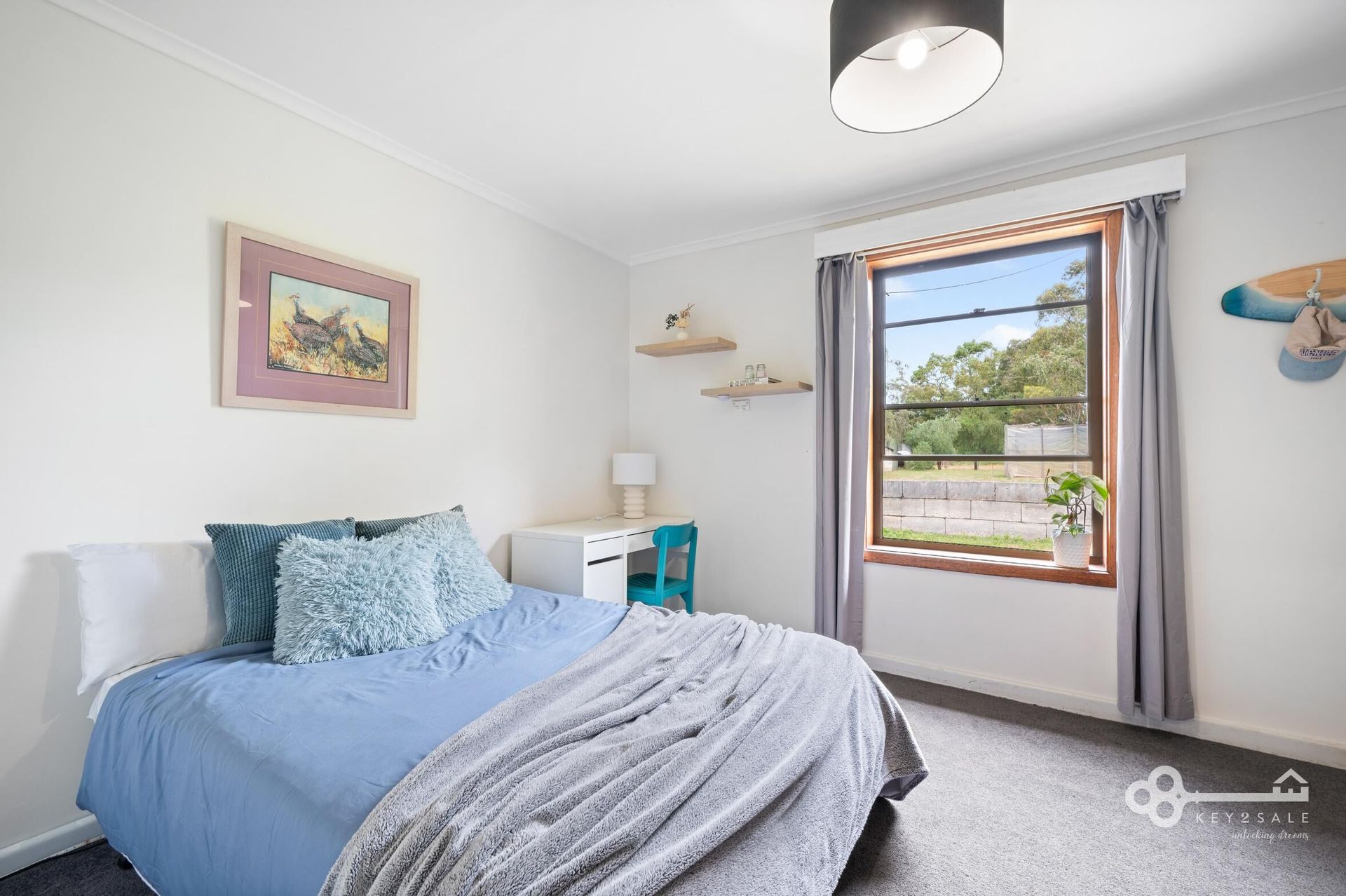 The home includes a large main bedroom, a cozy single bedroom, and two additional spacious bedrooms with heat shifters for year-round comfort. A study or craft room provides a quiet space for productivity or creativity, while the main bathroom offers a shower-over-spa bath, vanity, and separate toilet plus a functional laundry.