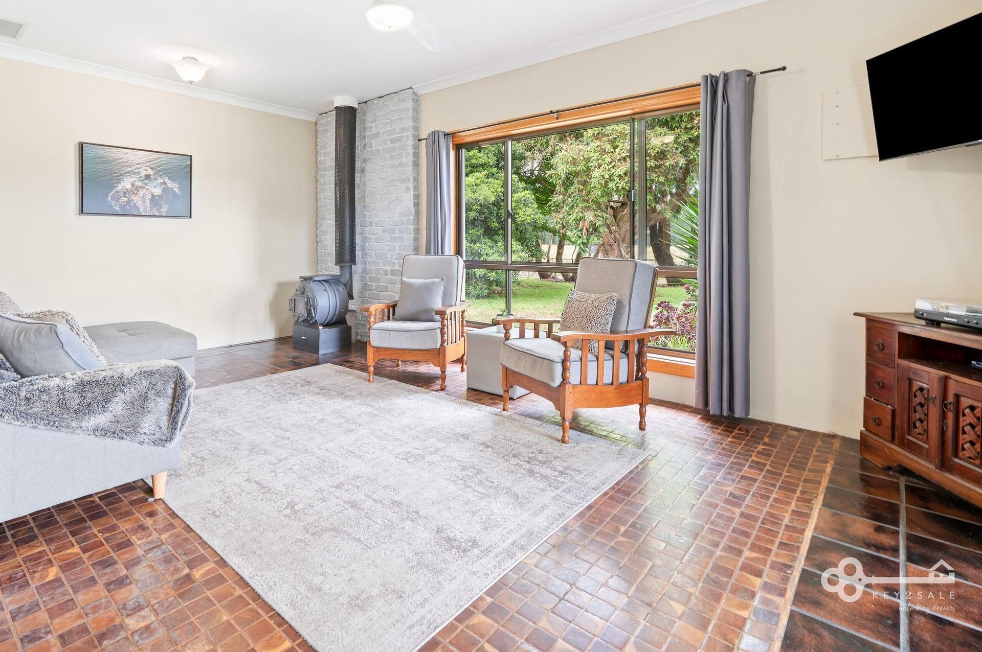 The home features a spacious lounge with a wood-fire potbelly stove, offering warmth and comfort throughout the cooler months. Sliding doors lead to the alfresco area, ideal for enjoying morning coffee or hosting friends amidst the serene surroundings. The enclosed sunroom is a standout feature, perfect for enjoying the outdoors in all weather. Picture yourself hosting BBQs, relaxing with a book, or simply soaking in the peaceful rural ambiance.