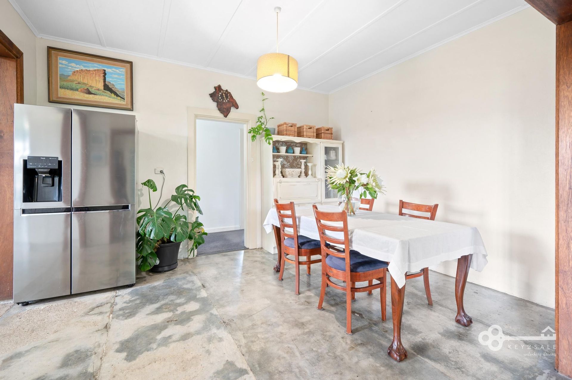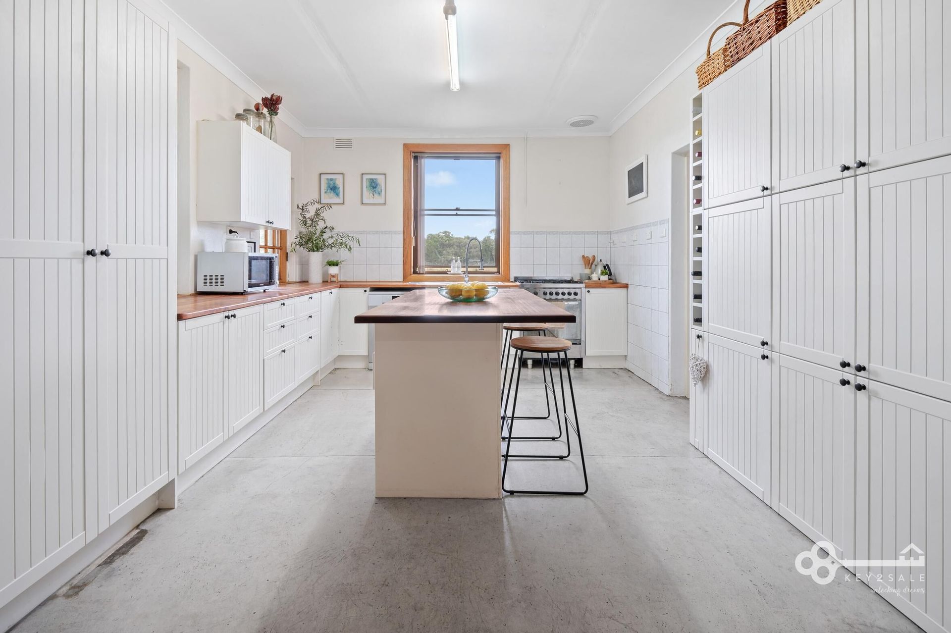 At the heart of the home lies a light-filled, country-style kitchen. Beautiful timber benchtops and crisp white cabinetry add a touch of elegance and warmth to this inviting space. With gas cooking, a double sink, dishwasher, and a central island bench, it's designed for culinary creativity and family gatherings. The kitchen flows seamlessly into the open-plan dining area, where polished concrete floors add a touch of rustic charm.
