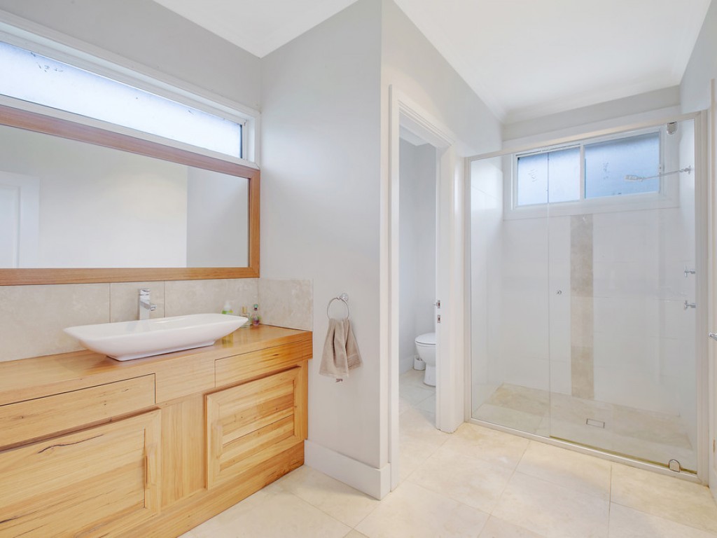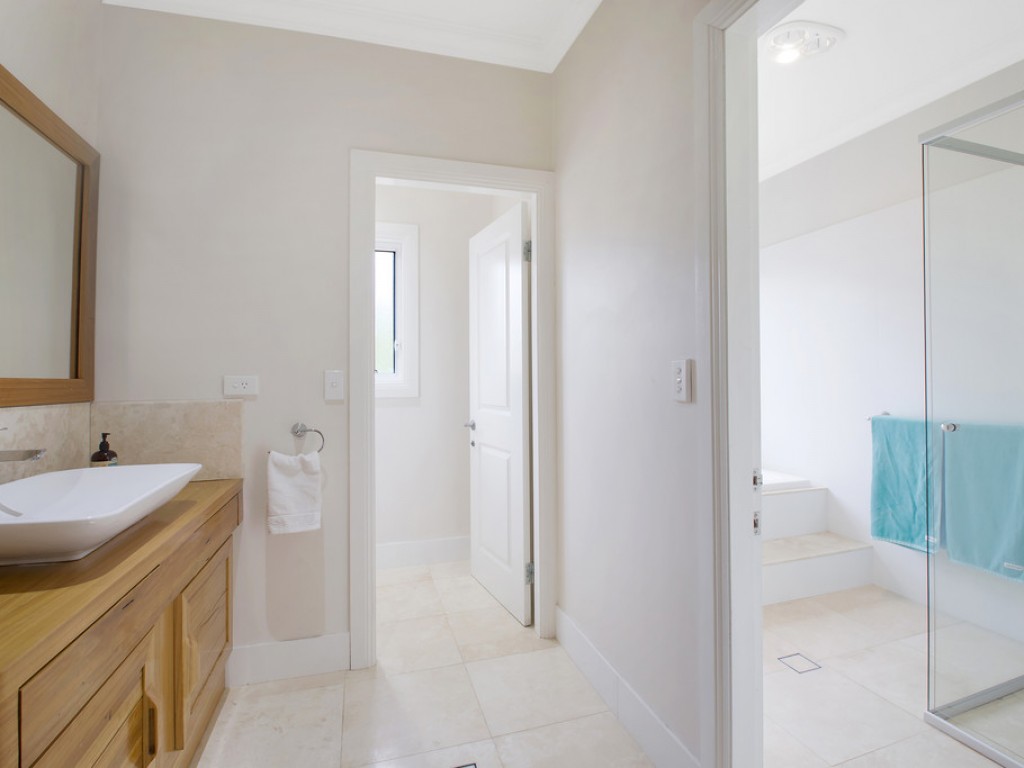 * Main bathroom with bath, shower, vanity & toilet