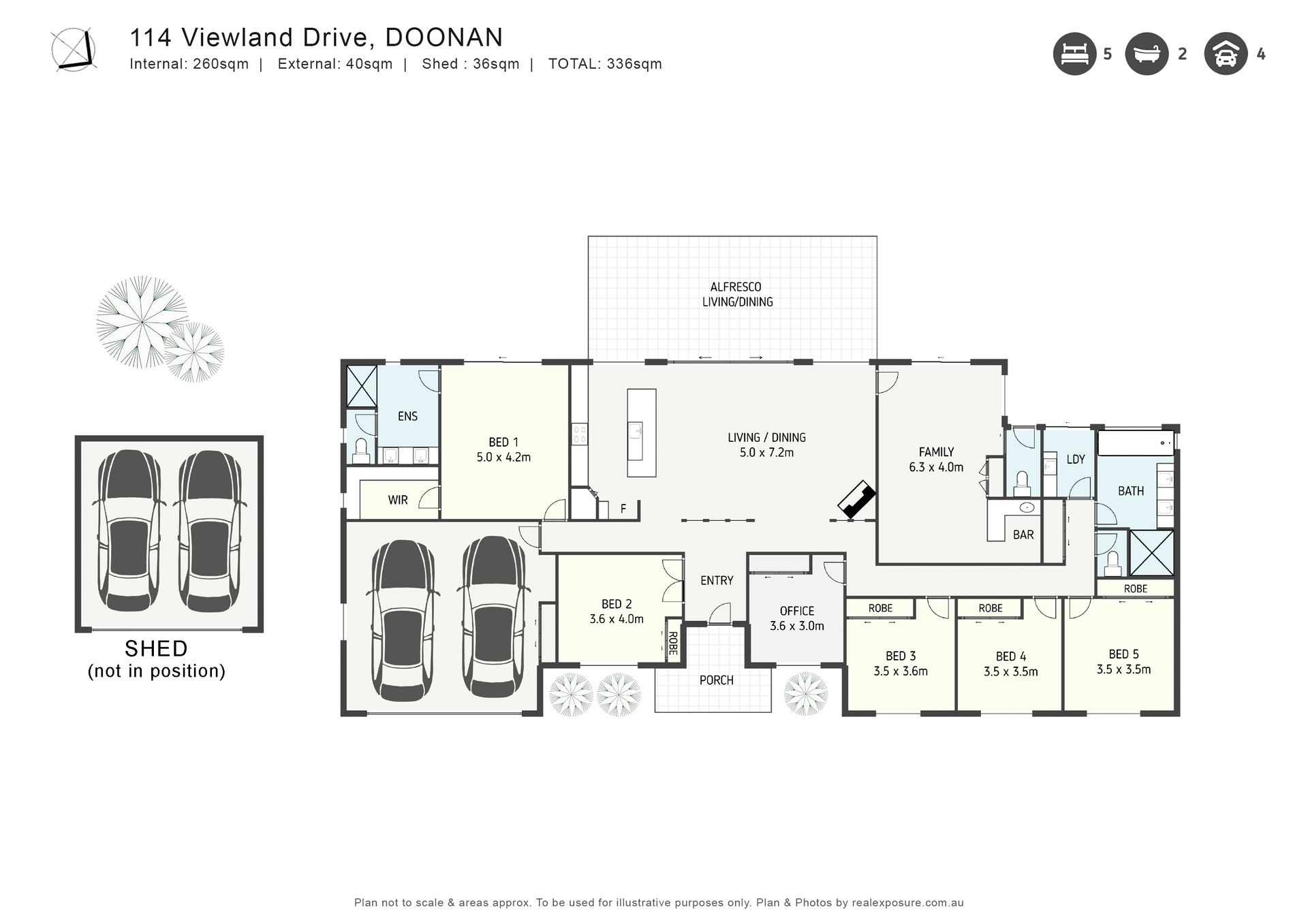• Covered outdoor entertaining area, 2-bay 6m x 9m powered shed