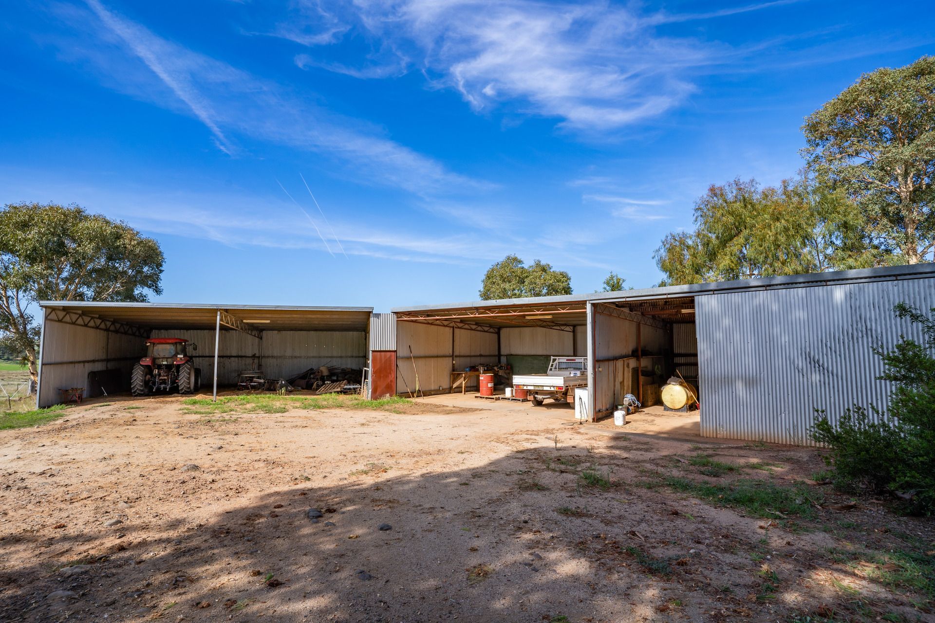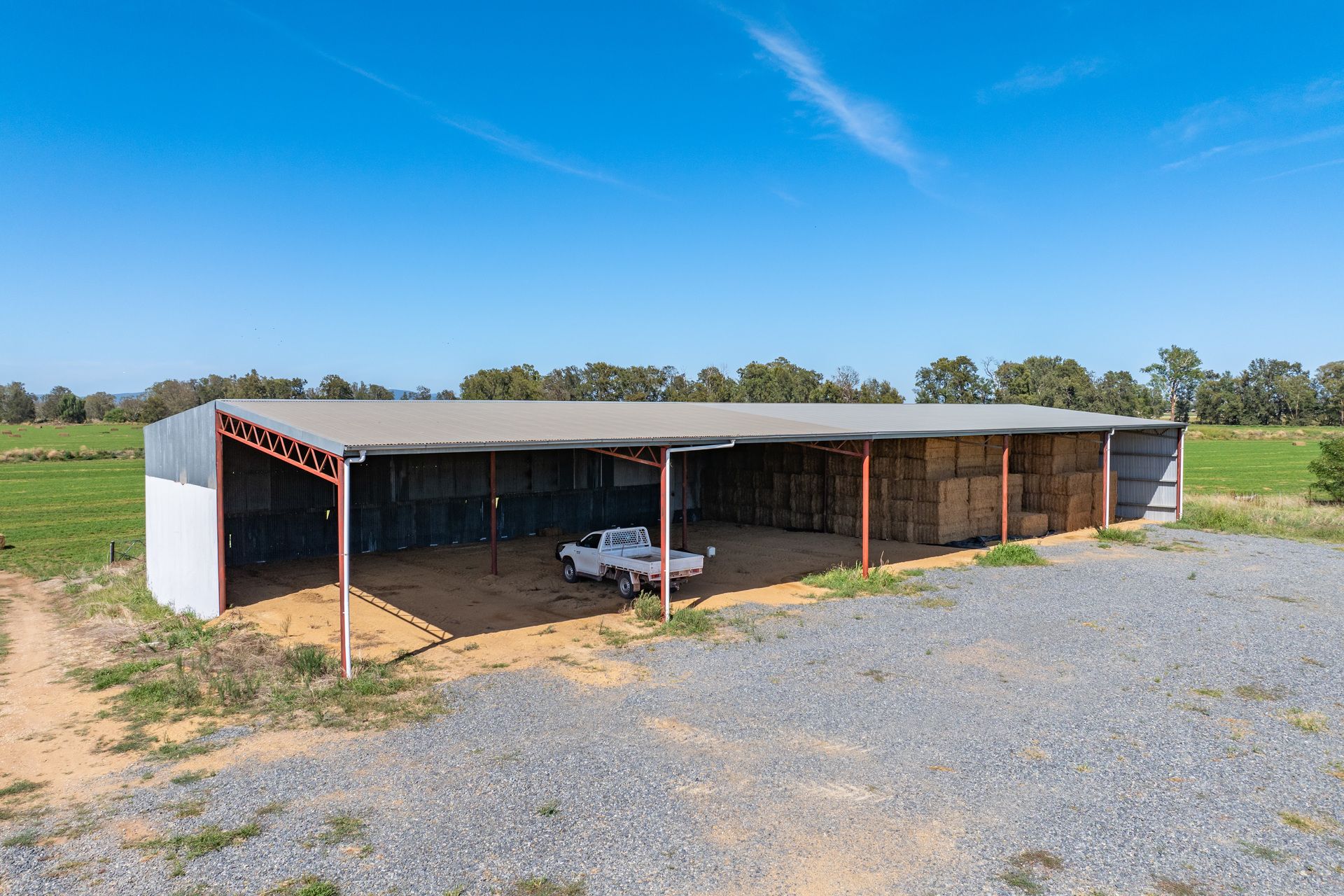 + Sheds - 4 bay concrete floor shed with divider with lights and power, 2 bay shed, with overhead lighting, 5 bay hayshed (975 large bale storage)