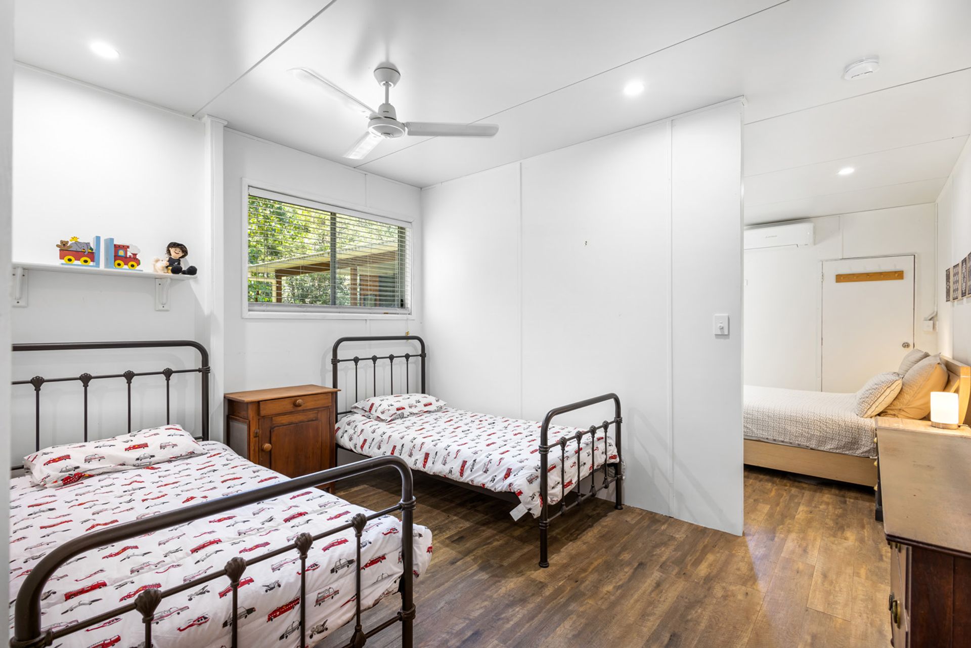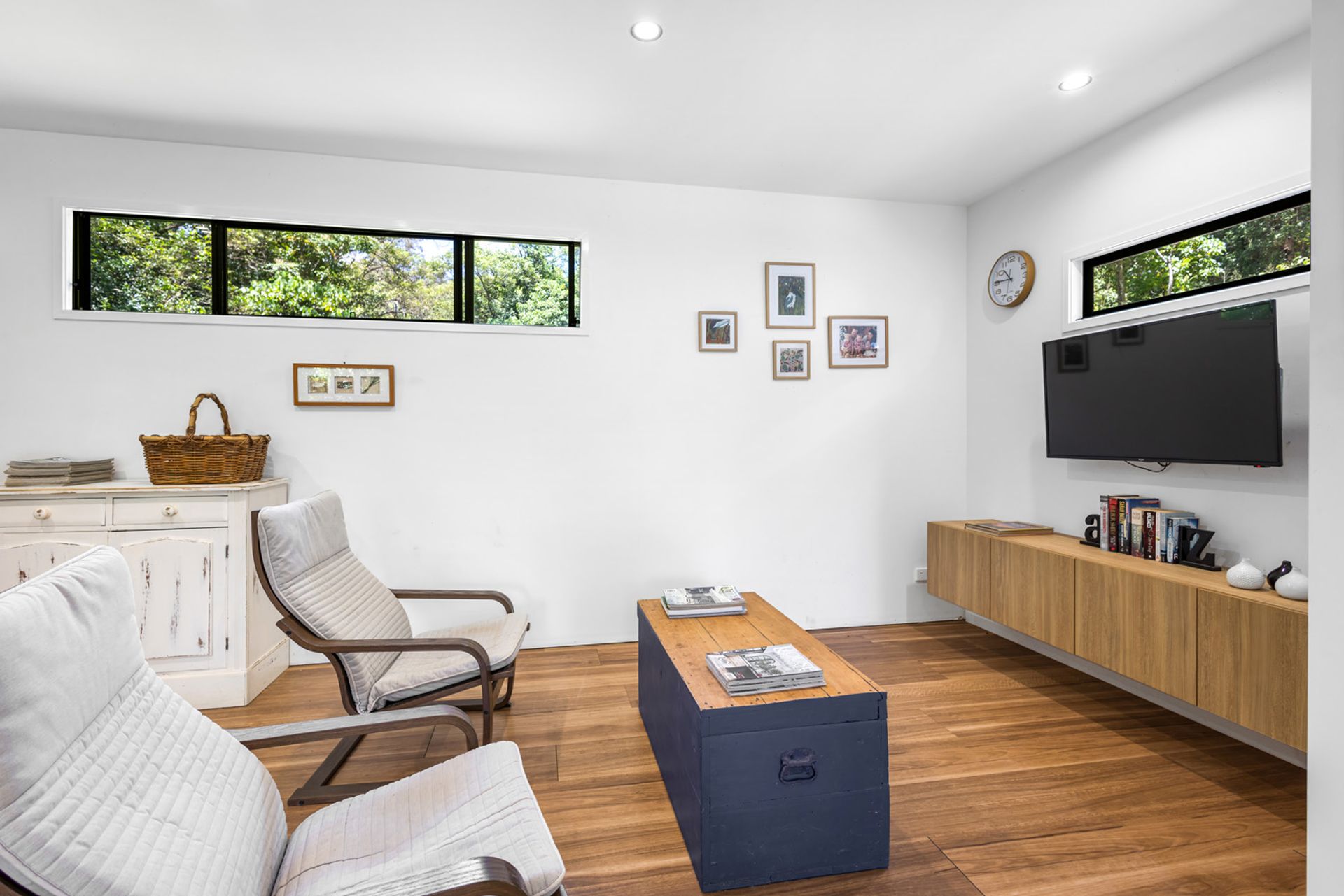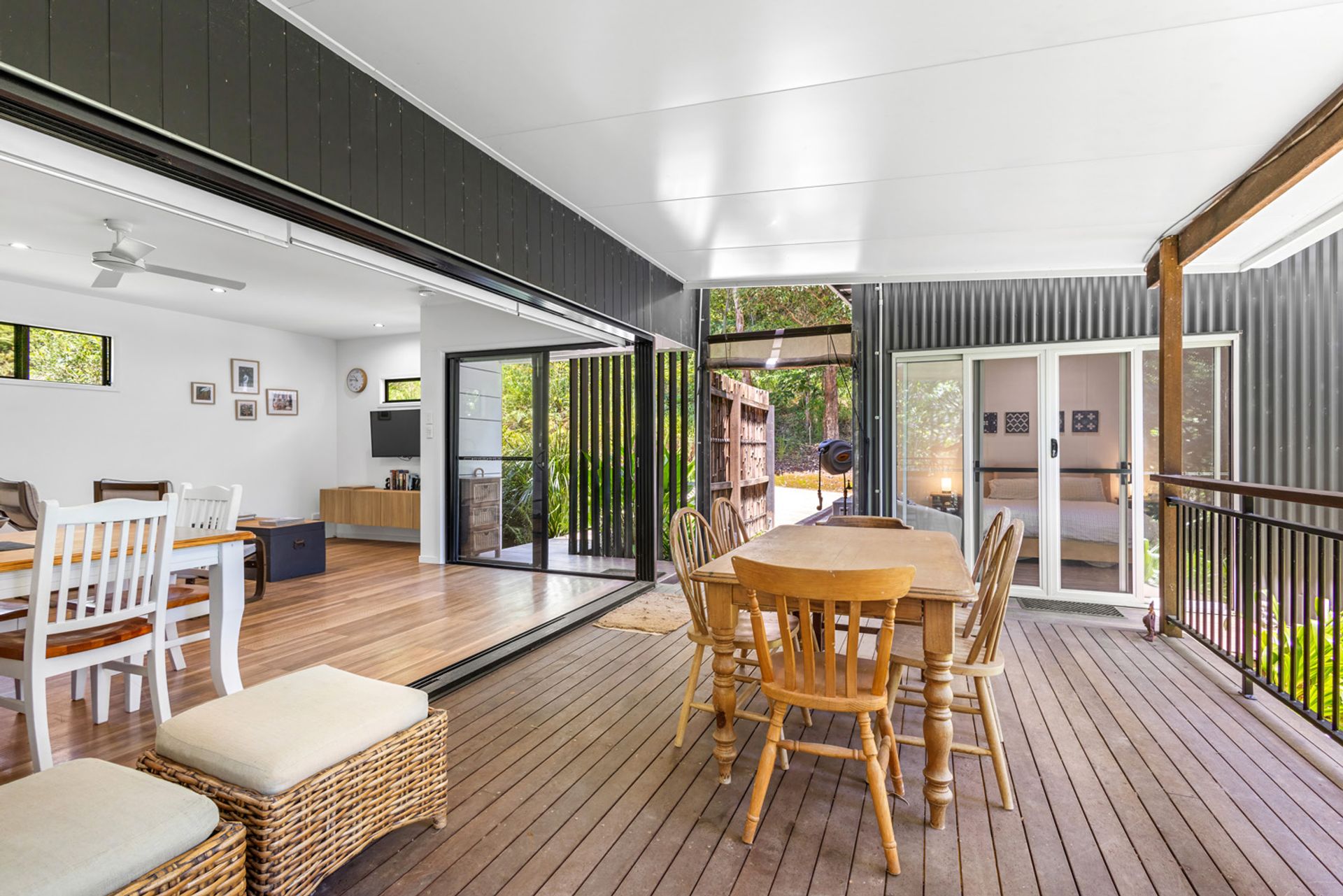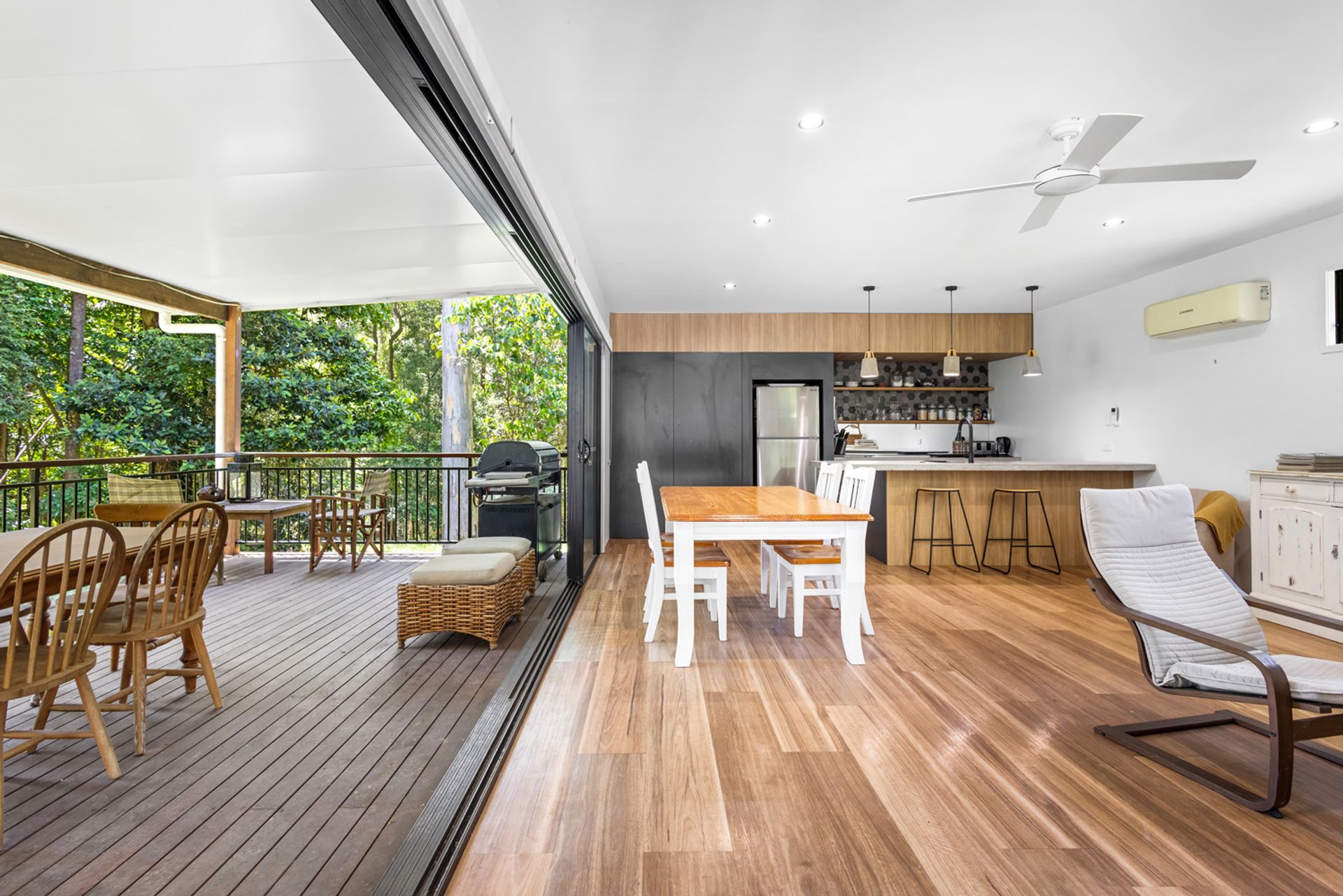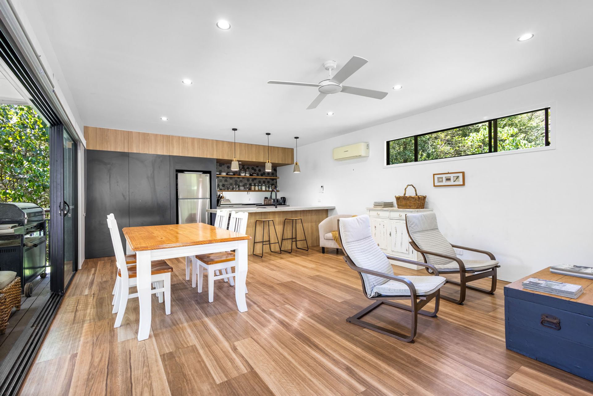 The studio home totalling 84m² boasts 2 bedrooms, 1 bathroom and an open-plan living area that flows seamlessly onto the expansive outdoor entertaining deck. Large windows invite an abundance of natural light and showcase breathtaking views of the surrounding greenery. A modern kitchen with ample storage, along with a hidden powder room. Aircon in both the bedrooms and living area/kitchen for those hot summer days.