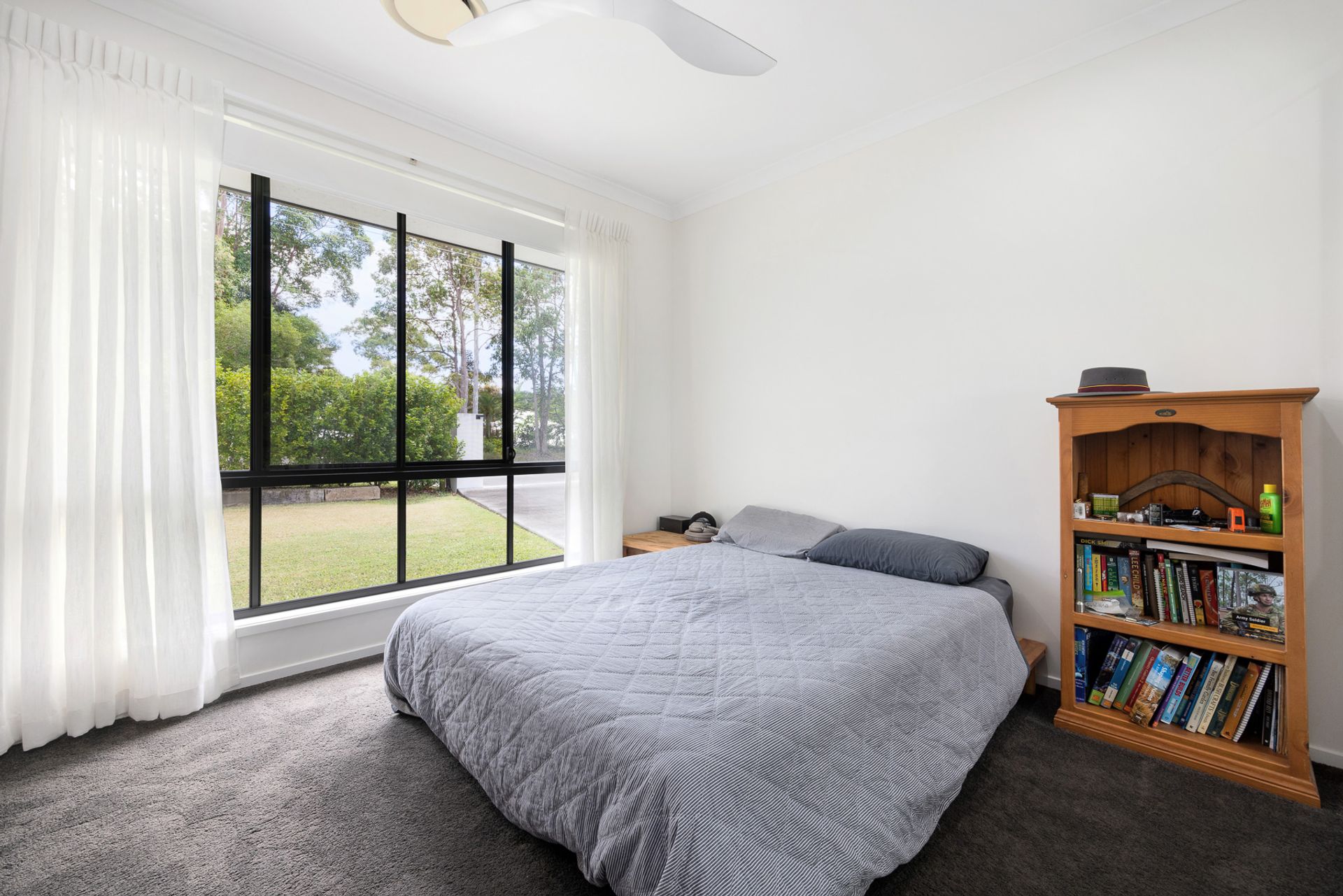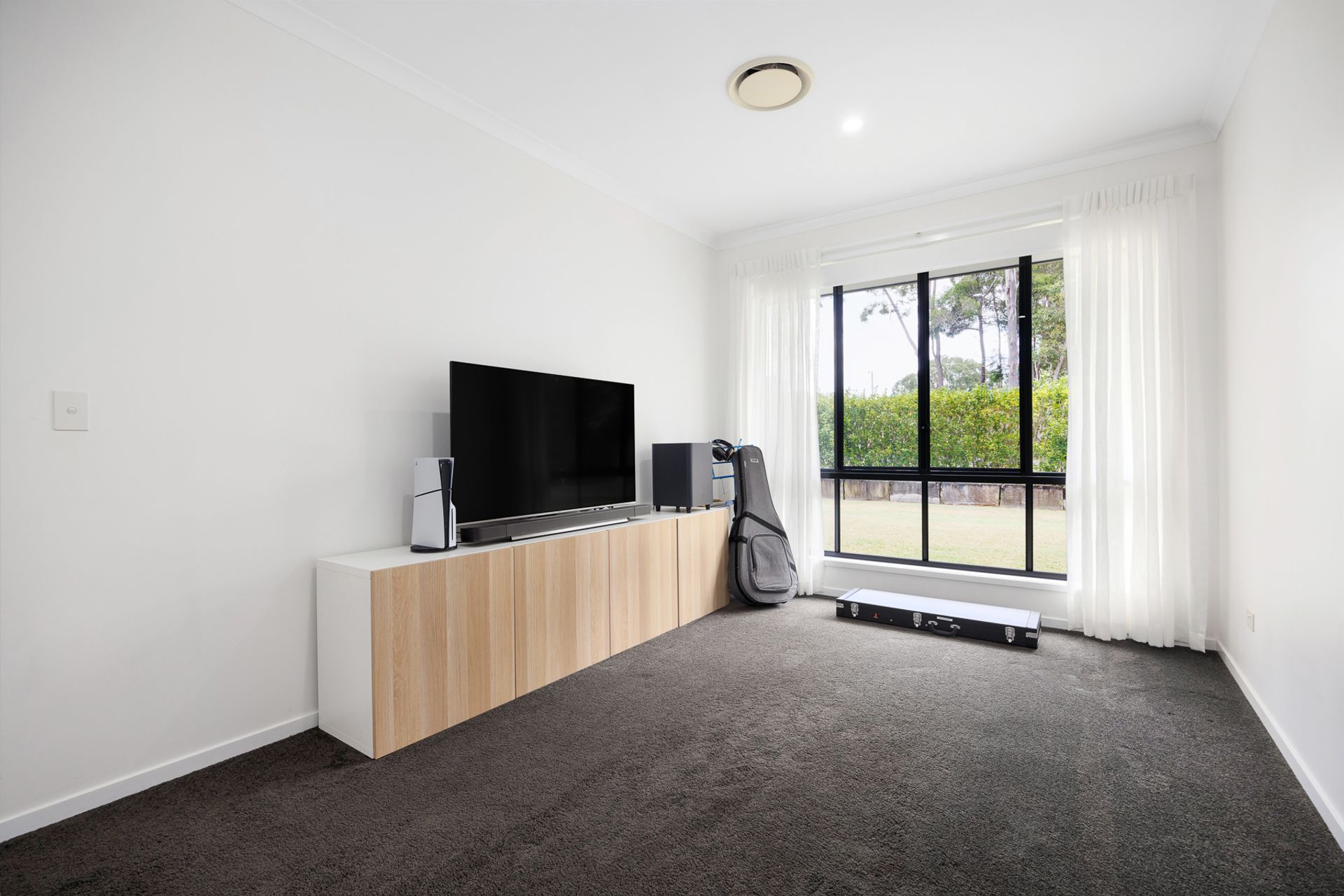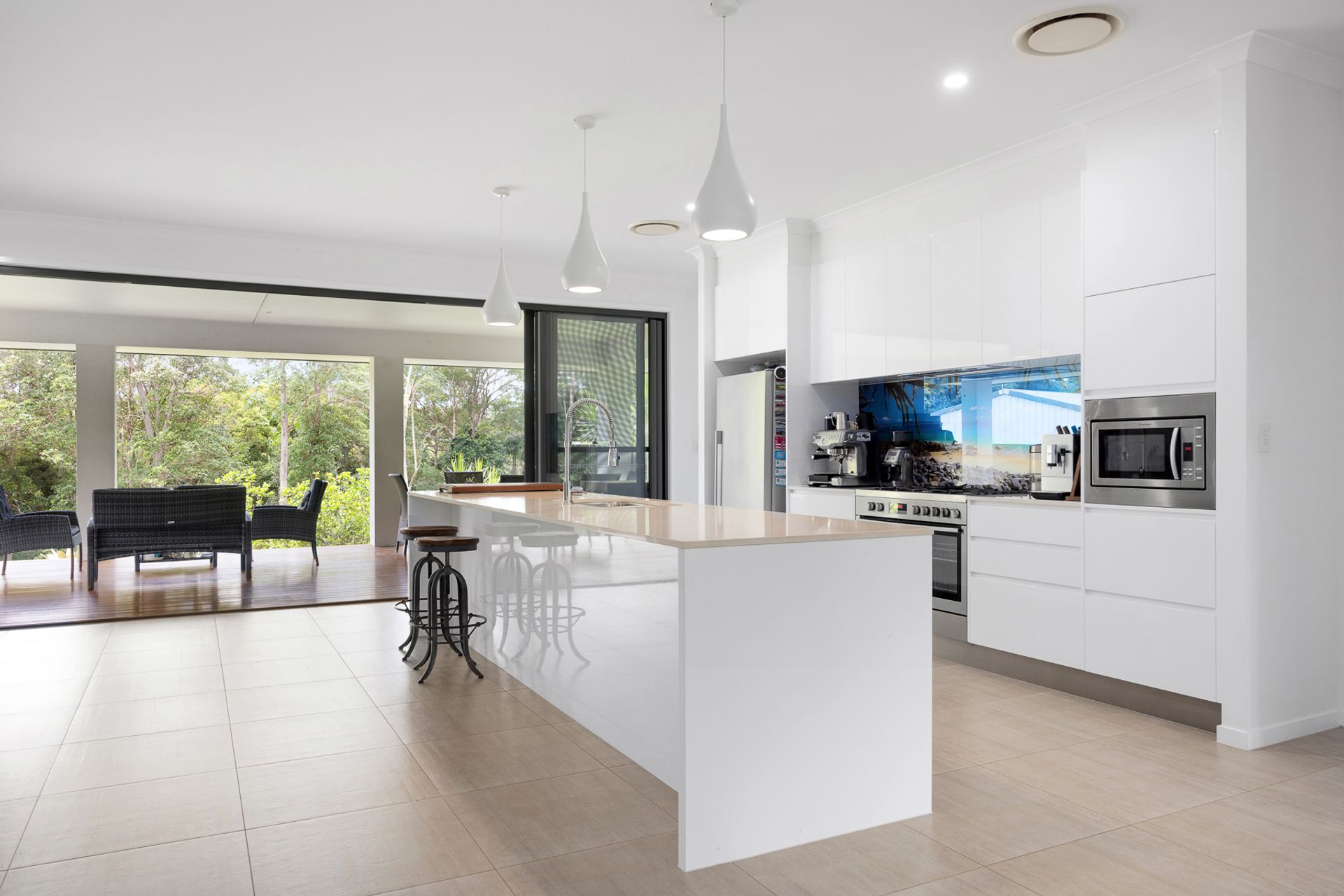 At its heart, the expansive open-plan living area is a showcase of effortless style. The designer kitchen features a gas cooktop, island bench, and elegant pendant lighting, flowing seamlessly to the dining and lounge spaces. Floor-to-ceiling glass doors invite you outside to a vast covered entertaining deck, where you can relax with family and friends, soaking in the peaceful sounds of native birdlife and overlooks the vast lawns and gardens.