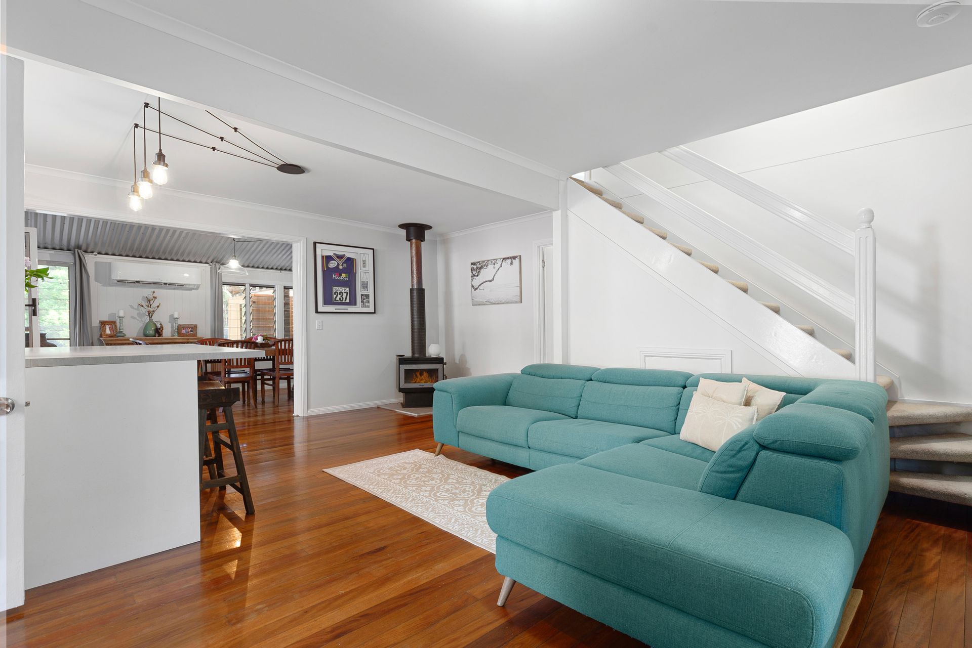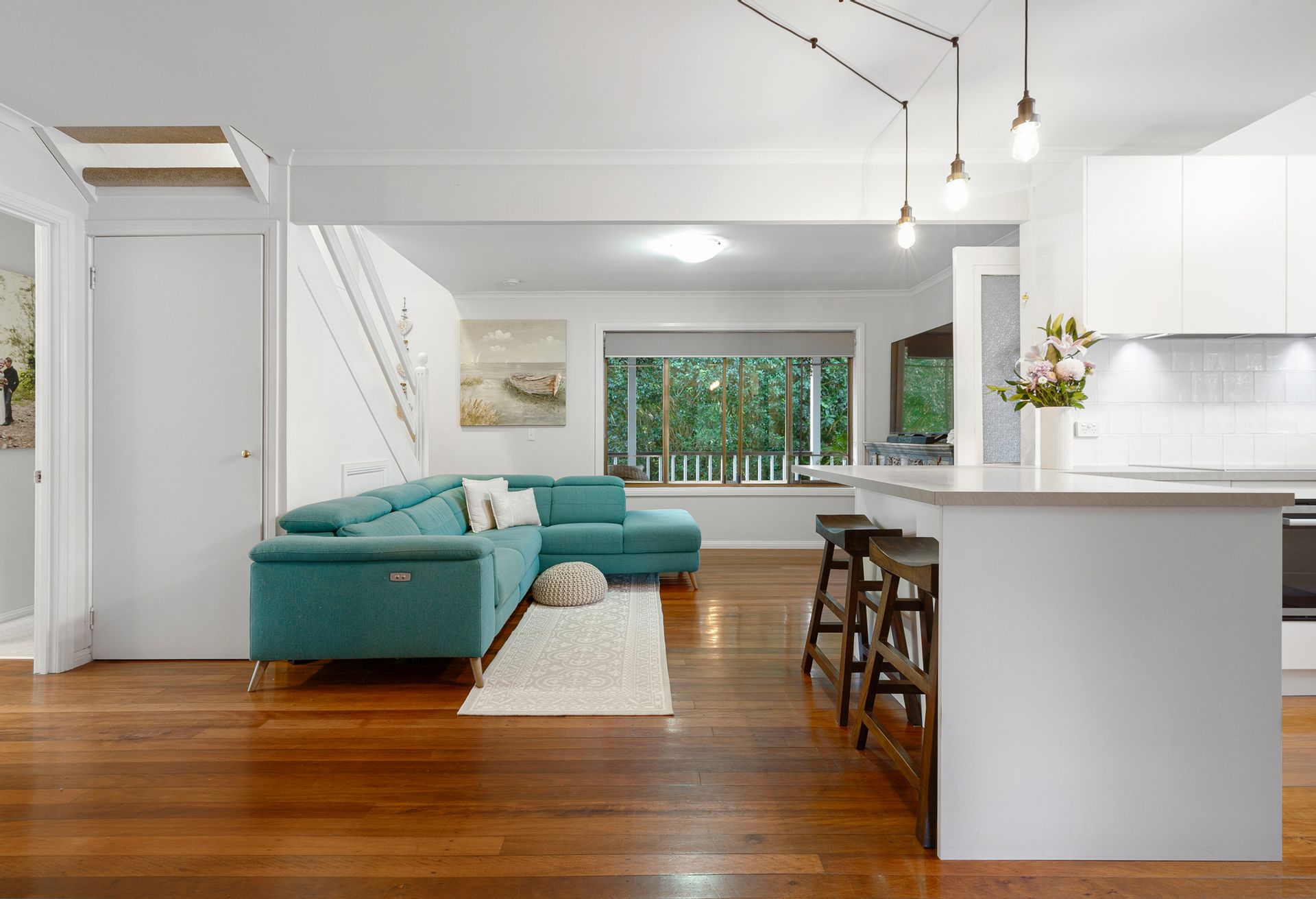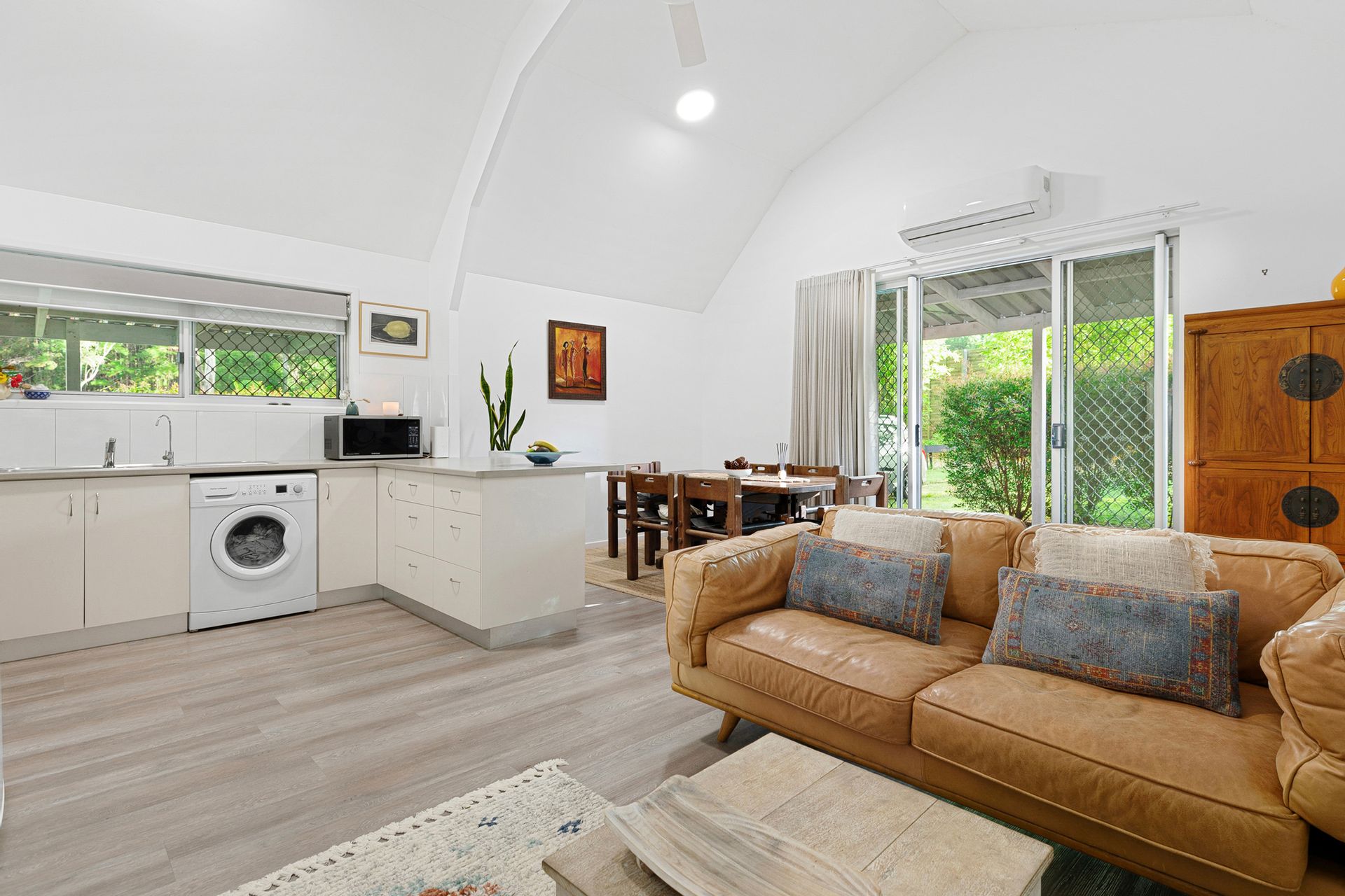 - Spacious open-plan living with soaring ceilings & rich timber floors