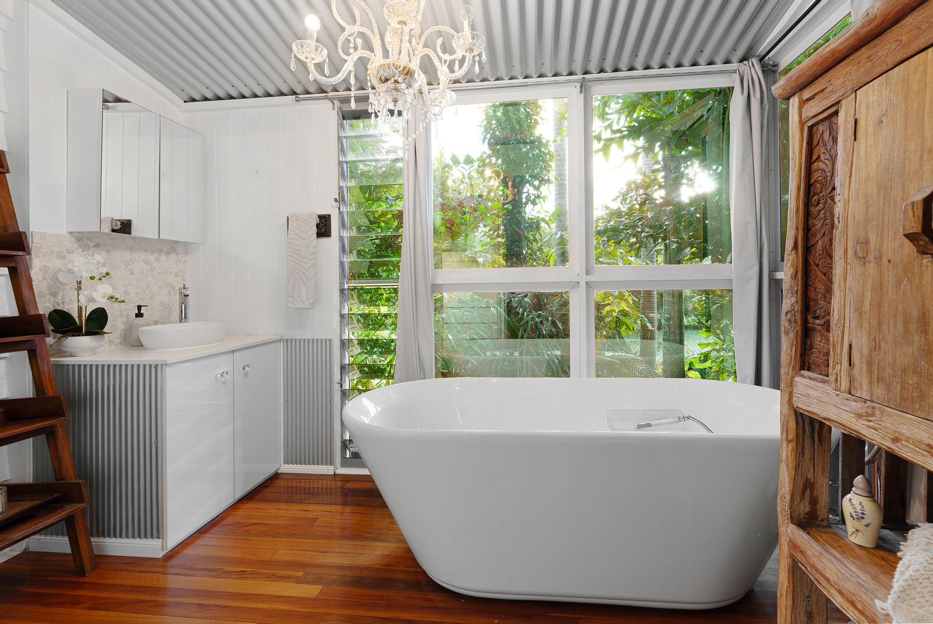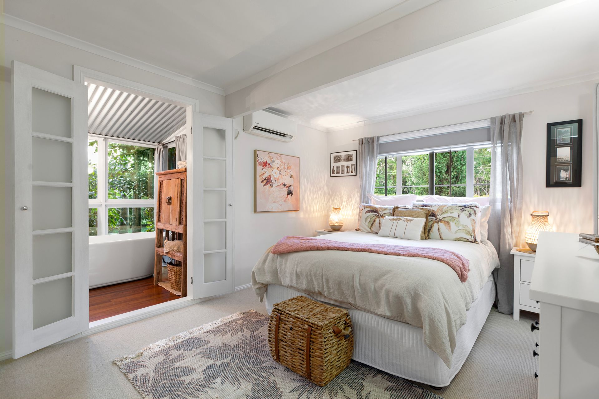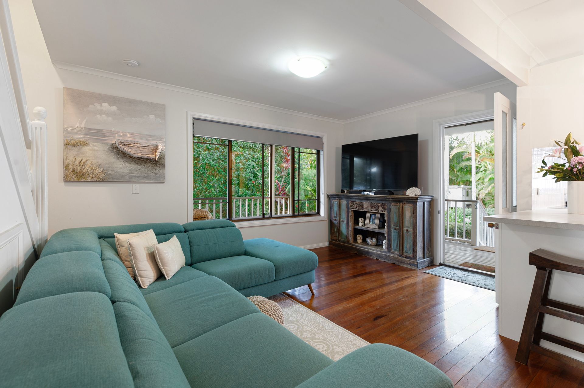 - Spacious open-plan living with soaring ceilings & rich timber floors