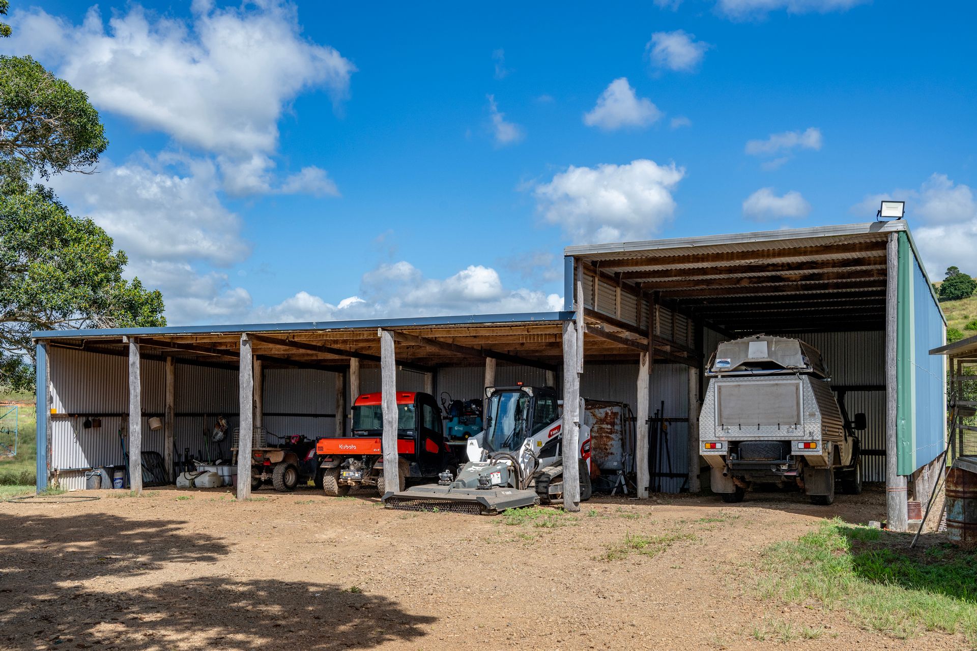 •Fully enclosed 16x9x9* meter four-bay Colorbond shed concrete floor, five-bay machinery/car shed enclosed on three sides. Both sheds have workshop benches, power and lighting