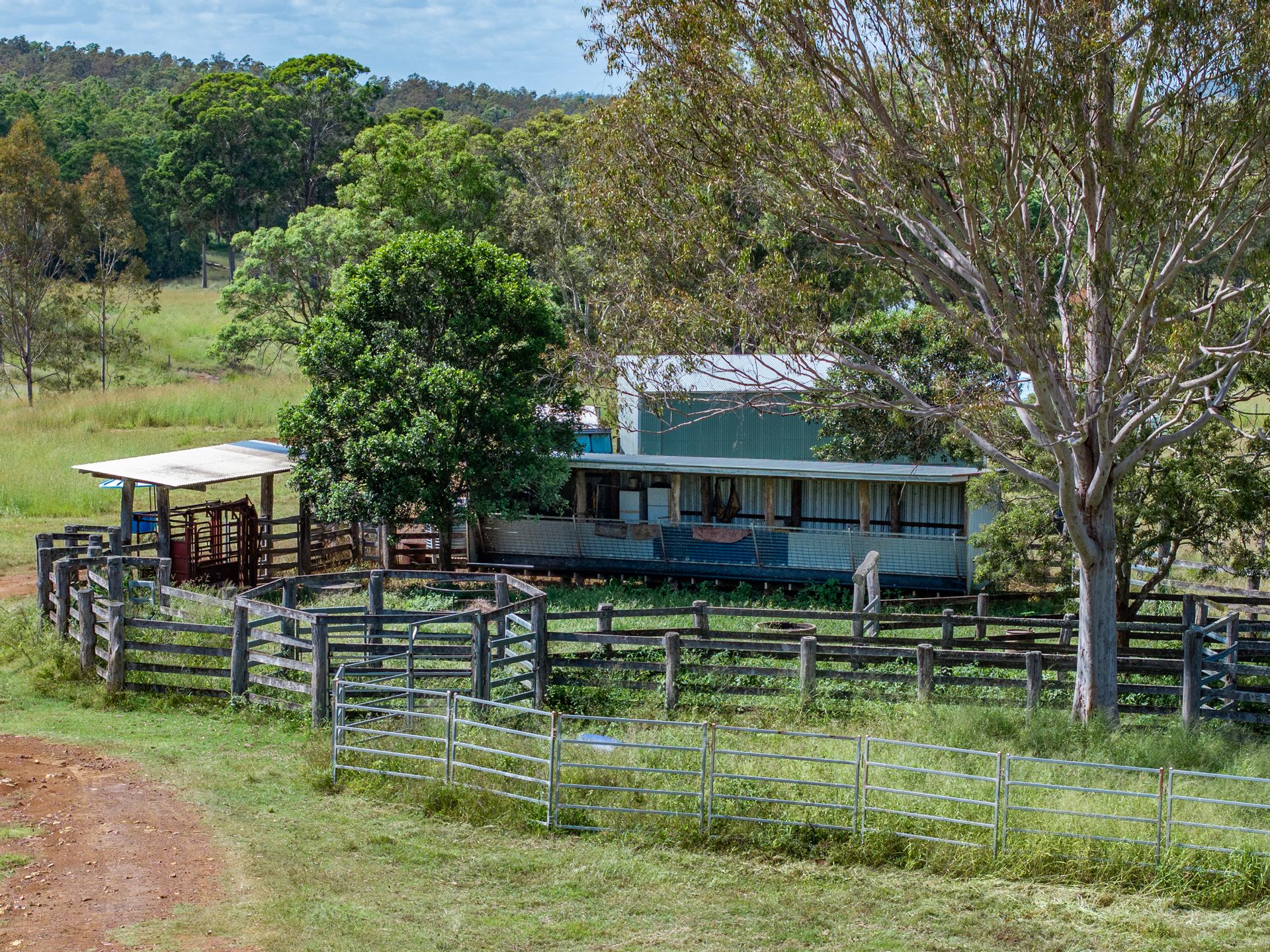 • A timber set of cattle yard include a pound, race, vet crush, and attached feed shed with hay racks.