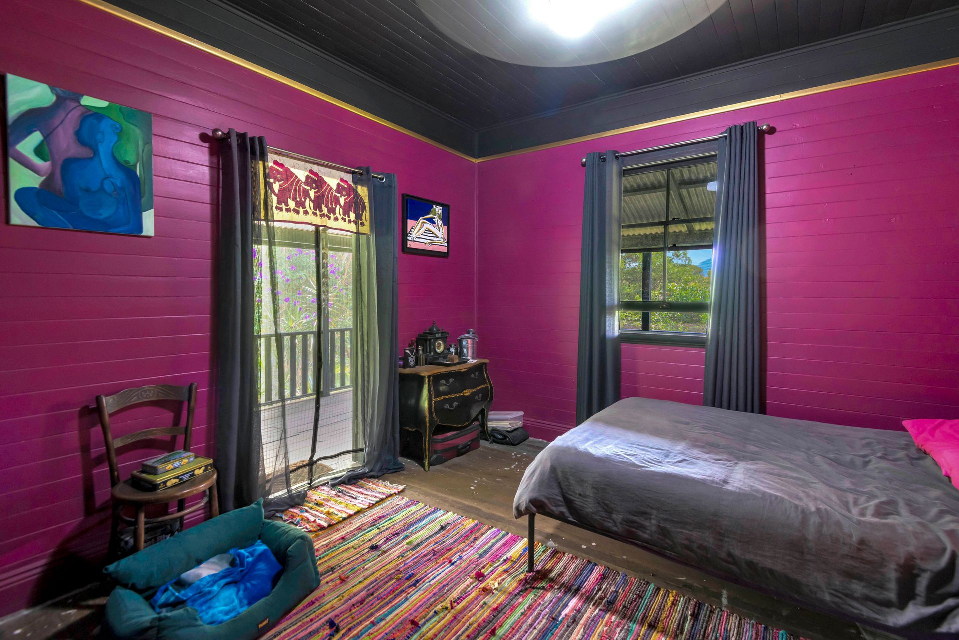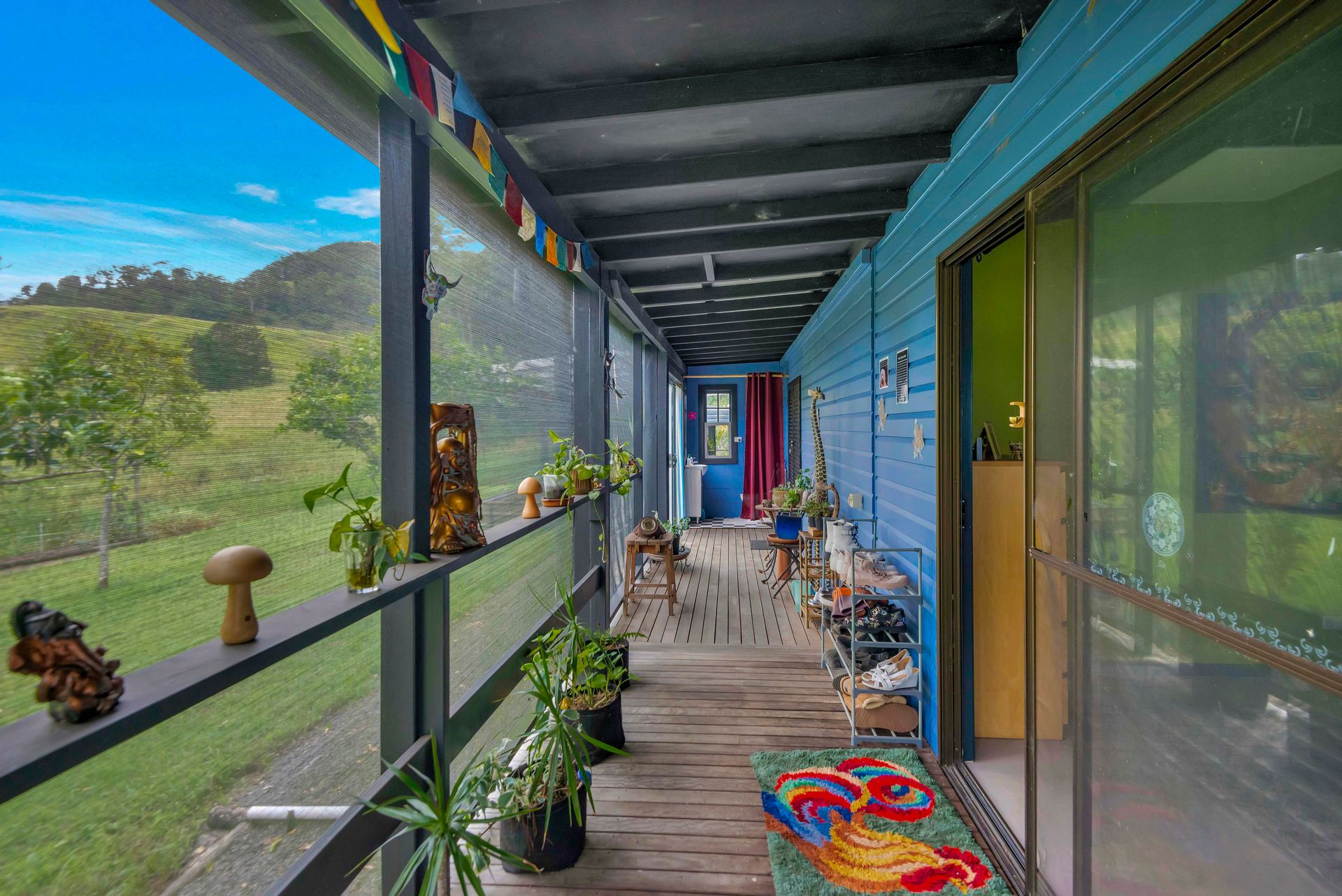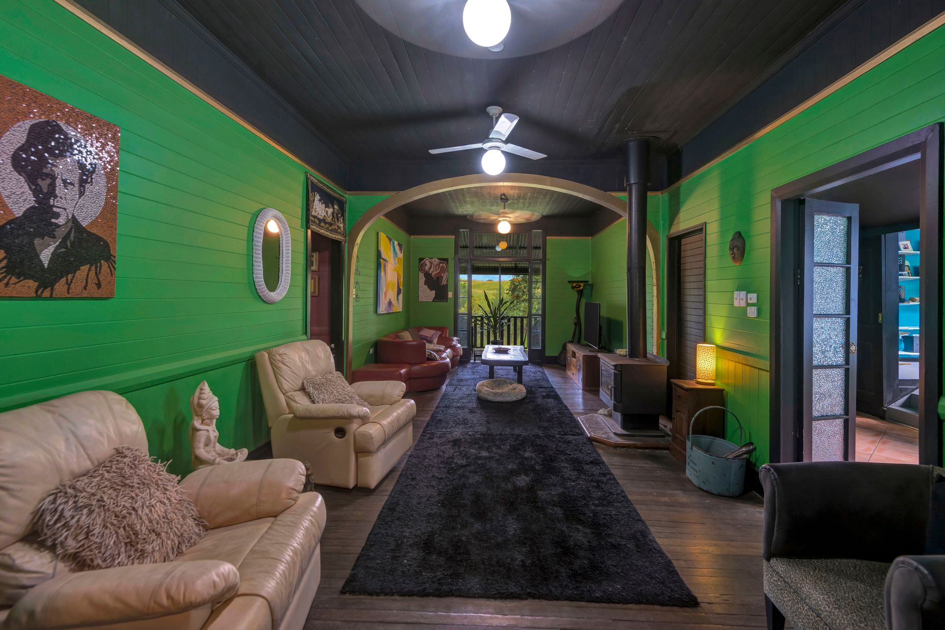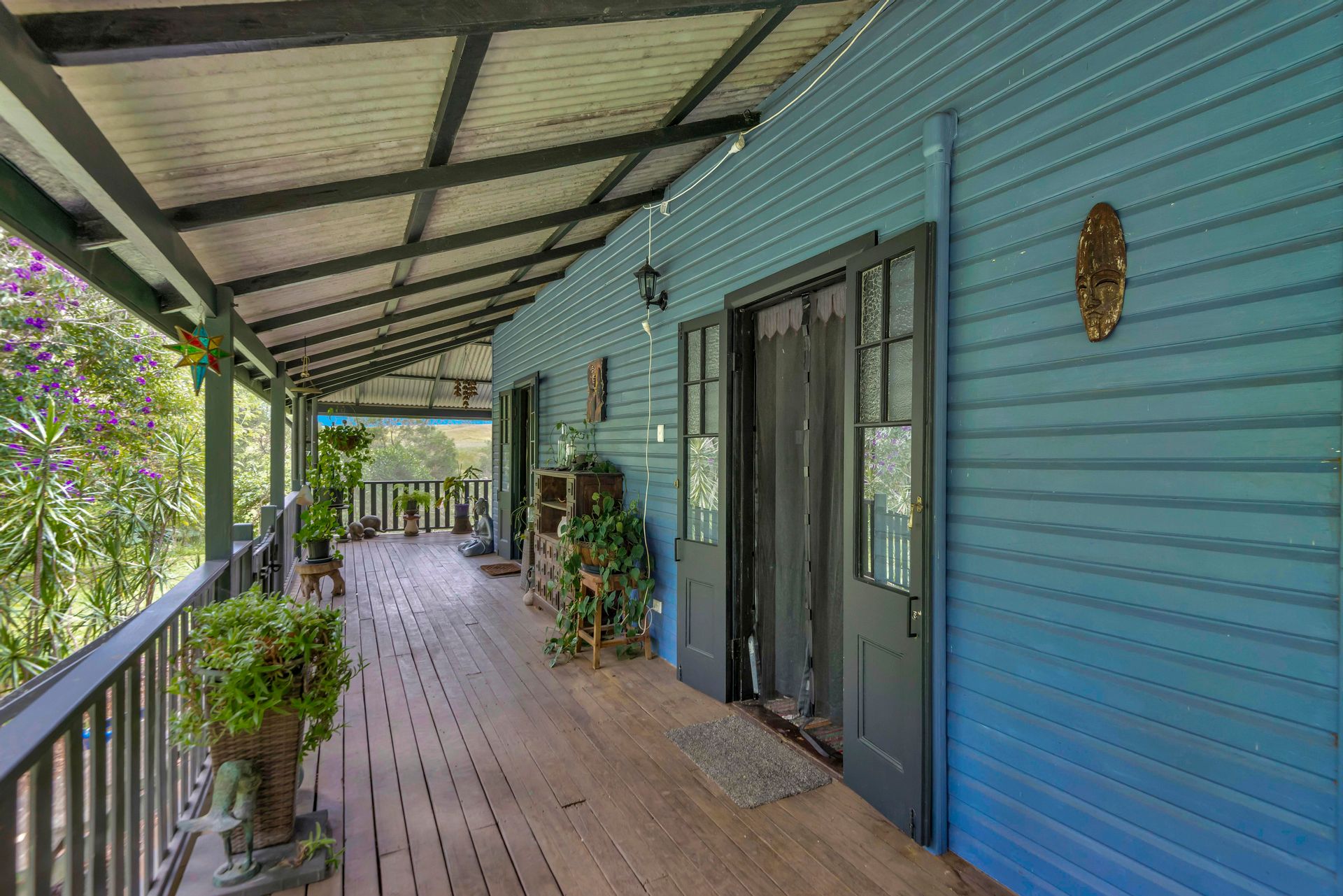 With an amazing location taking in close views of the Nimbin Rocks and full vistas of Blue Knob Mountain, this gorgeous offering will delight the senses both architecturally (inside and out), as well as around the sensational grounds. Commanding an elevated section of the 11 acre property, the owners have showcased the best features of an original Queenslander in bespoke ways and with a richly coloured paint-palette, then refurbished a light and airy contemporary ‘oversized studio’ at the rear as a secondary living set of spaces. But the uniqueness of the home lies in the joining of the two by way of nooks, courtyards, verandahs and wide covered-in hallways. Currently configured as a four large conventional bedroom home with a big studio annexe and 2 ½ bathrooms, the combined spaces give you the unique potential of 3 immediate changes of floorplan without any renovations at all! These are: