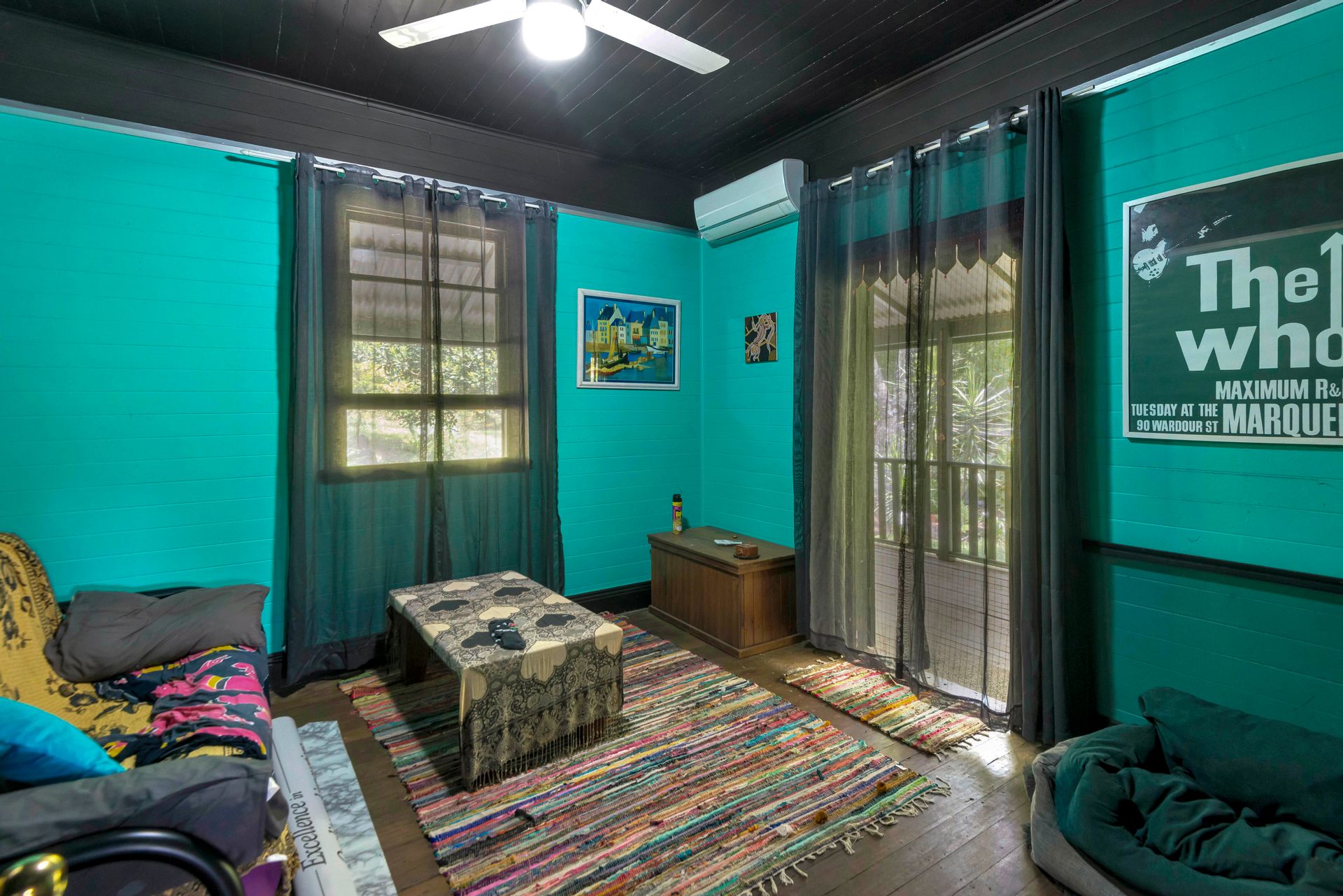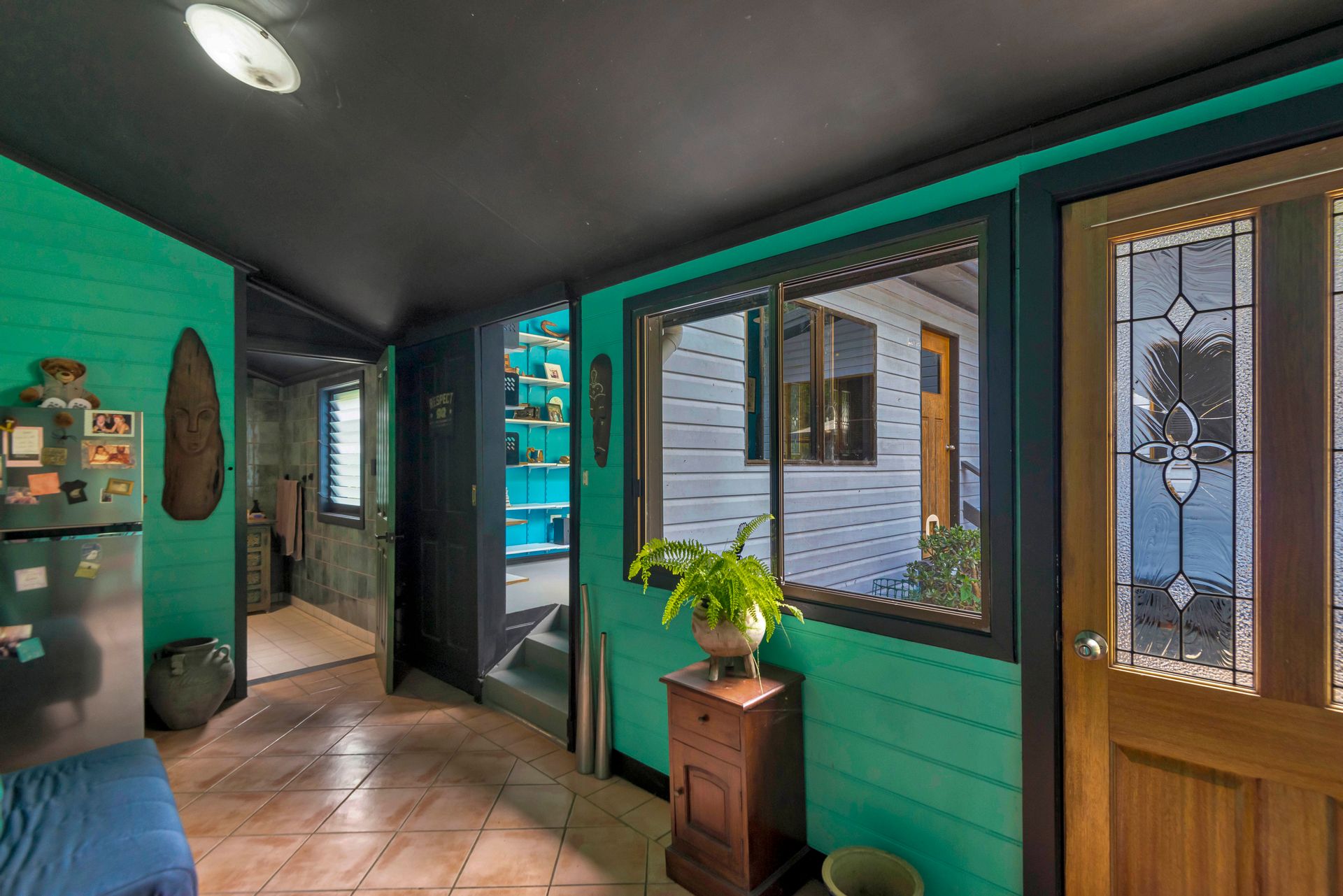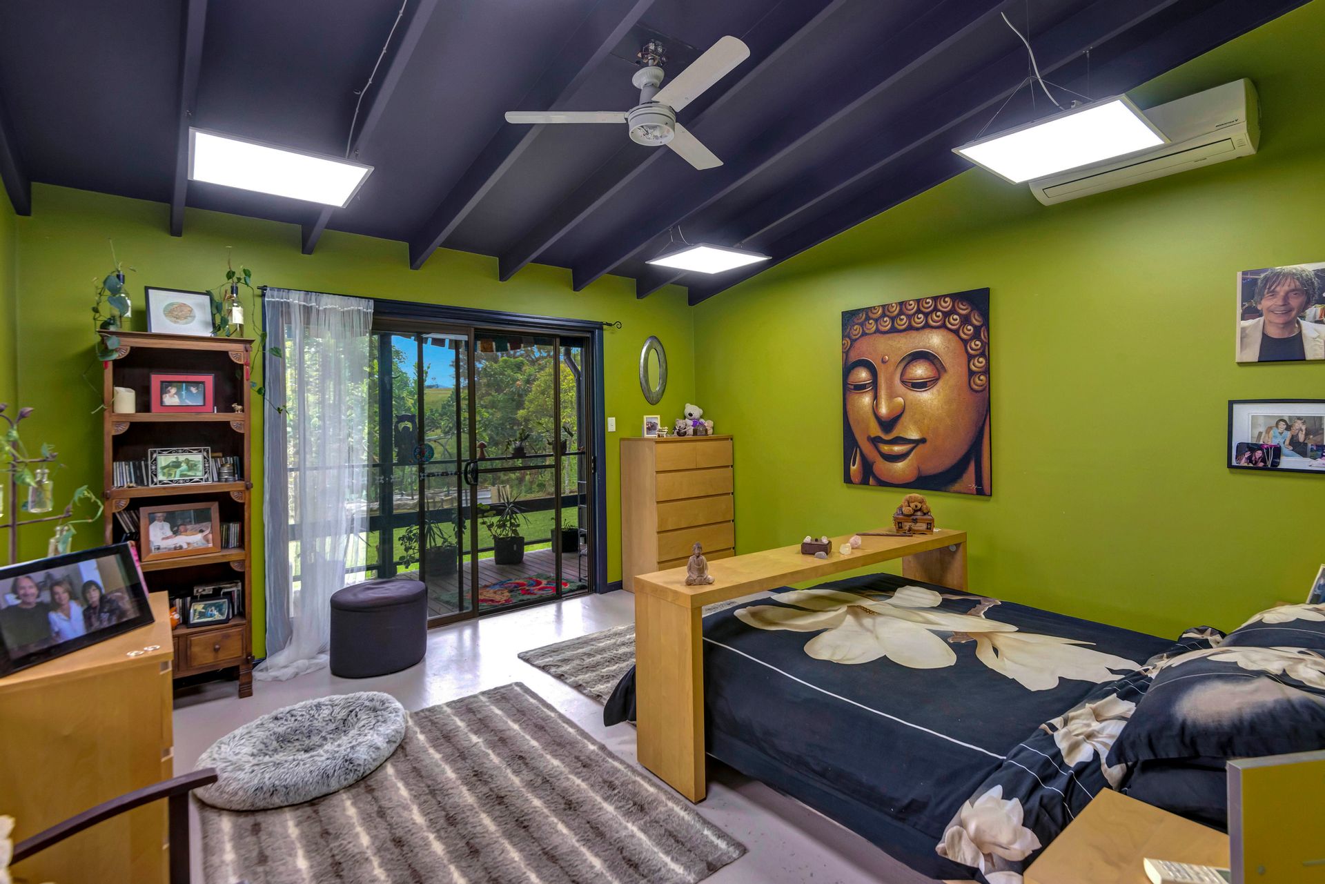 With an amazing location taking in close views of the Nimbin Rocks and full vistas of Blue Knob Mountain, this gorgeous offering will delight the senses both architecturally (inside and out), as well as around the sensational grounds. Commanding an elevated section of the 11 acre property, the owners have showcased the best features of an original Queenslander in bespoke ways and with a richly coloured paint-palette, then refurbished a light and airy contemporary ‘oversized studio’ at the rear as a secondary living set of spaces. But the uniqueness of the home lies in the joining of the two by way of nooks, courtyards, verandahs and wide covered-in hallways. Currently configured as a four large conventional bedroom home with a big studio annexe and 2 ½ bathrooms, the combined spaces give you the unique potential of 3 immediate changes of floorplan without any renovations at all! These are: