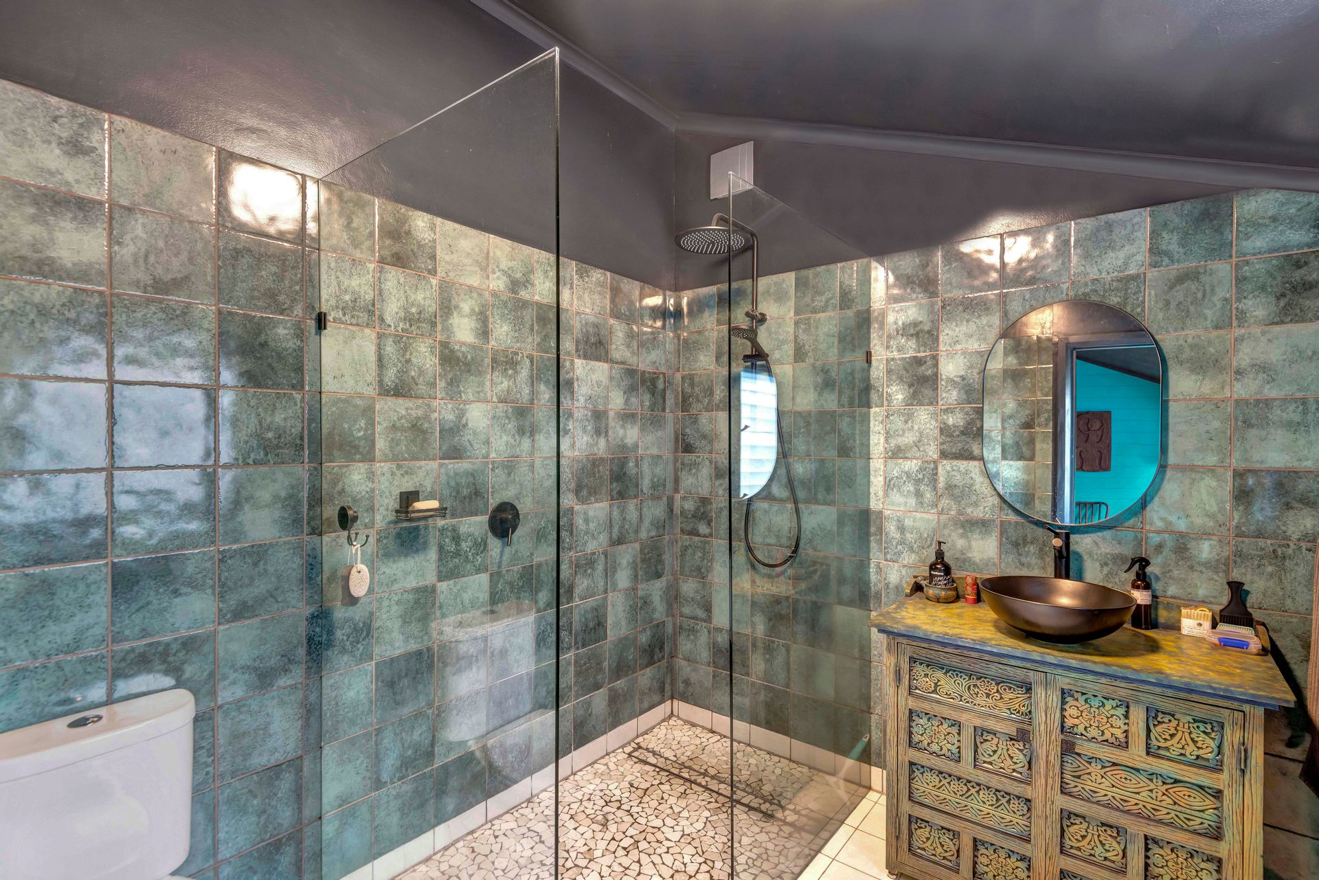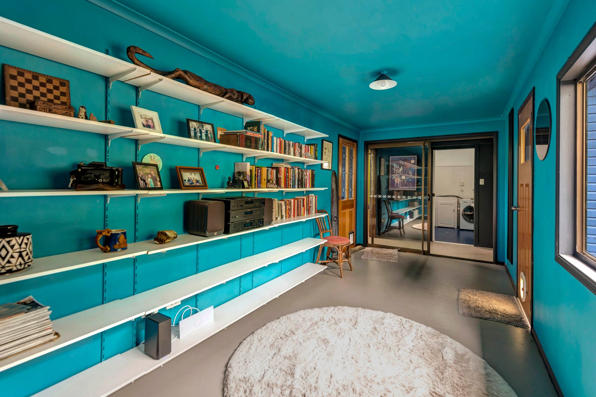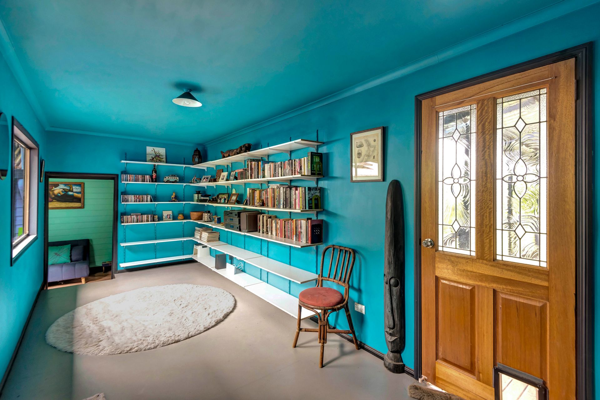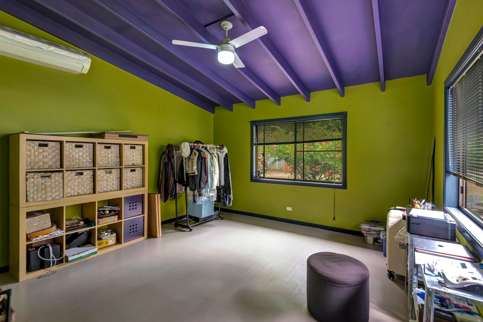 With an amazing location taking in close views of the Nimbin Rocks and full vistas of Blue Knob Mountain, this gorgeous offering will delight the senses both architecturally (inside and out), as well as around the sensational grounds. Commanding an elevated section of the 11 acre property, the owners have showcased the best features of an original Queenslander in bespoke ways and with a richly coloured paint-palette, then refurbished a light and airy contemporary ‘oversized studio’ at the rear as a secondary living set of spaces. But the uniqueness of the home lies in the joining of the two by way of nooks, courtyards, verandahs and wide covered-in hallways. Currently configured as a four large conventional bedroom home with a big studio annexe and 2 ½ bathrooms, the combined spaces give you the unique potential of 3 immediate changes of floorplan without any renovations at all! These are: