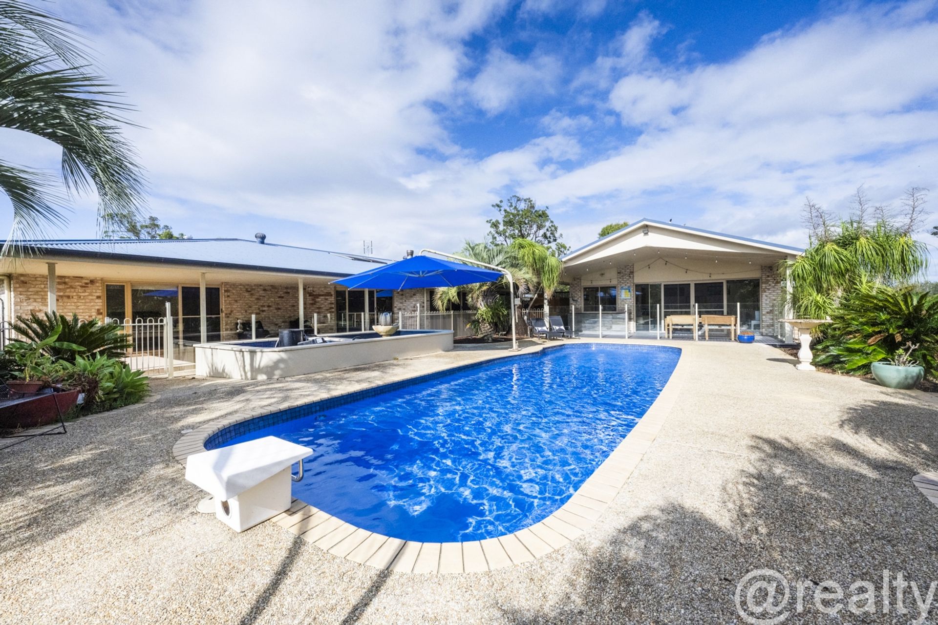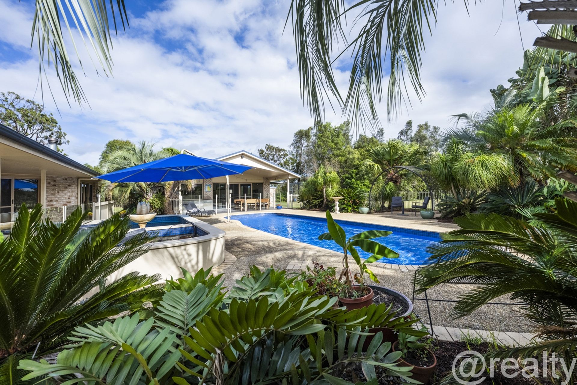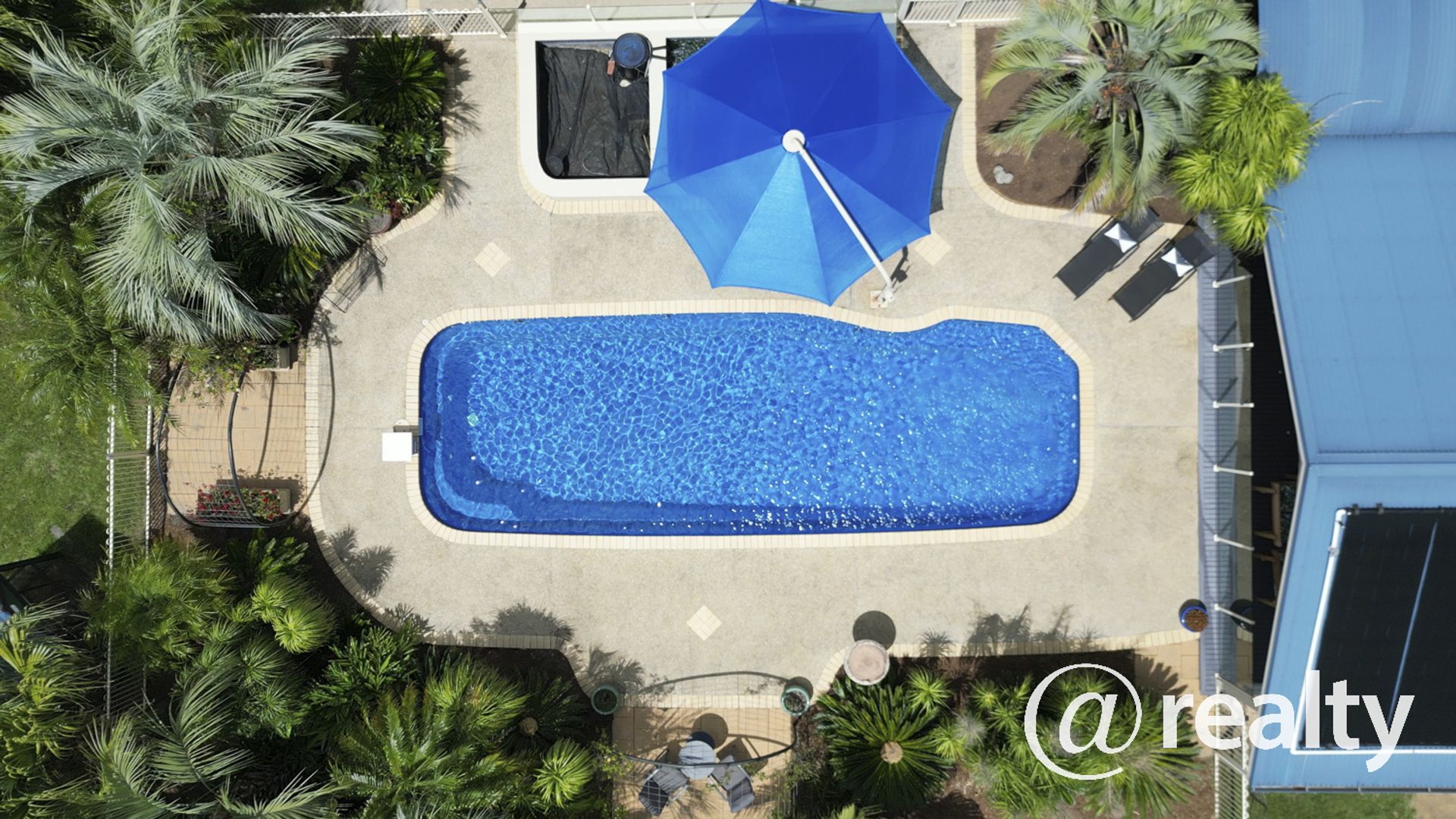 ** Solar heated Pool with Auto Cleaner, Shade Umbrella and tropical landscape.