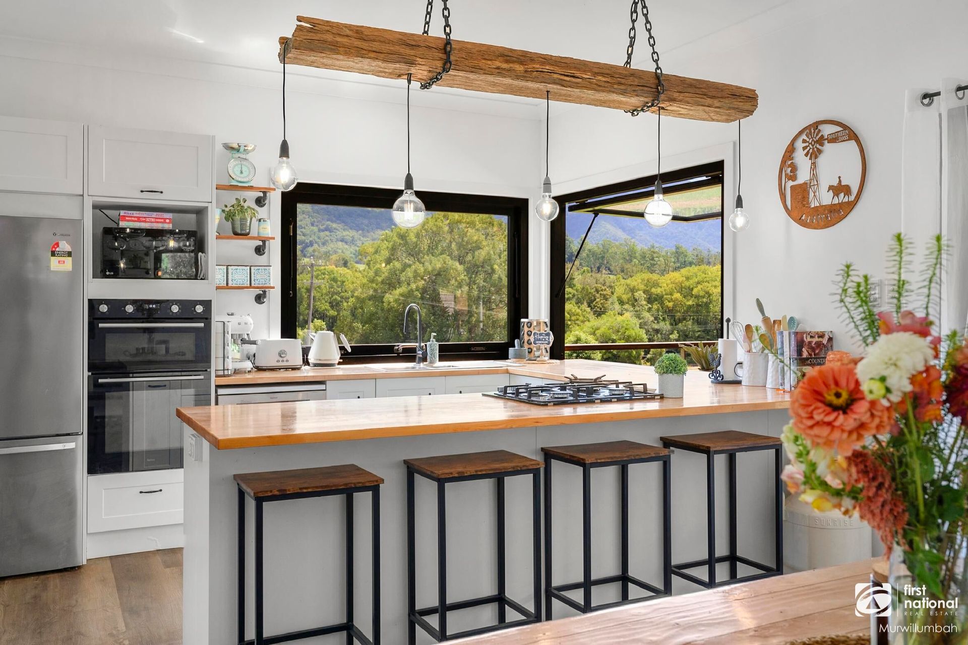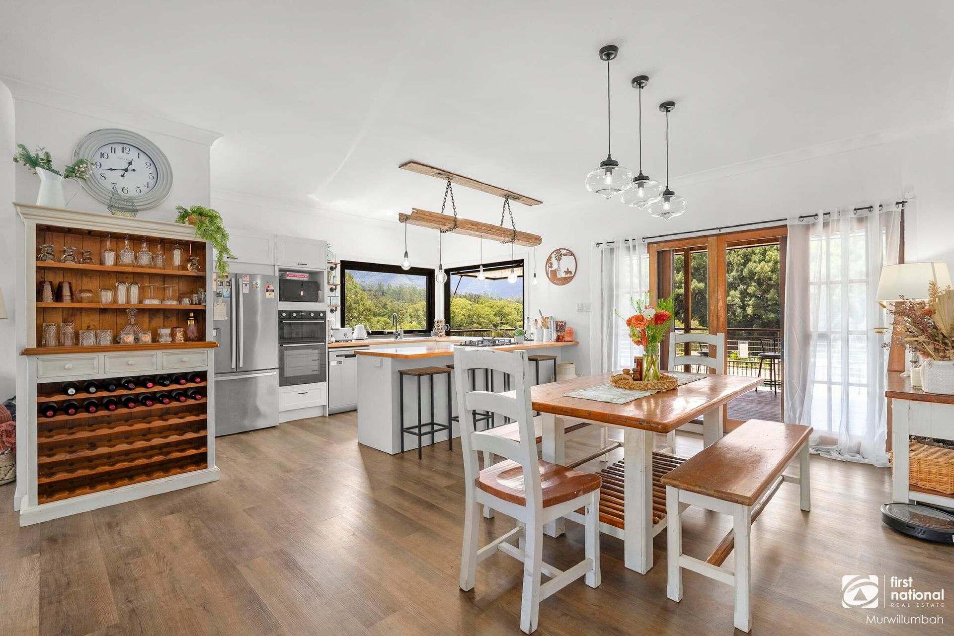 - A modern country kitchen boasting a huge island bench, large pantry, breakfast bar opening out to the verandah and oversized windows framing the stunning hinterland.