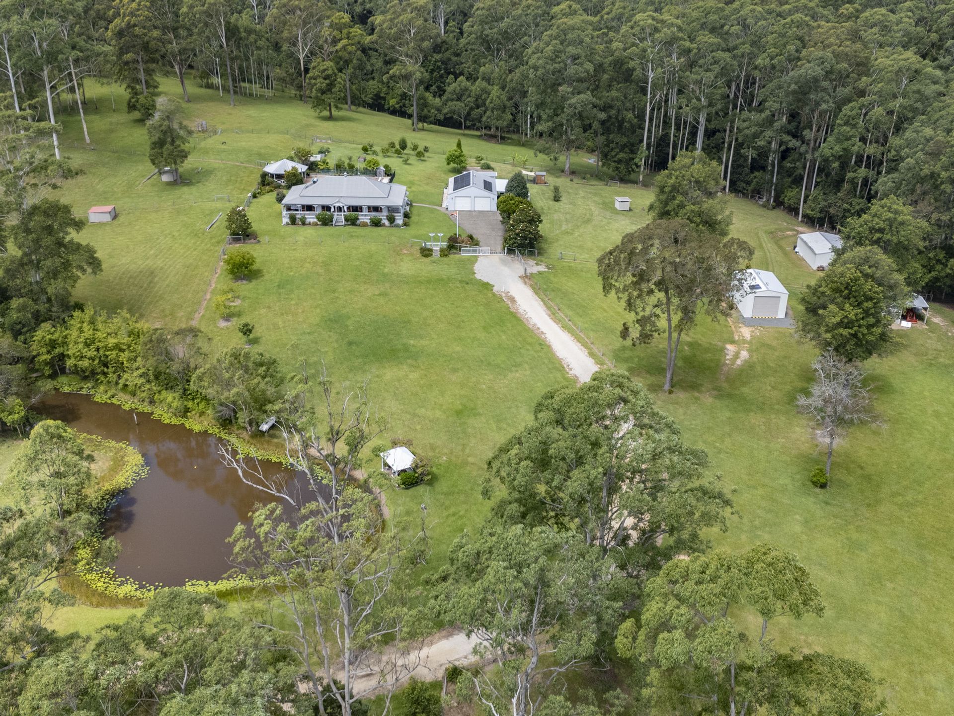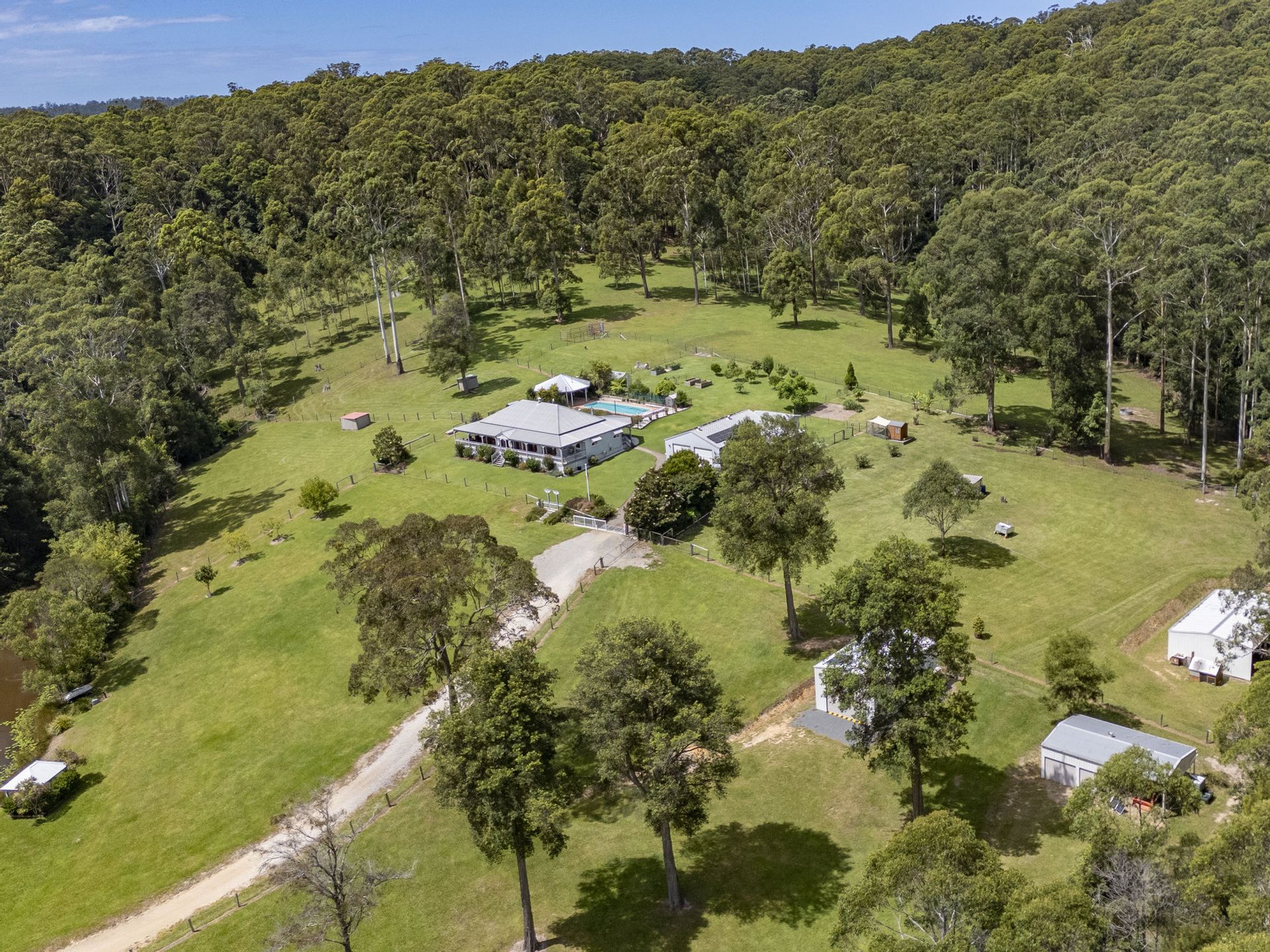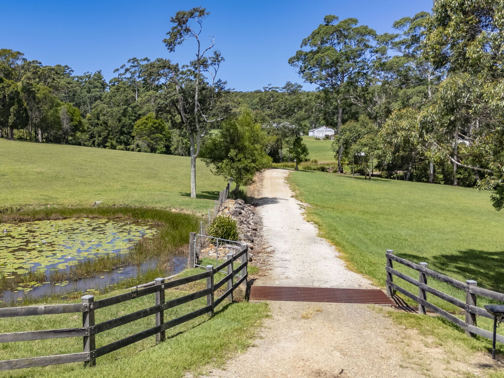 The 102.8 acres(41.6ha approx.) spreads across both sides of Mardells Road ensuring your privacy and guaranteeing no neighbours within sight ! Comprising of 70 acres(approx.) where the home sits being a combination of newly fenced, parklike, lush grazing land with 2 dams, stockyard, cattle crush & loading ramp and approx. 50 acres of native bushland with beautiful walking trails. Also conveniently placed near the home you will find a green house, plentiful orchard, raised garden beds and small cultivated veggie patch awaiting next seasons plantings. Situated on the opposite side of Mardells Road the remaining 30 acres(approx.) is found, newly fenced rich pasture improved grazing land with shady stands of trees, a long stretch of Bucca Creek frontage and boasts a 2nd set of cattle yards, crush and the 3 bay farm shed.