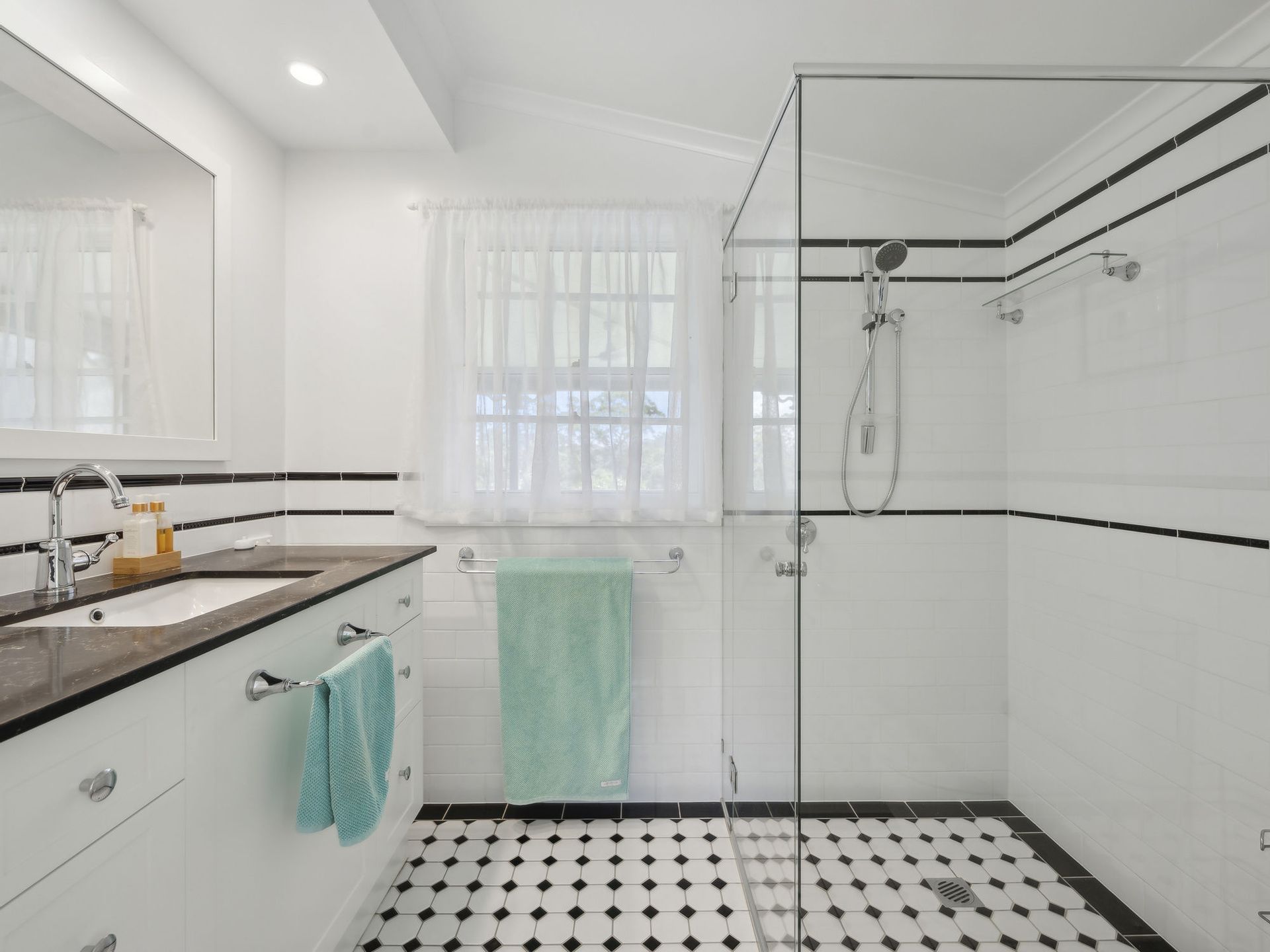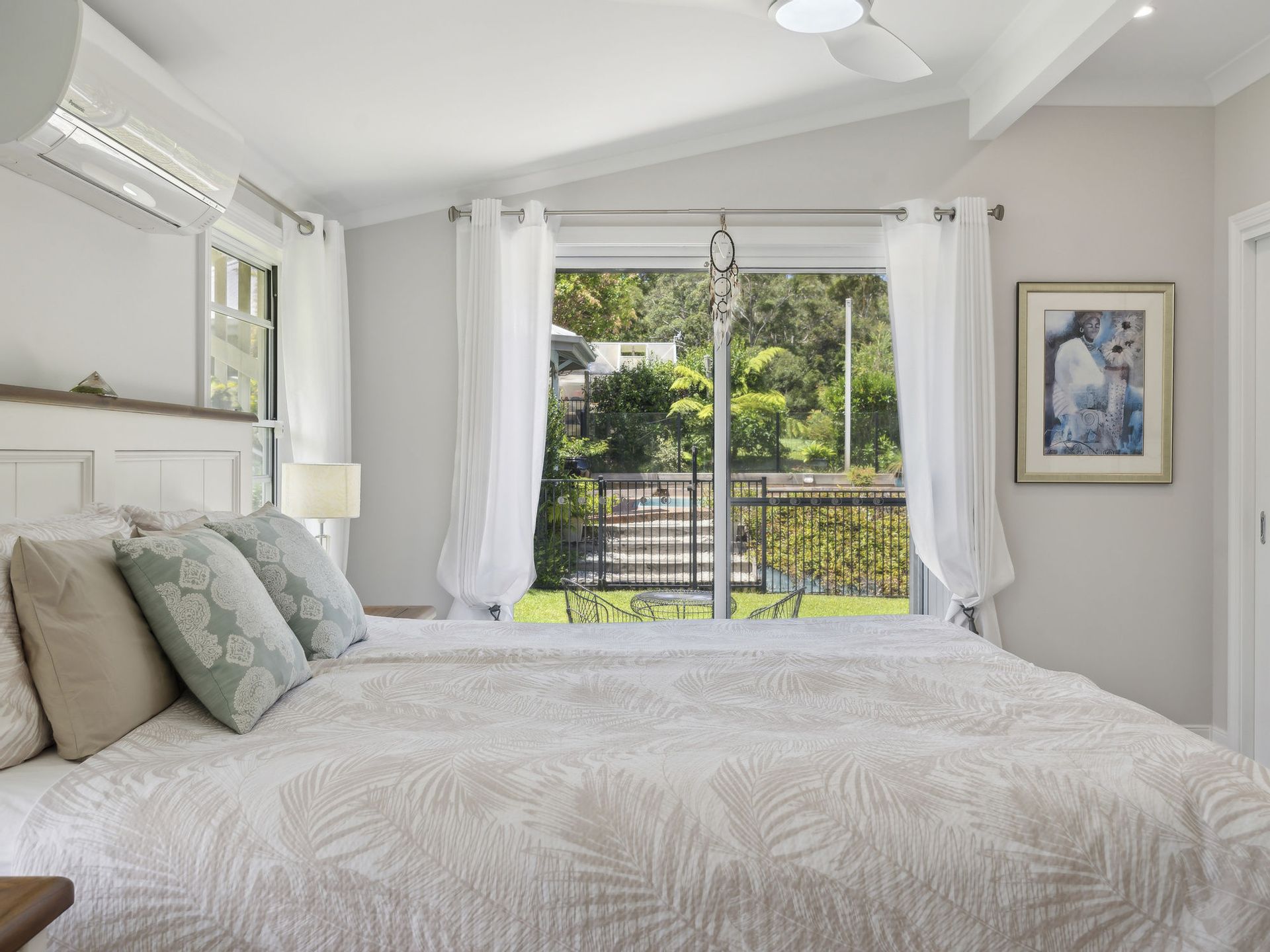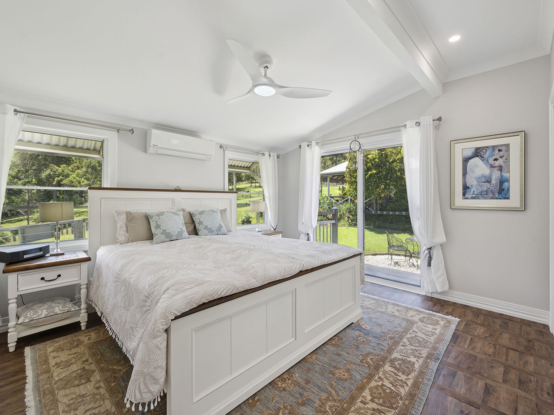 4 generous bedrooms in total with ceiling fans, 2 with air-con and 2 again offer pretty French doors and double hung windows out to the veranda. Add to the list refurbished main bathroom touched with tradition in classic black & white tiles & hosting a vanity with deep draws and striking marble top, a luxurious bath and separate W.C. The main suit is positioned away from the other 3 bedrooms and like the entire home is bathed in gorgeous natural light and boasts a large robe & well appointed refurbished ensuite continuing the fresh black and white theme. From the main bedroom be tempted out to the pool and spa area through siding doors for a quick moonlight dip.
