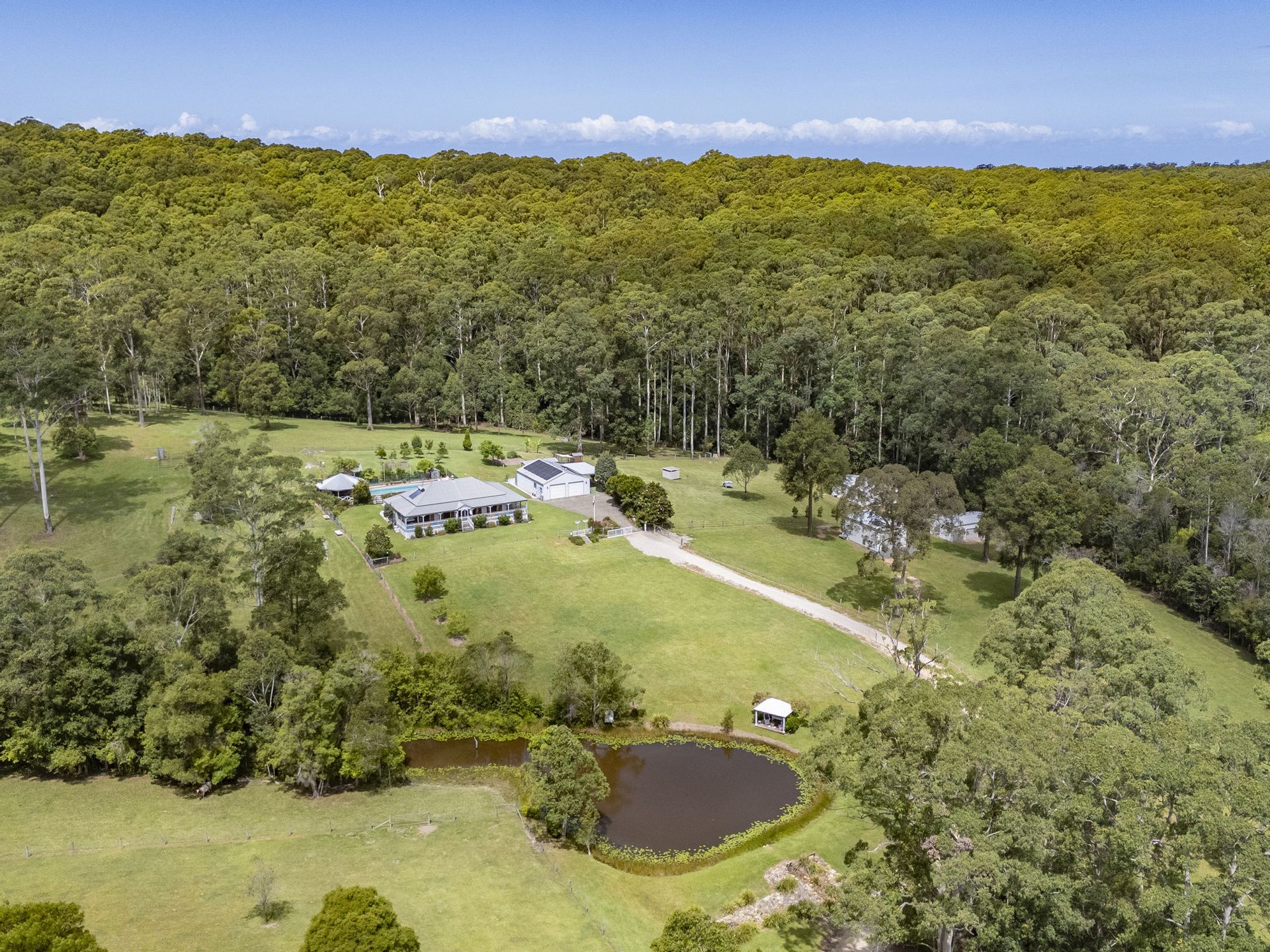 Along a quiet country road nestled in a hidden pocket of the Bucca Valley in the Coffs Coast hinterland with your privacy assured you will find this impeccable property, exuding charm and sophistication built in a classic Queenslander style, standing proudly on 102.8 beautiful acres(41.6 ha) approx. a balanced blend of cleared pasture improved well fenced paddocks and natural bushland. With the add bonus of 5 new and as new sheds offering ample garaging for cars, boat, caravan, float, farm machinery and storage. And all just a short 6.4 kms drive to the sundrenched sandy shores of beautiful Moonee Beach, the convenience of The Moonee Market shopping centre and just a 16 km drive to the large regional centre of Coffs Harbour and all it has to offer.