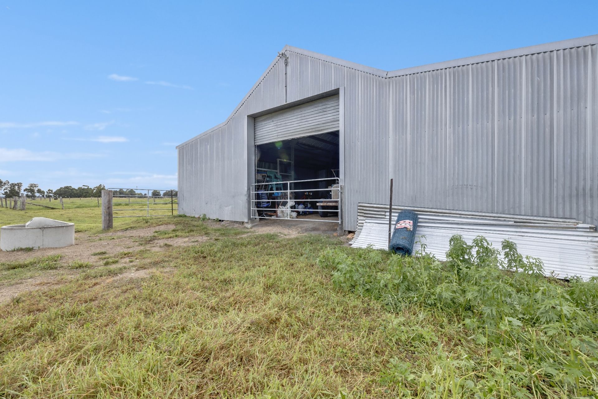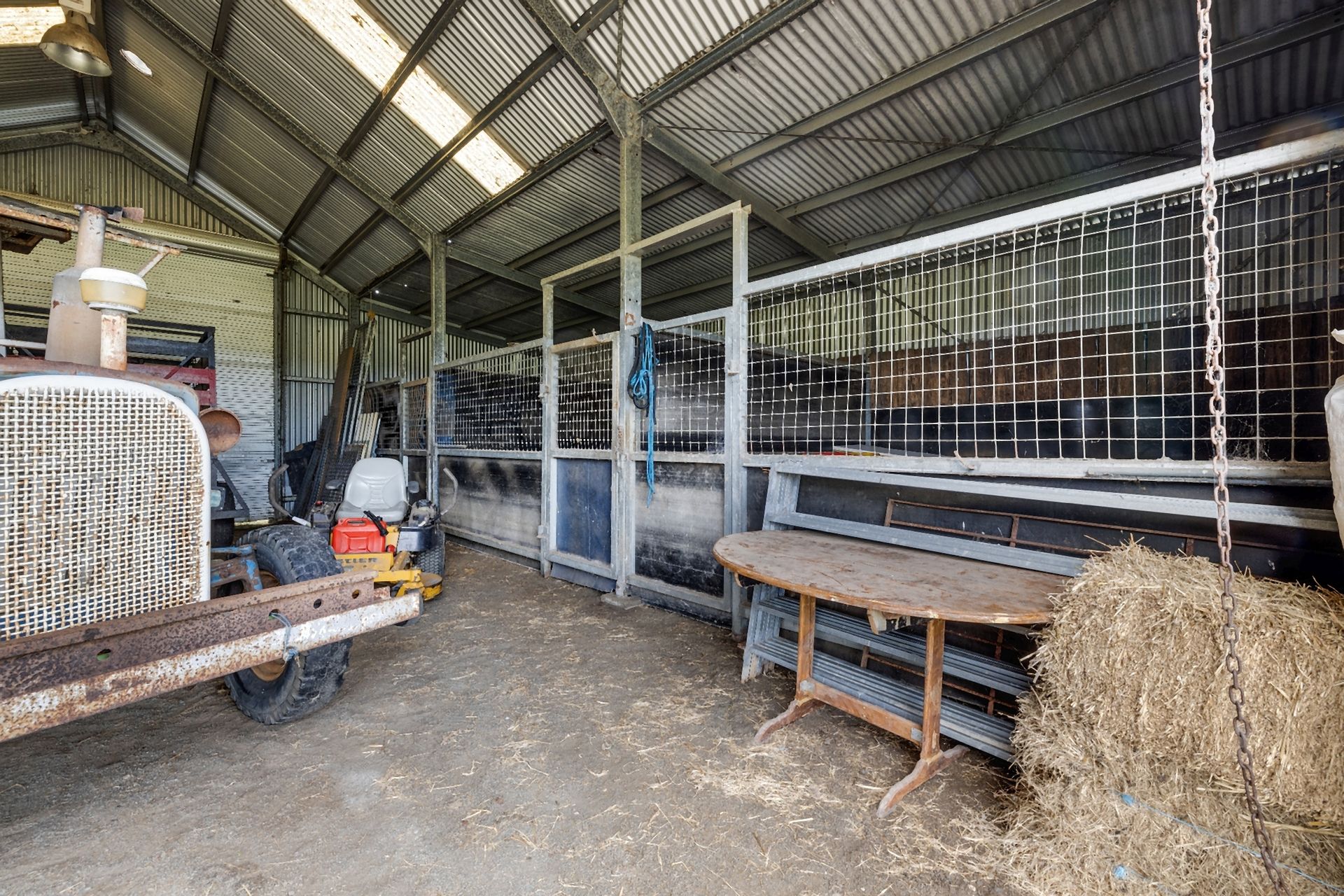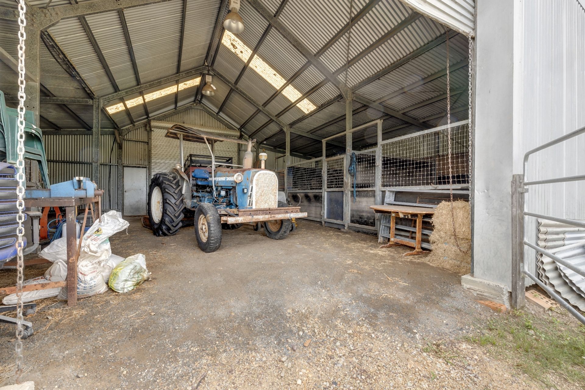 Stepping outside, the secure house yard offers ample space for children's play equipment and three secure dog kennels/runs, before leading into the large, well-fenced paddocks. Designed for easy livestock management, the paddocks are divided into several smaller sections with a central laneway leading to steel stockyards and a large shed with four horse stables. Each paddock has its own trough, all supplied by town water.