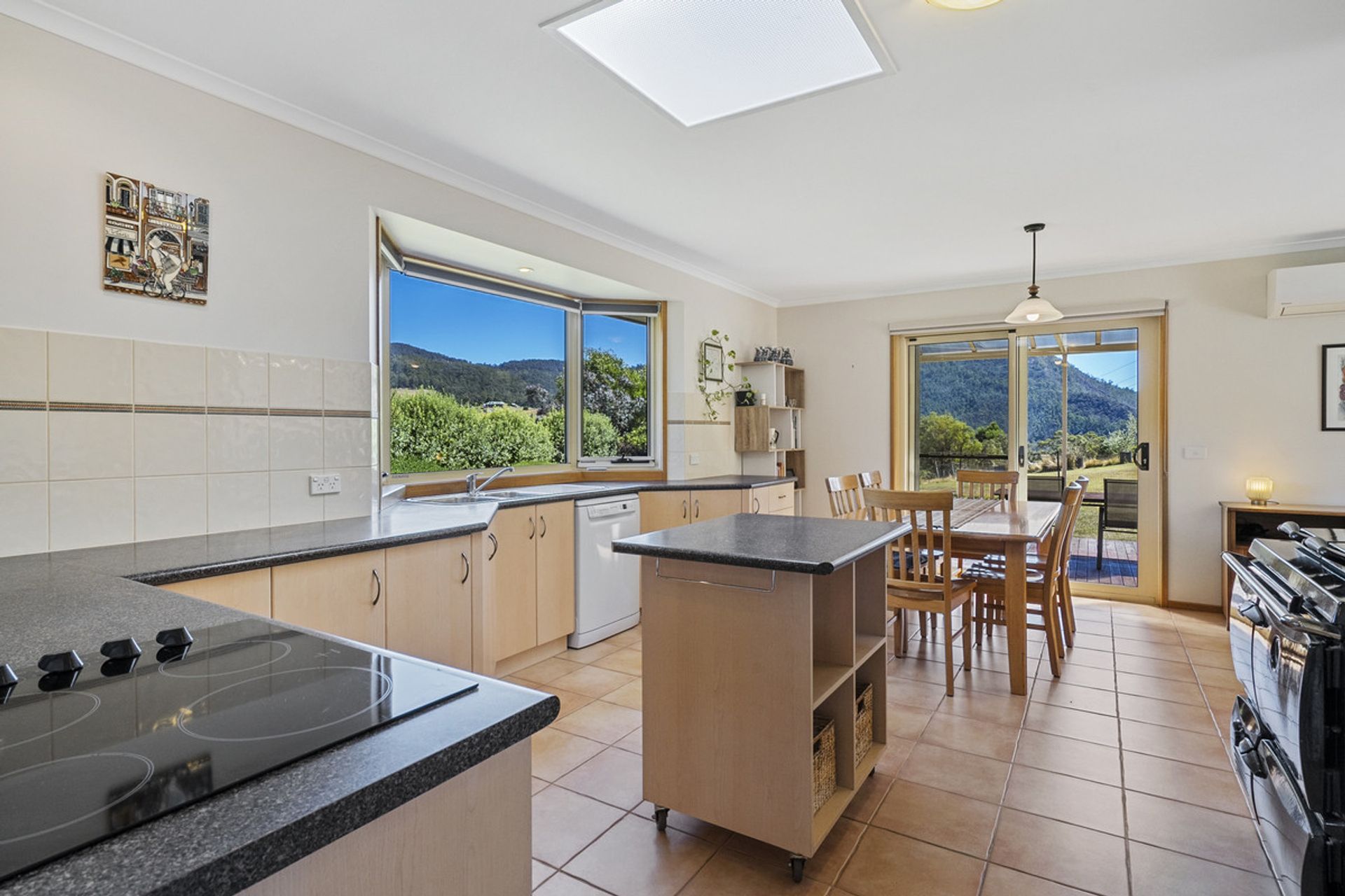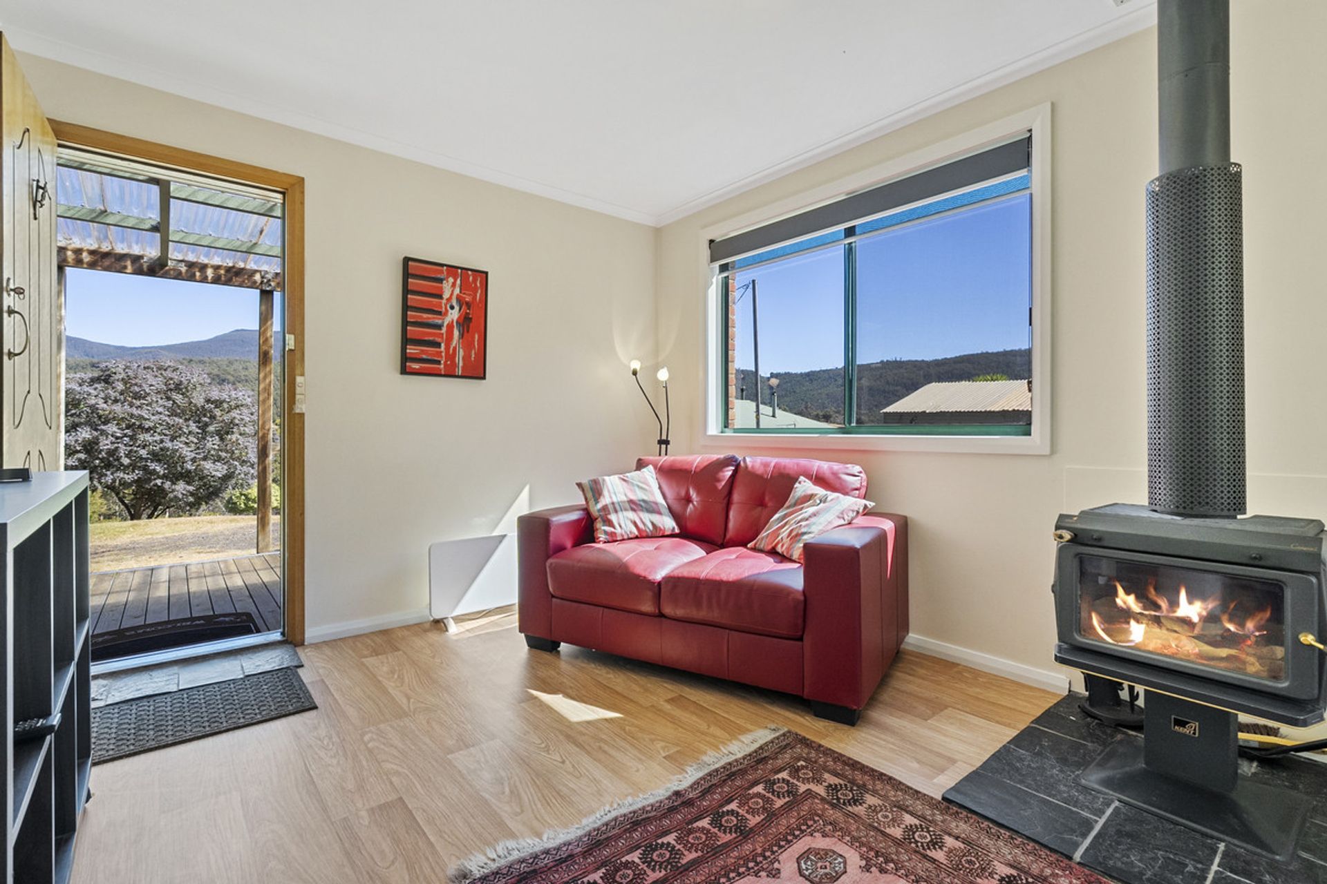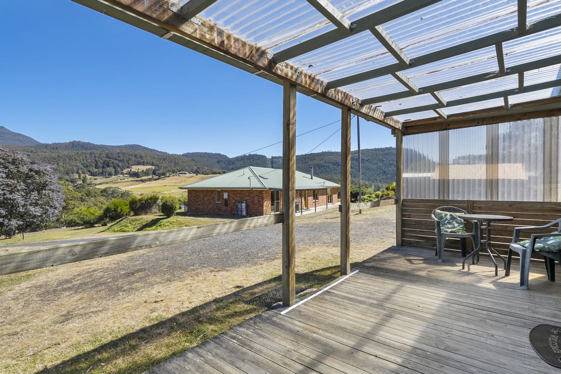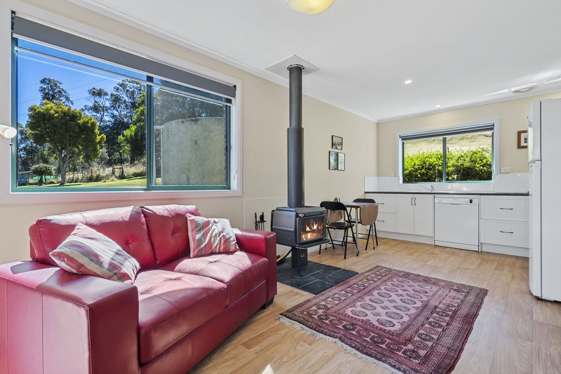Built in 2002, the main residence has been thoughtfully designed to maximize natural light through expansive windows that also frame breathtaking views. The generous living area seamlessly flows into the dining and kitchen space, where a Stanley wood-fired stove with wet back hot water adds warmth and character and energy efficiency. The home features three well-proportioned bedrooms, while the family bathroom includes both a separate shower and bathtub for added convenience.