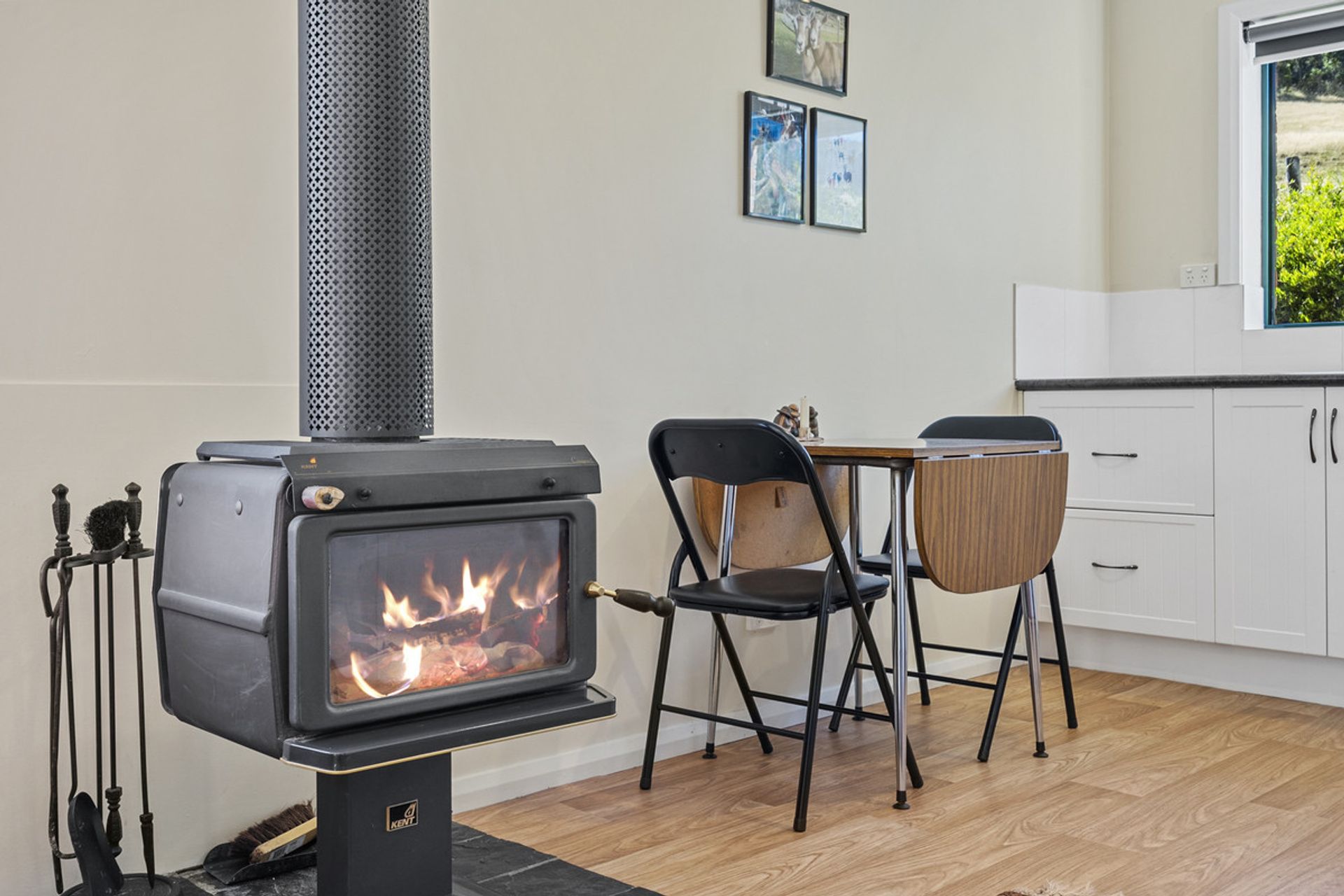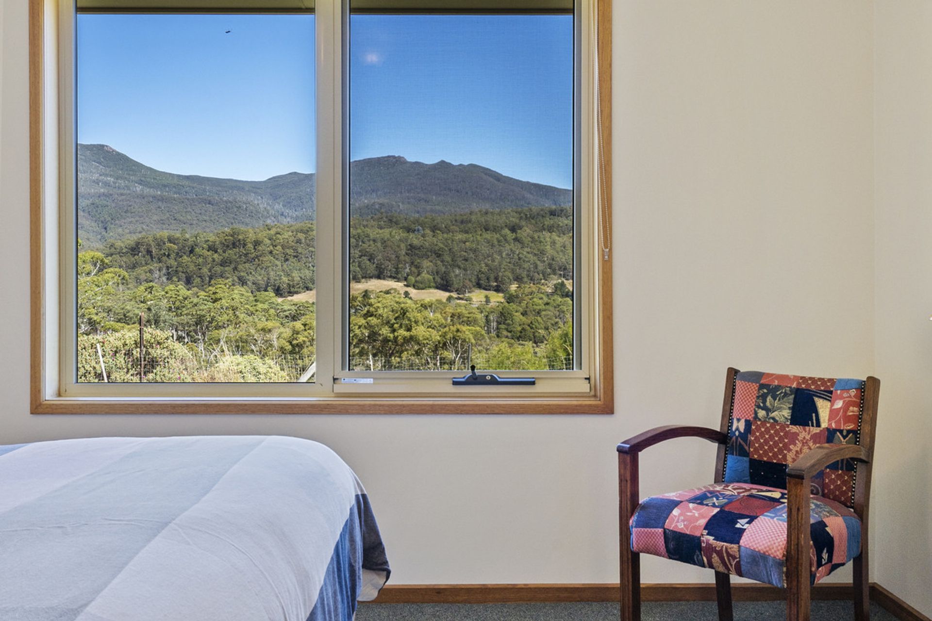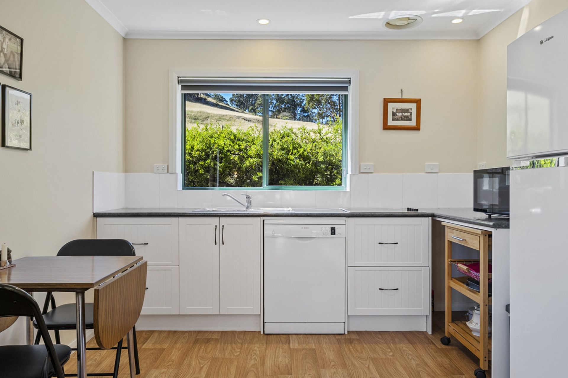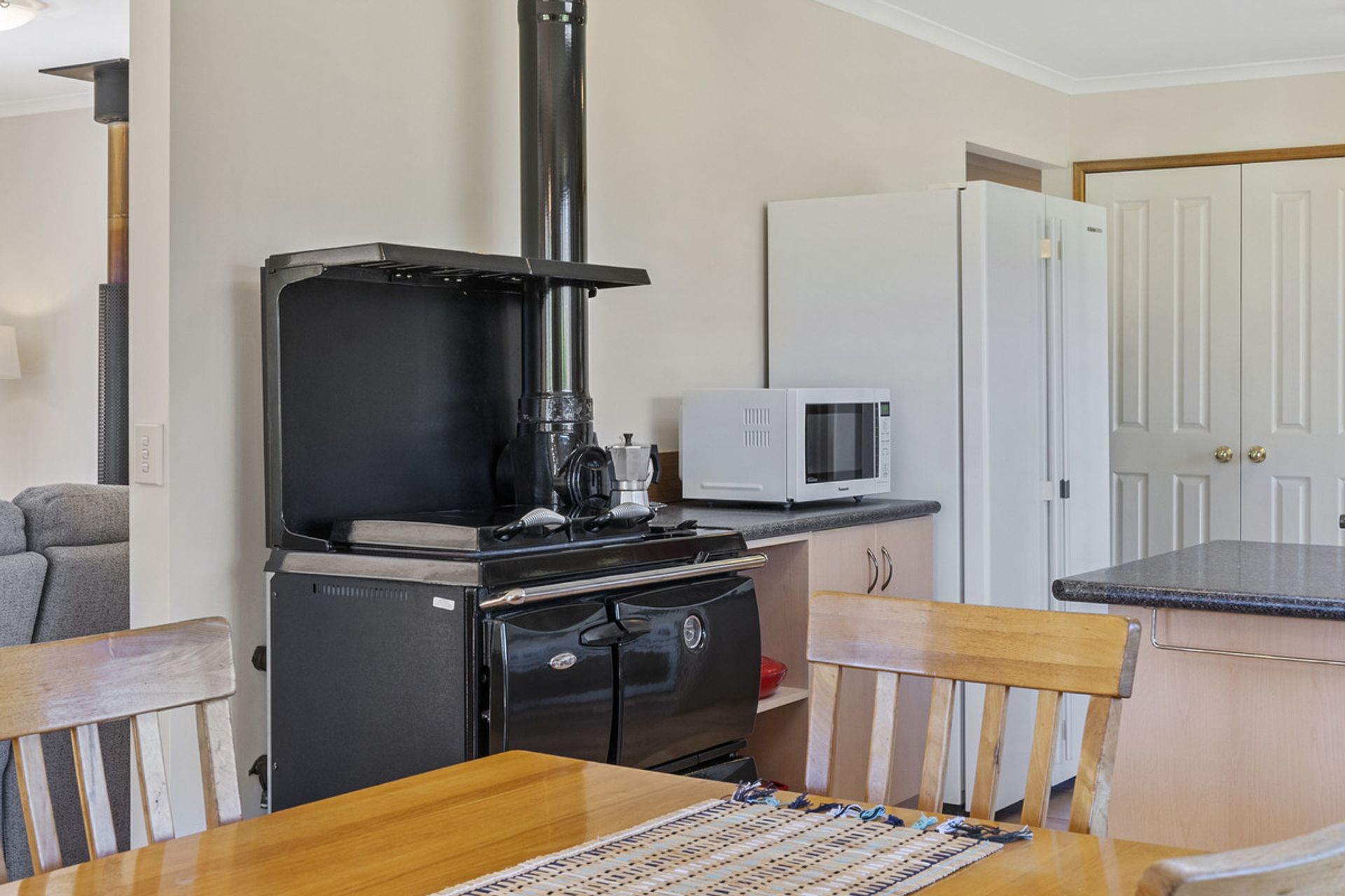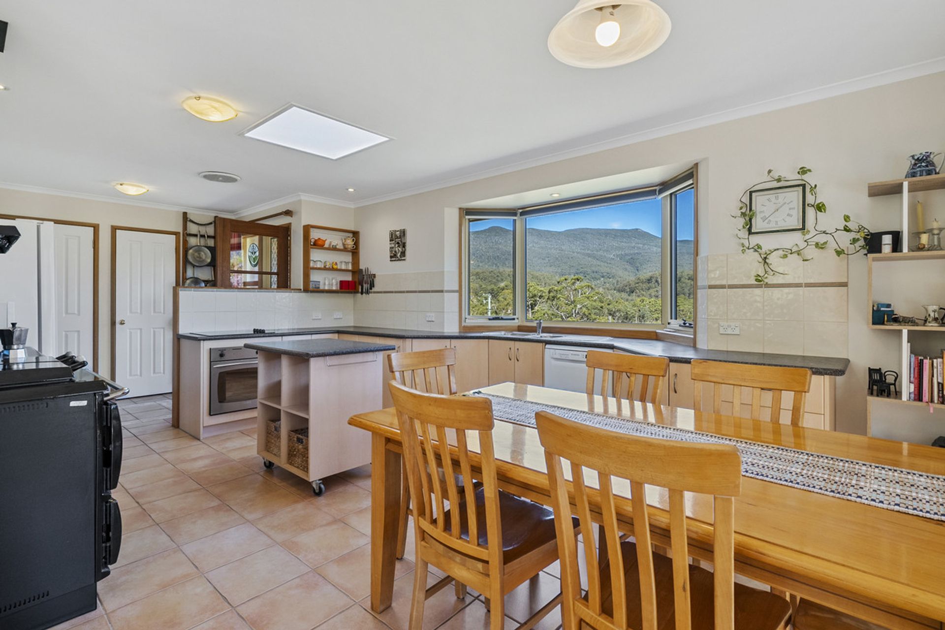 Built in 2002, the main residence has been thoughtfully designed to maximize natural light through expansive windows that also frame breathtaking views. The generous living area seamlessly flows into the dining and kitchen space, where a Stanley wood-fired stove with wet back hot water adds warmth and character and energy efficiency. The home features three well-proportioned bedrooms, while the family bathroom includes both a separate shower and bathtub for added convenience.
