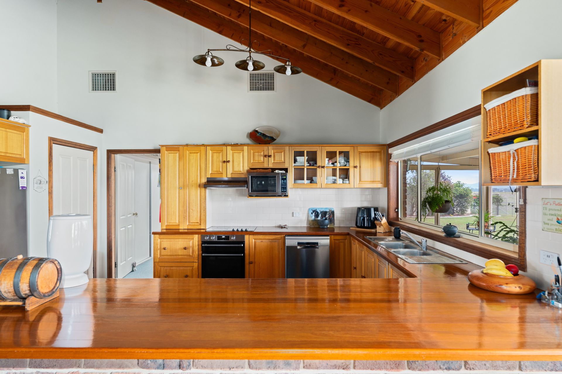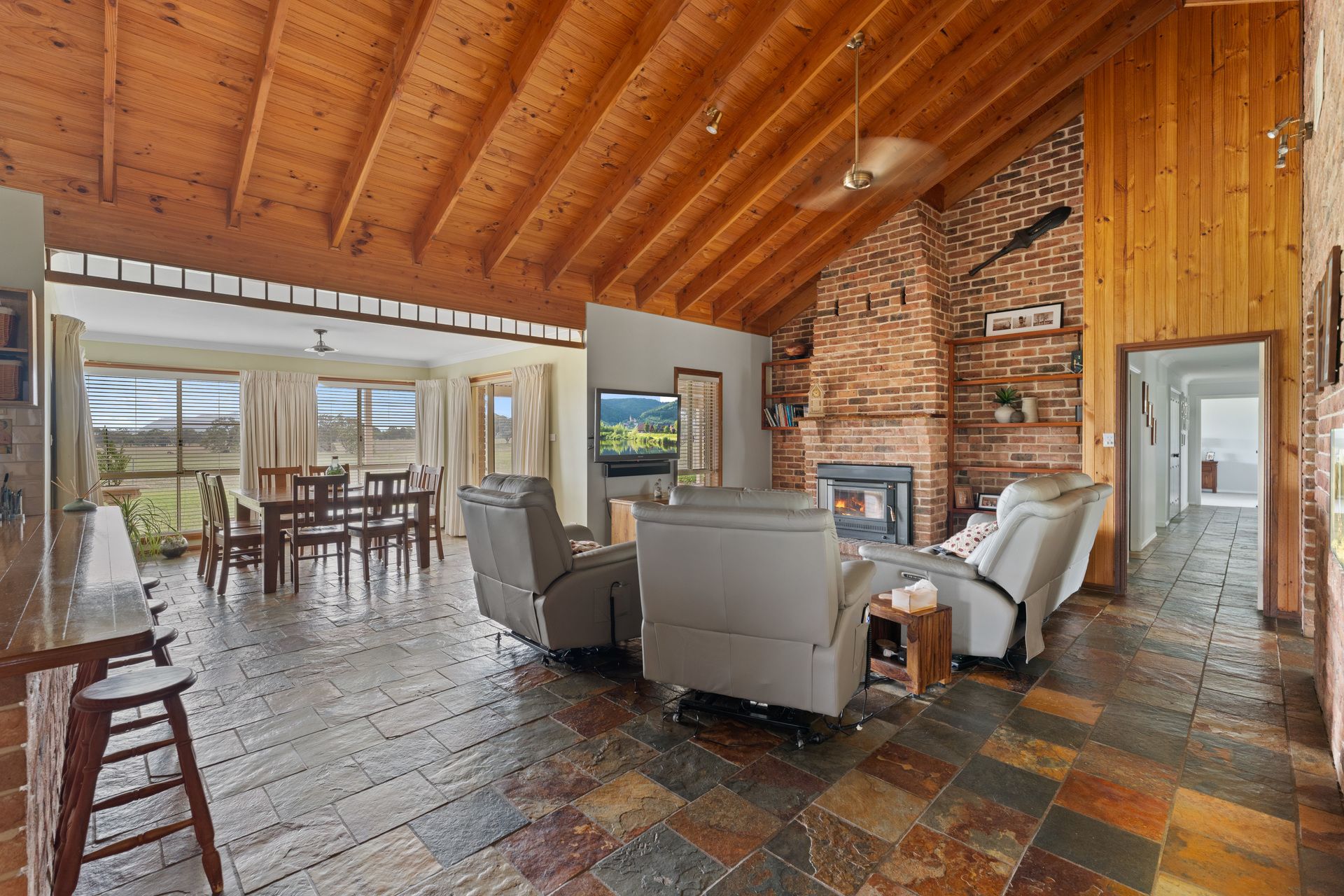 - Open-plan living with vaulted ceilings with striking exposed timber beams all with incredible rural views.
