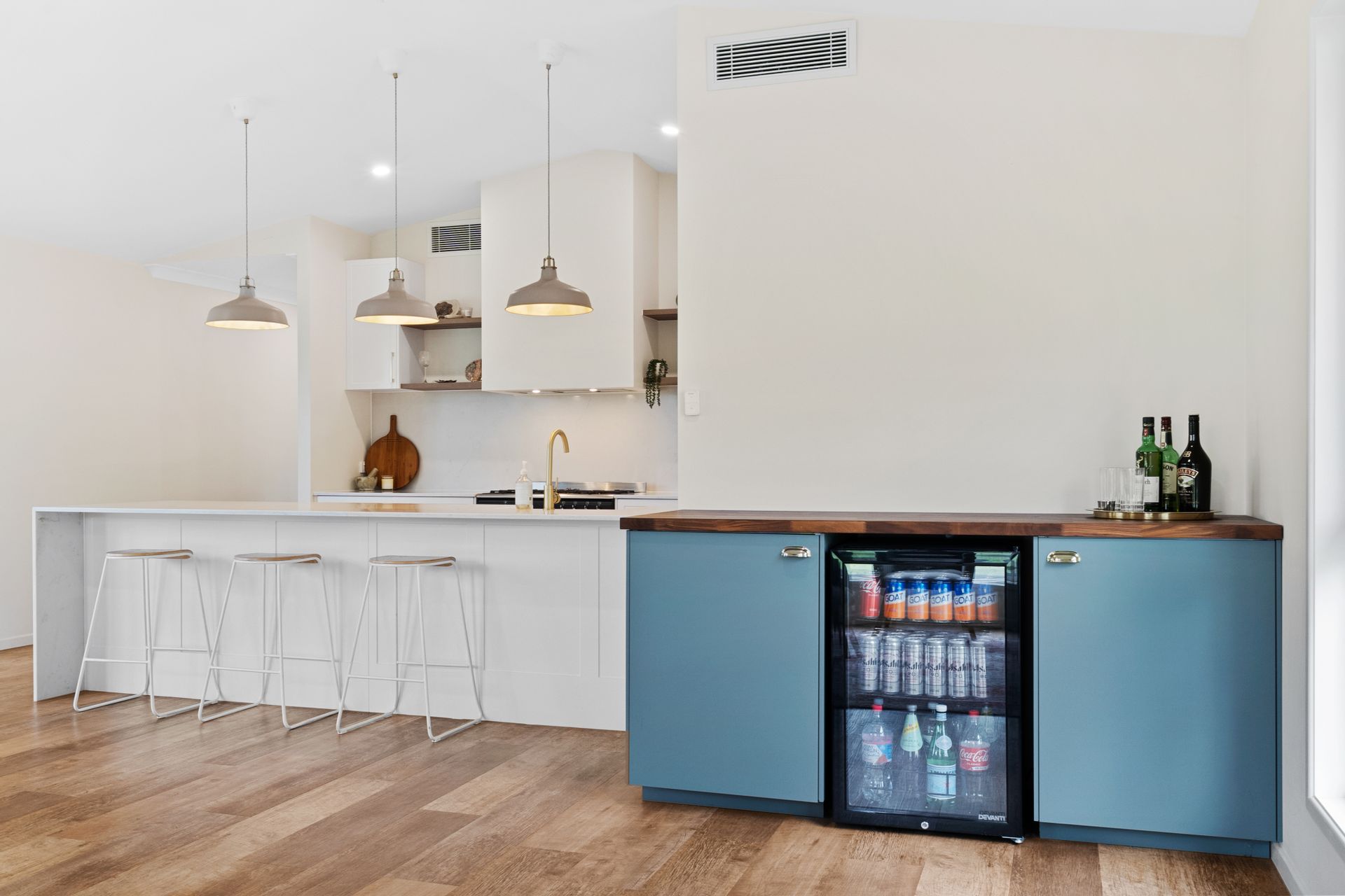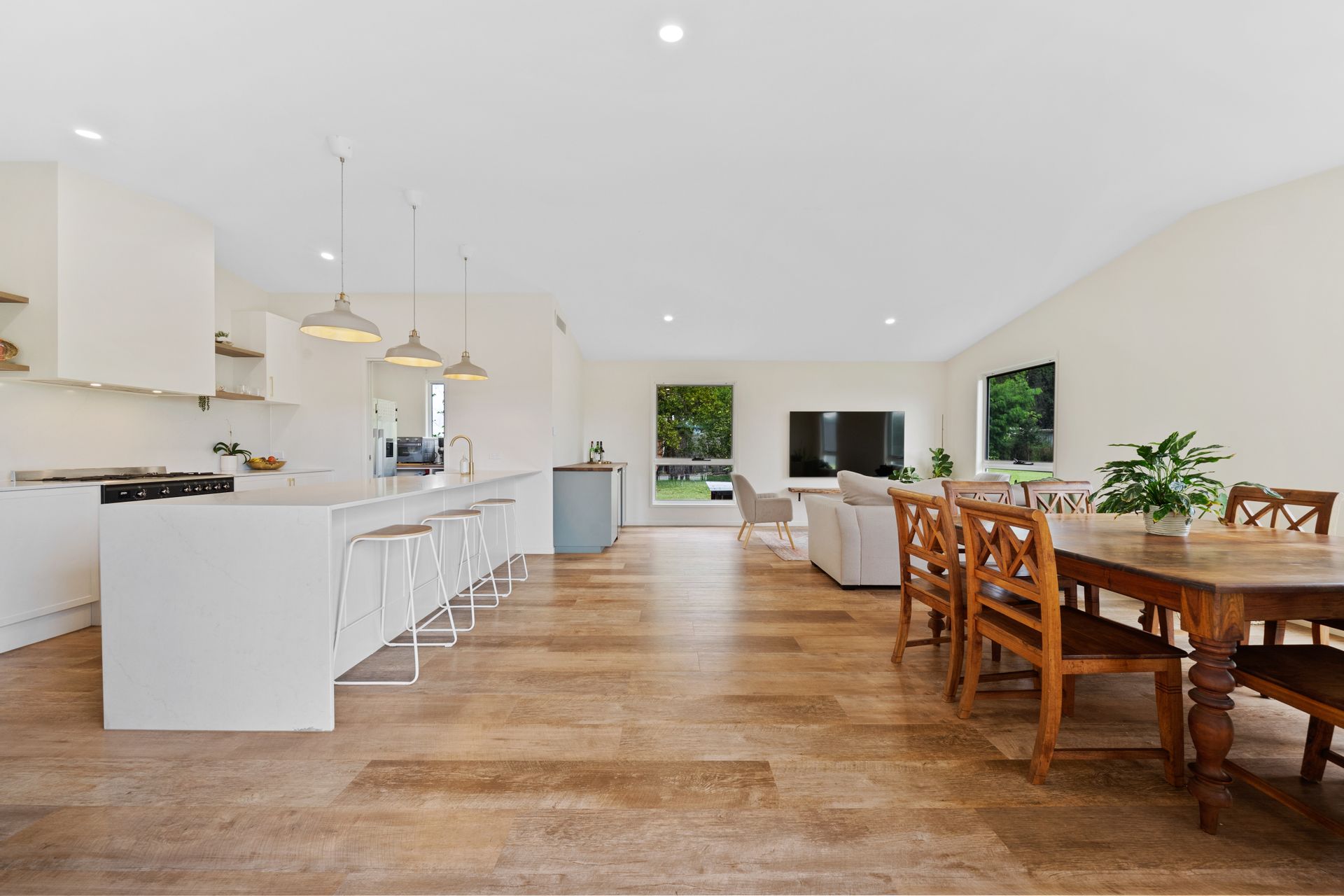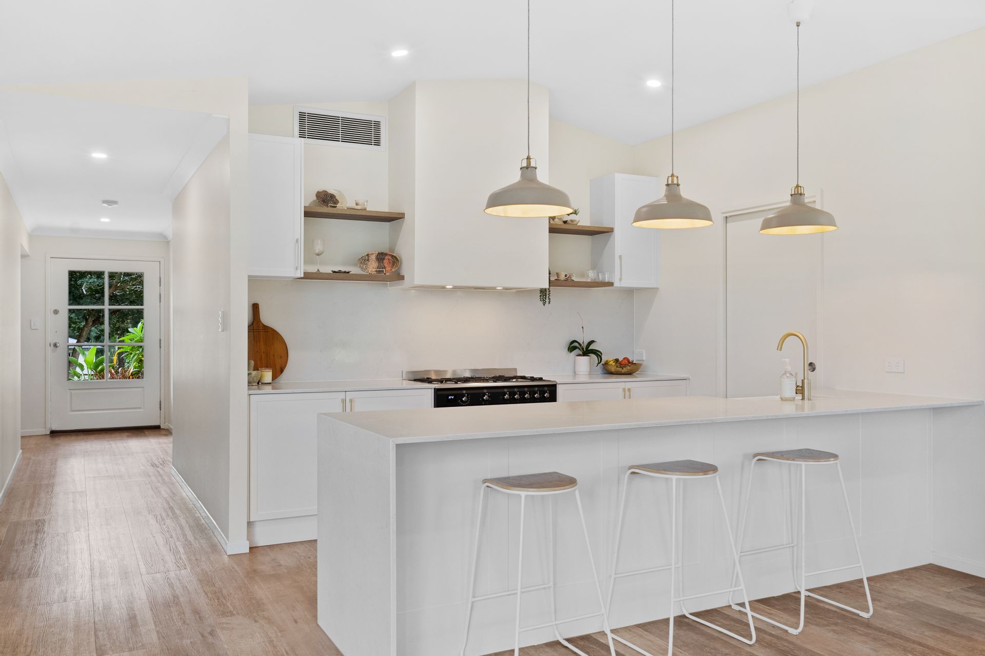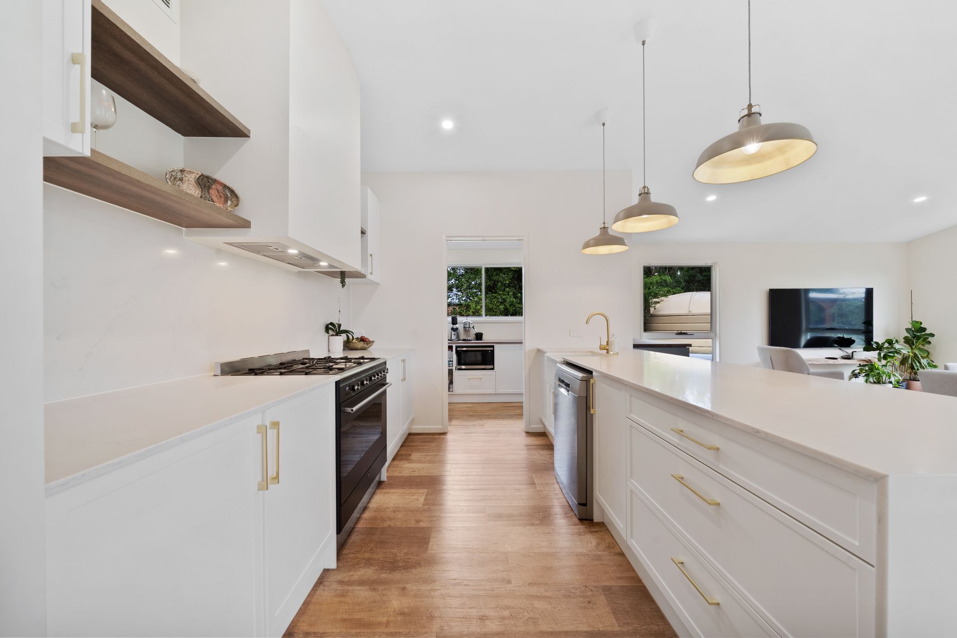 | A stunning, fully renovated kitchen with modern finishes, stone benchtops, ample storage, and a butler's pantry
