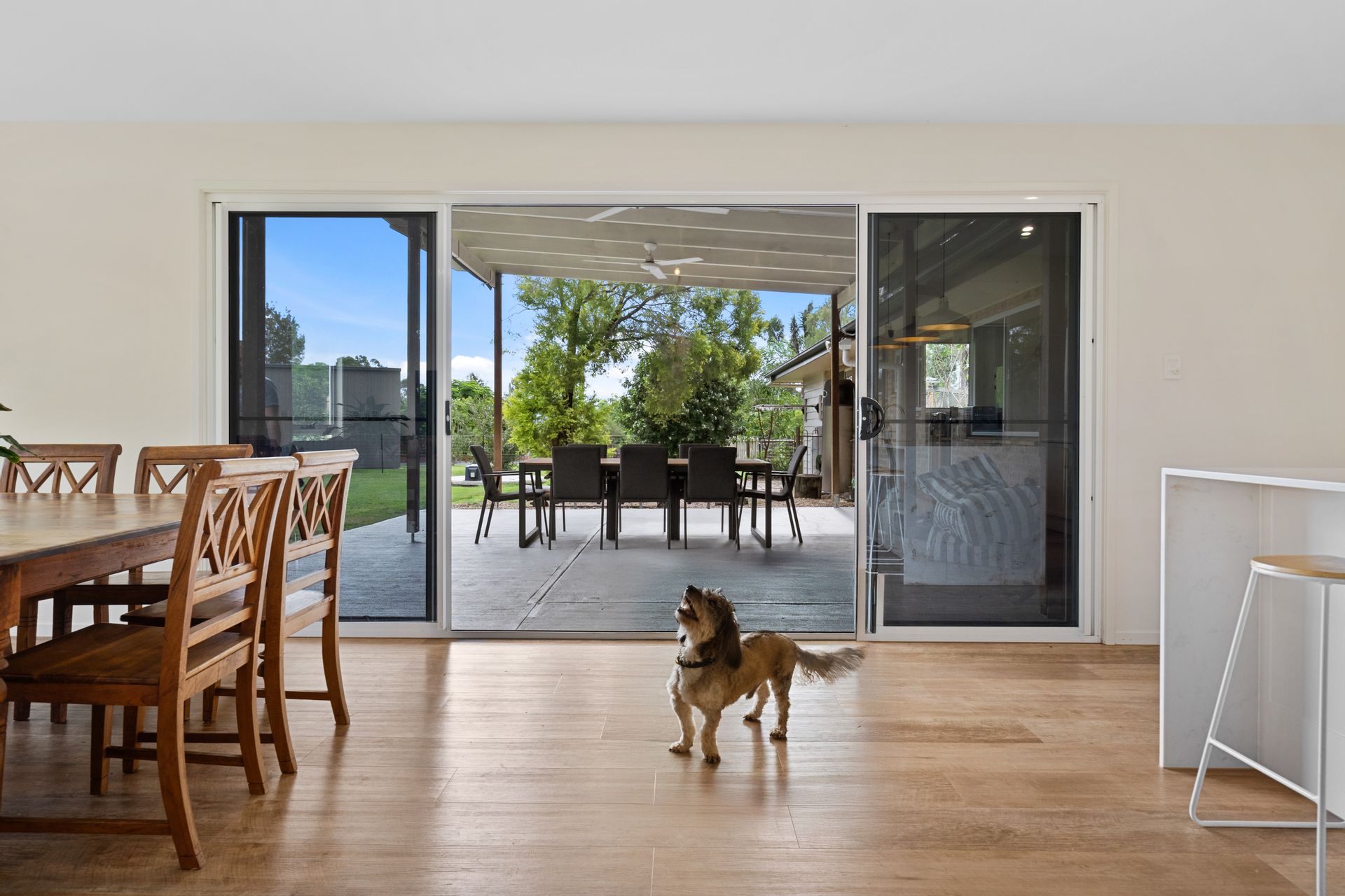 | Open dining area with high ceilings, open windows capturing the view of the entire backyard