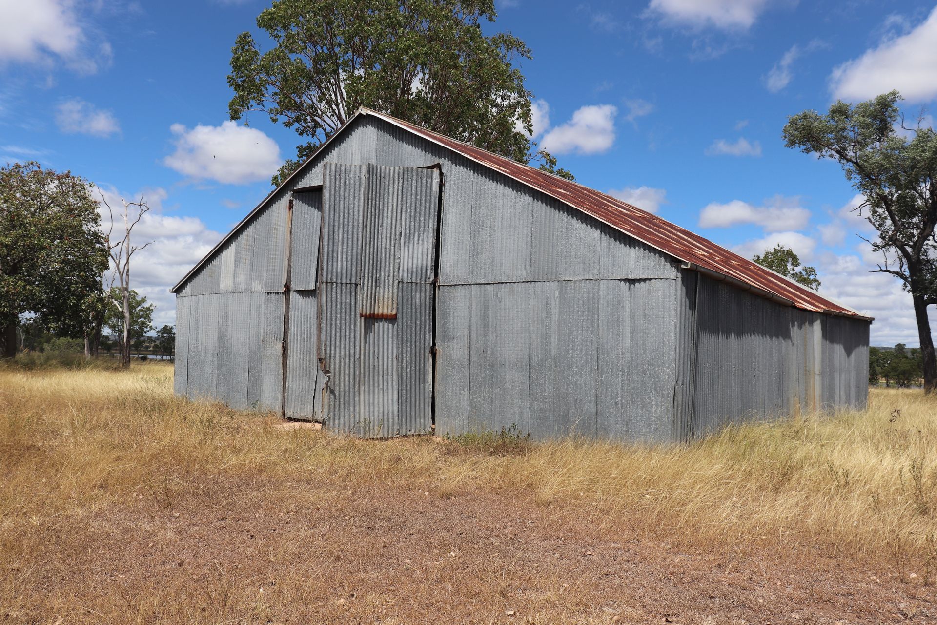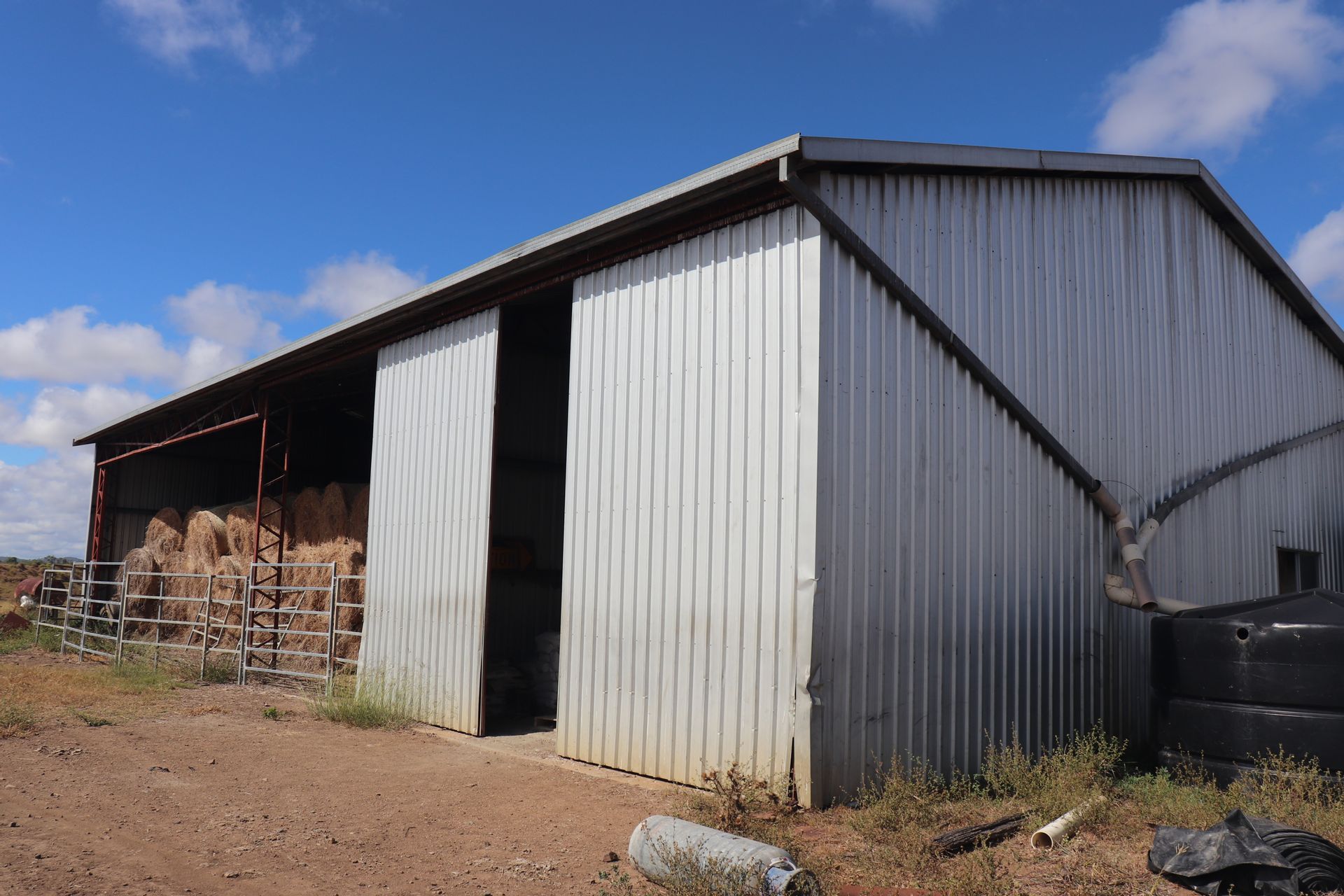 • 4 bay Zincalume shed - 1 bay enclosed with concrete floor, 20m x 20m Zincalume hay shed, 2x grain silos