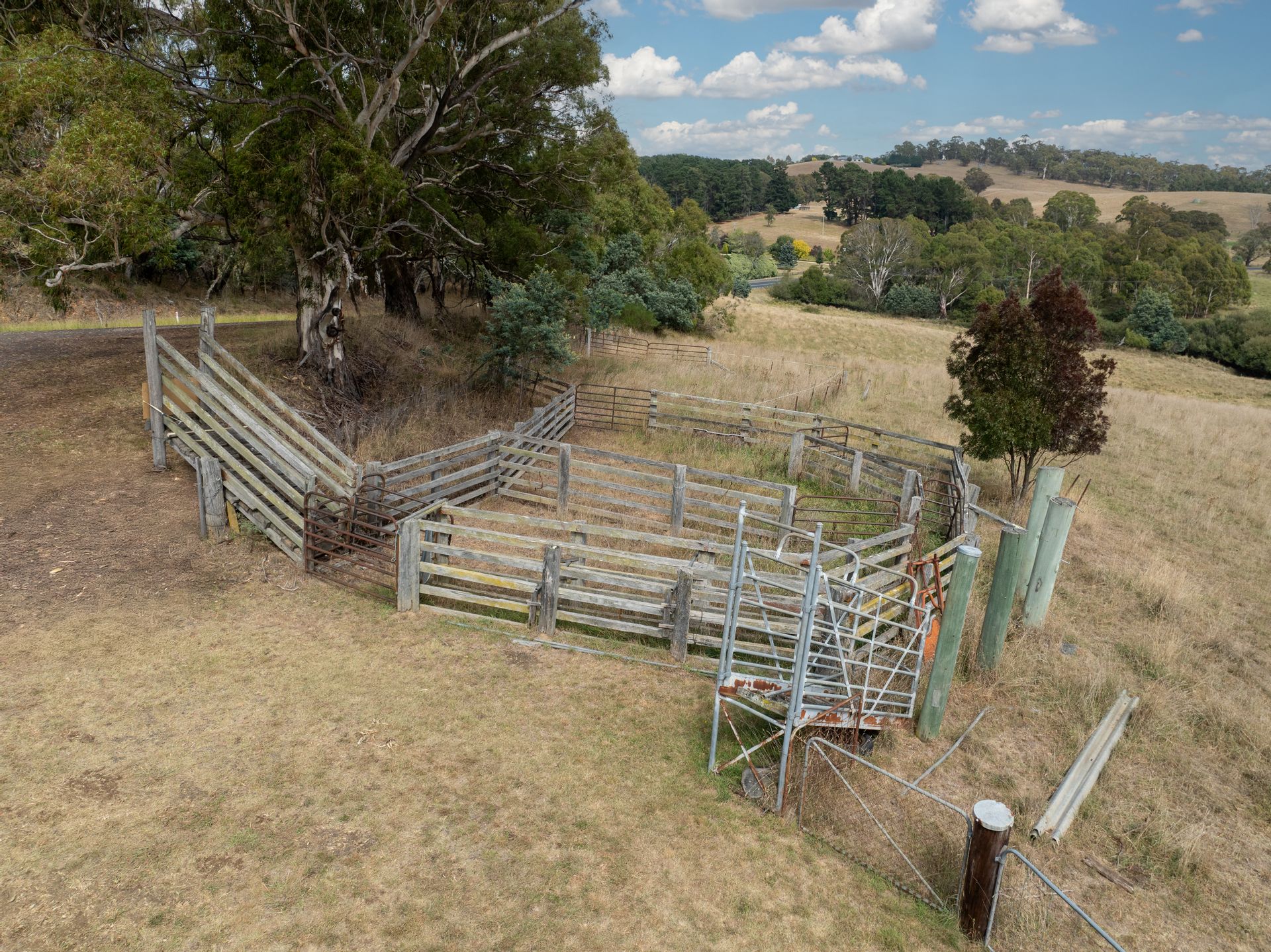 • Timber and steel set of cattle yards with two loading ramps.
