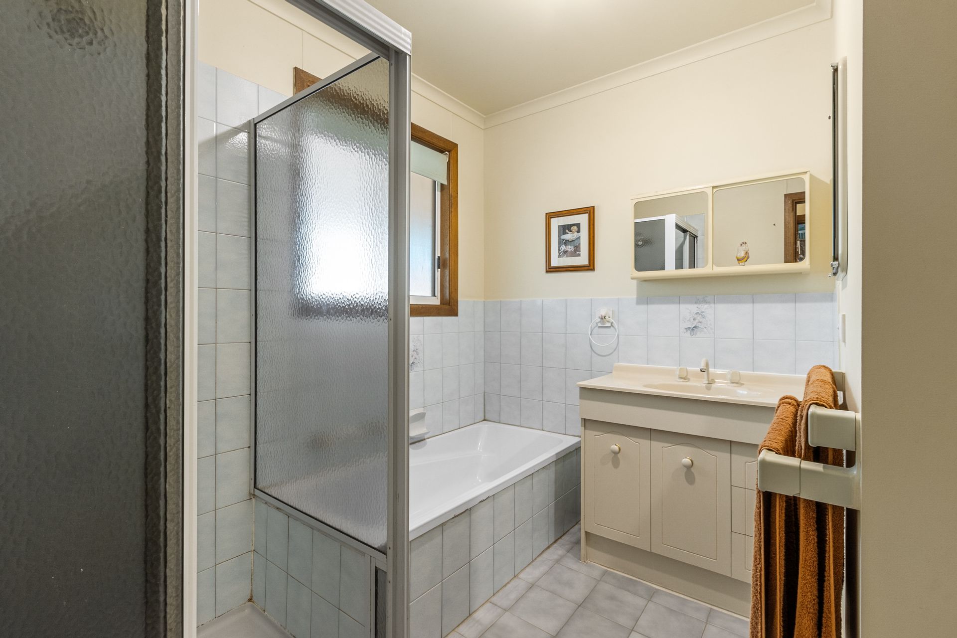 The functional kitchen is designed with practicality in mind, offering abundant cupboard space and a dishwasher. A well-appointed bathroom includes a bath, shower, and vanity, while a separate W/C adds convenience for family and guests.