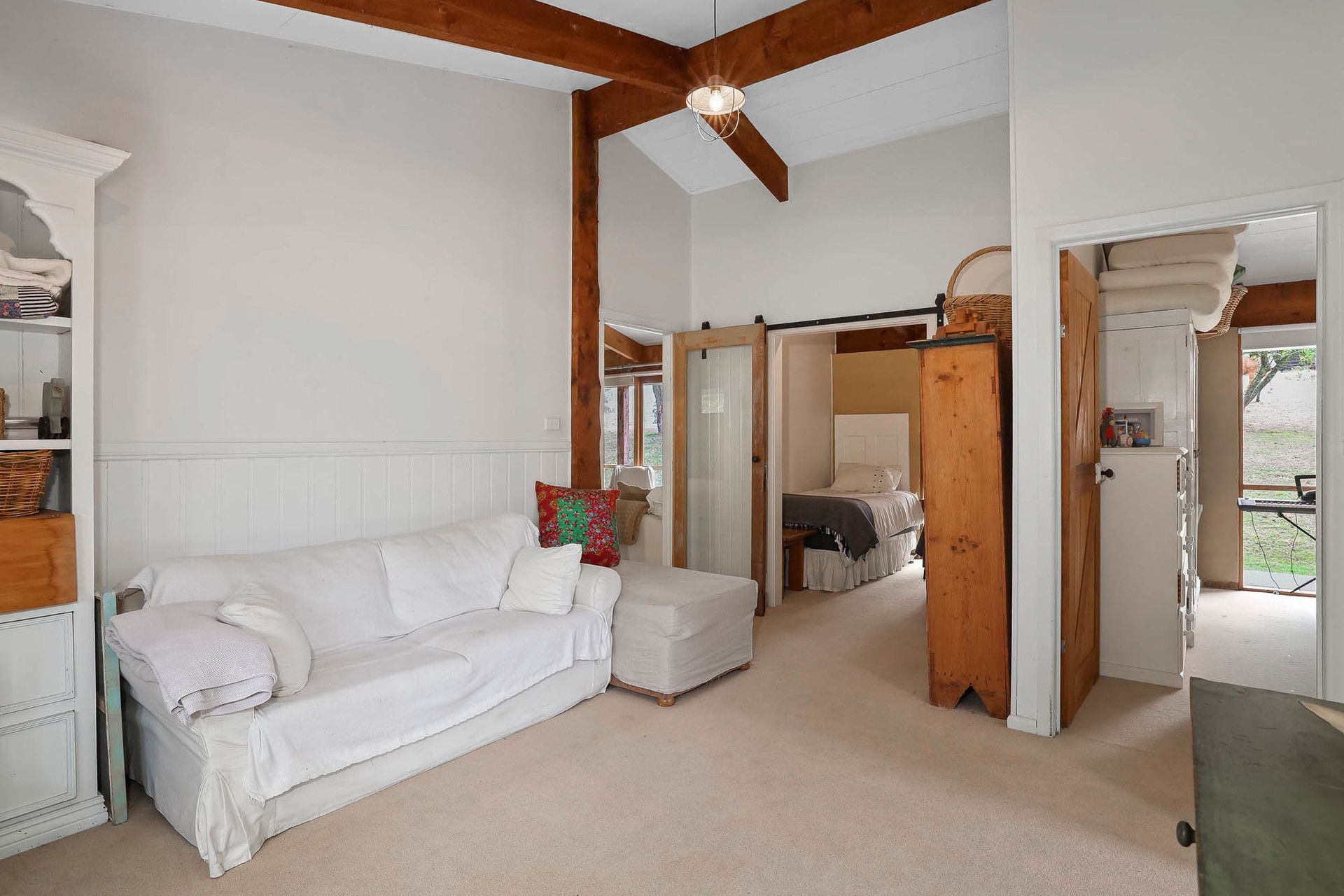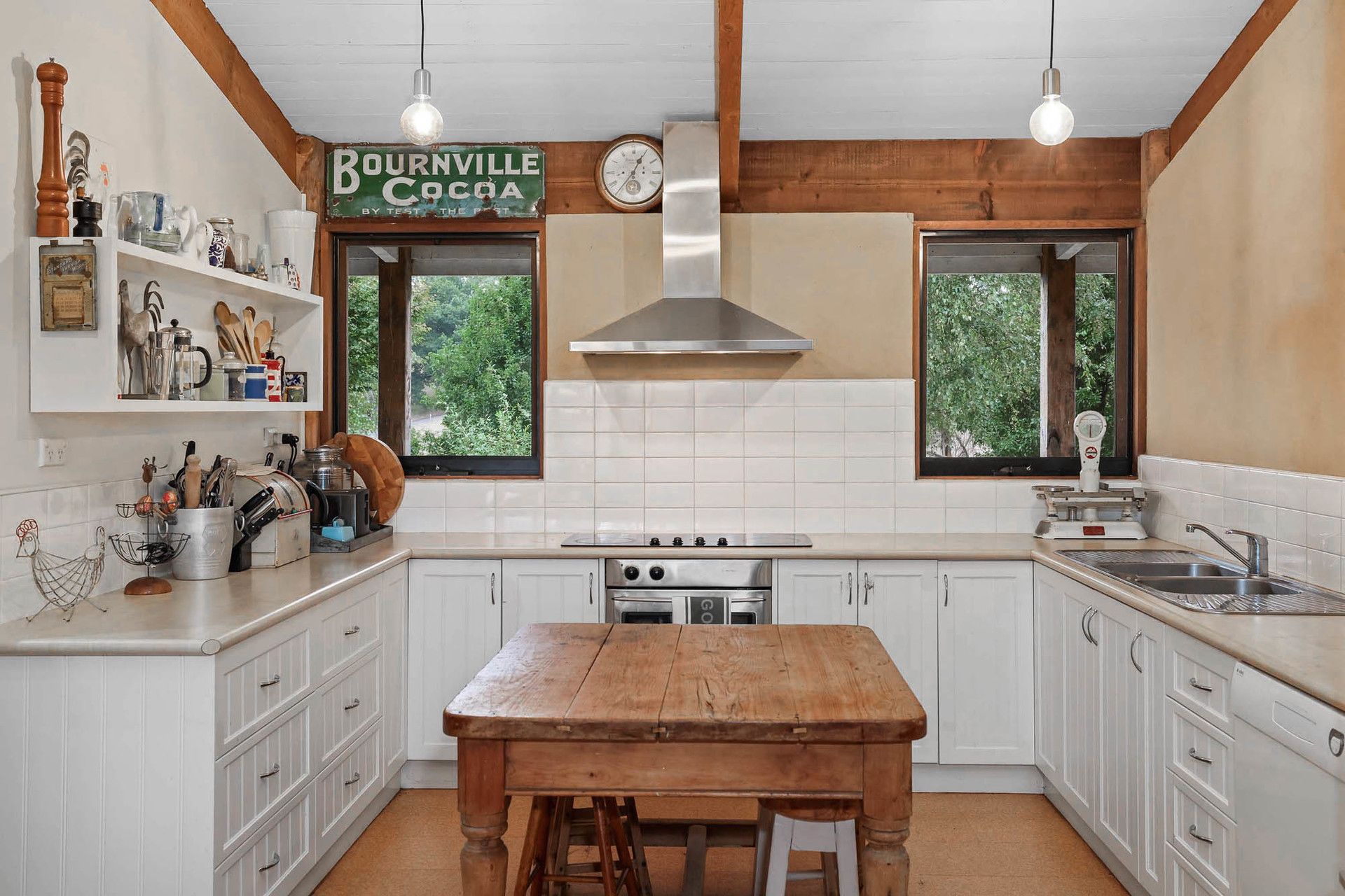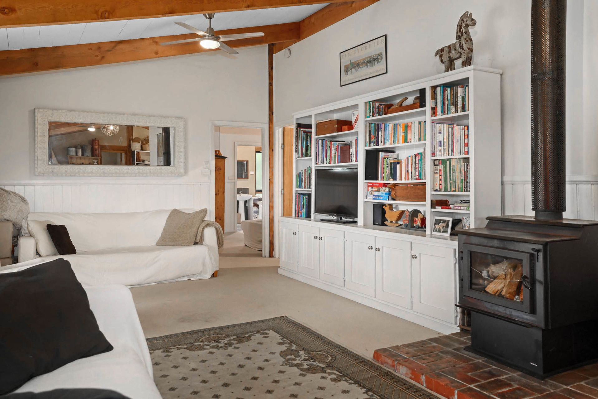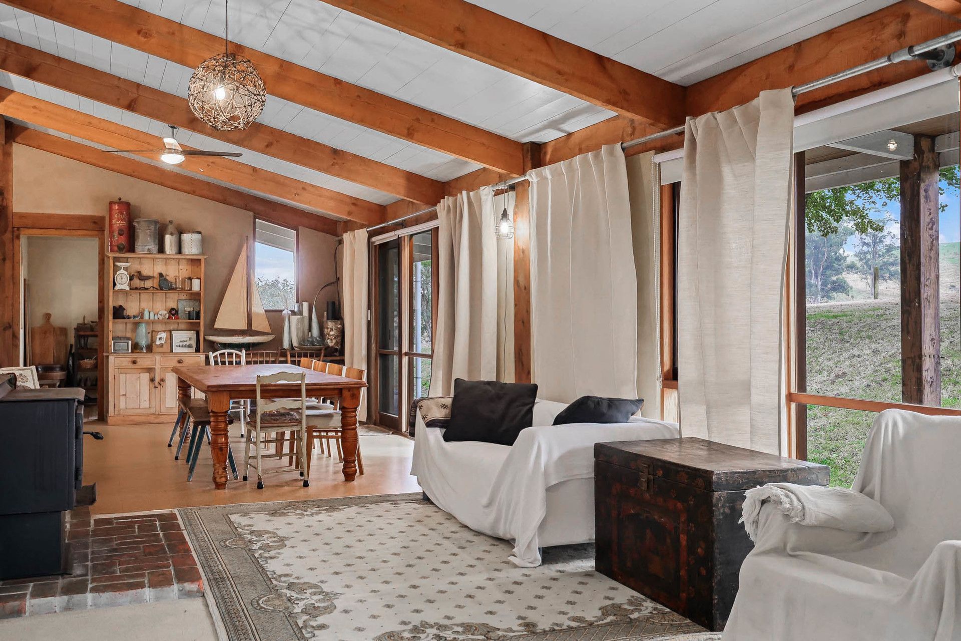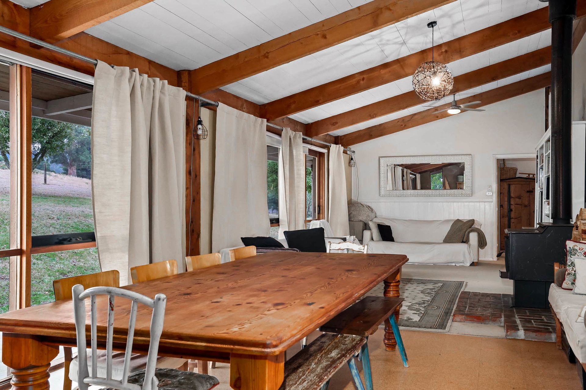 Upon entering, you'll find a spacious entry/mudroom leading to a modern farmhouse-style kitchen, complete with dishwasher and a large walk-in pantry with ample storage. The open-plan living area, enhanced by beautiful timber features, is both inviting, practical and functional. The home is warmed in winter by a large solid fuel heater, creating a cozy atmosphere throughout the colder months.