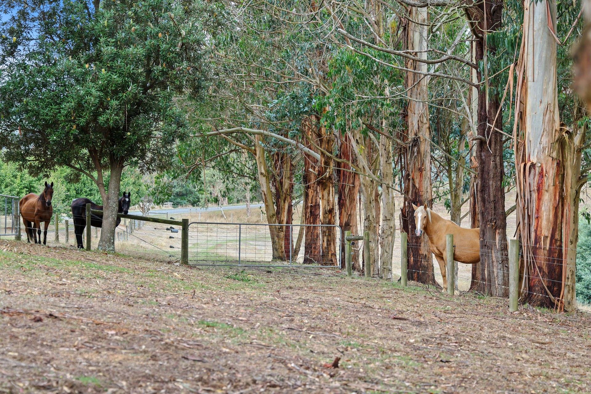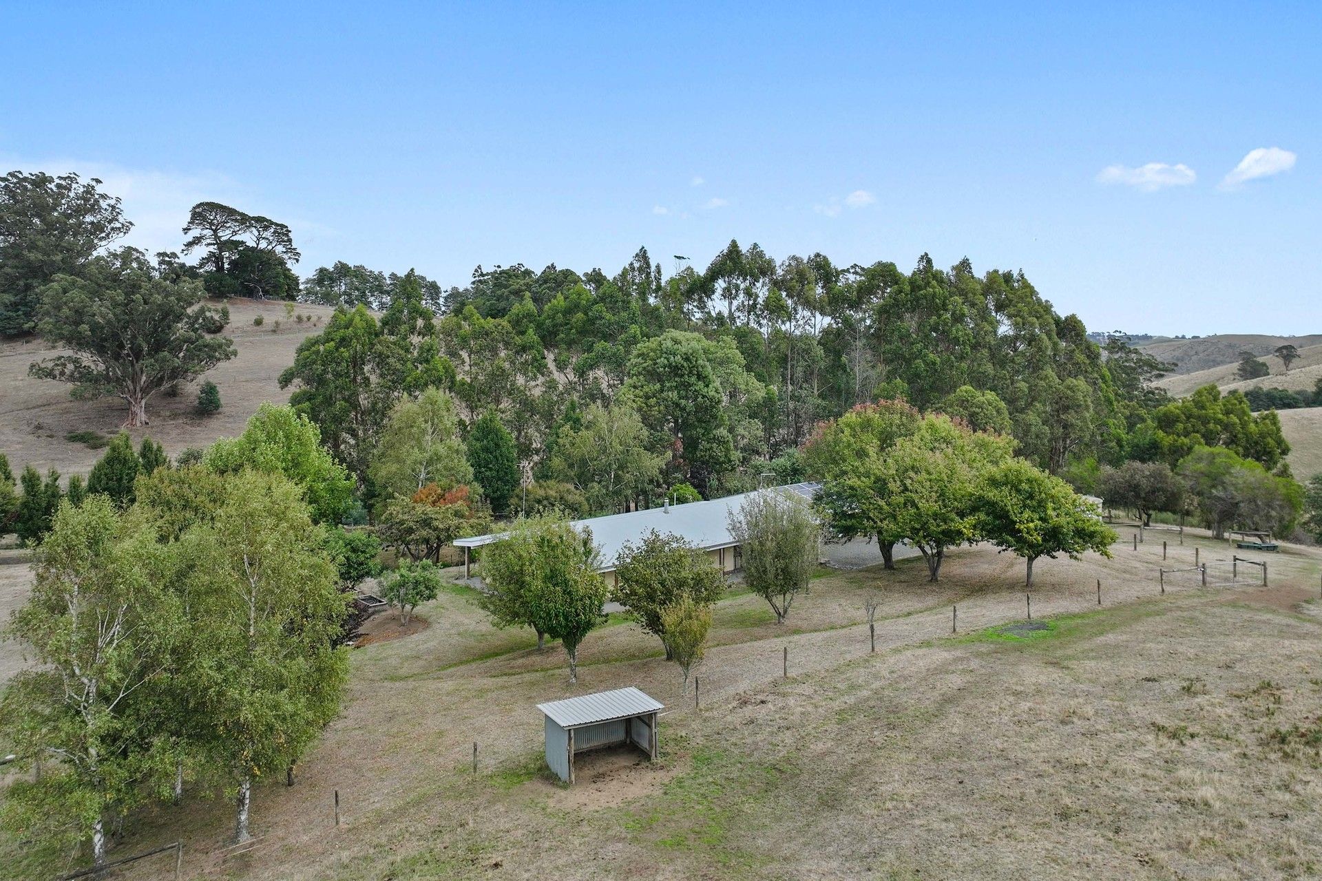 External features include a mud brick double carport, an attached 7x4m workshop, and gravel parking area. The property is well-fenced and offers five main paddocks for grazing, complete with vehicle access. The property also includes natural bushland, with towering eucalyptus trees and creeks running through, adding to the diversity and beauty of the landscape.