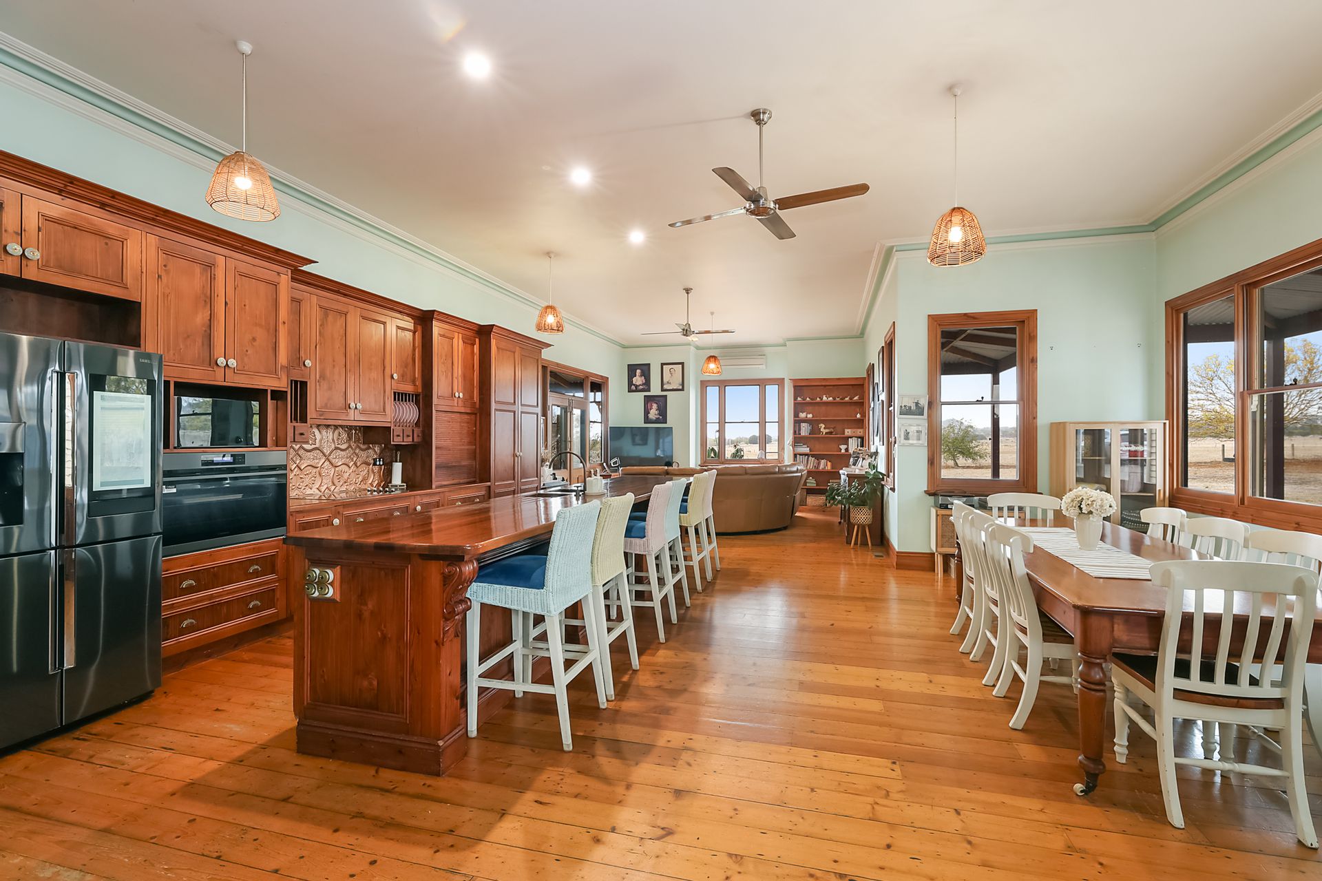 The vast open plan living zone, the centrepiece of the home, features large timber windows that flood the space with natural light, and coupled with the expansive undercover patio, it's the perfect setting for relaxed everyday living no matter the season. Thanks to the spacious gourmet kitchen featuring timber bench tops, a 900ml oven, an oversized island bench and dishwasher, family catch ups and effortless entertaining is most certainly assured.