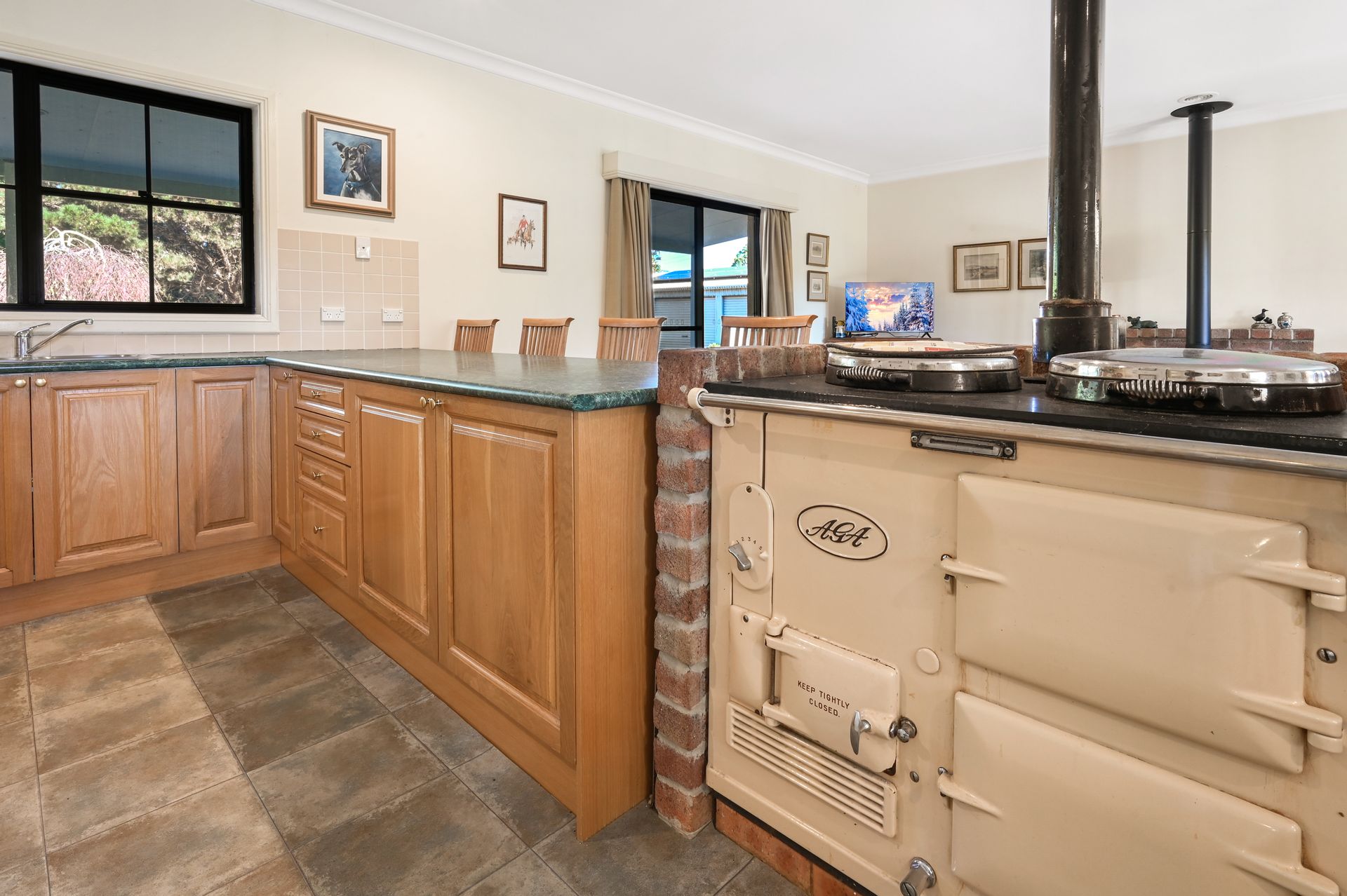 - The open-plan family, casual dining, and living area connects seamlessly to a versatile timber kitchen featuring a pantry, large fridge space, dishwasher, and a stunning AGA wood stove.