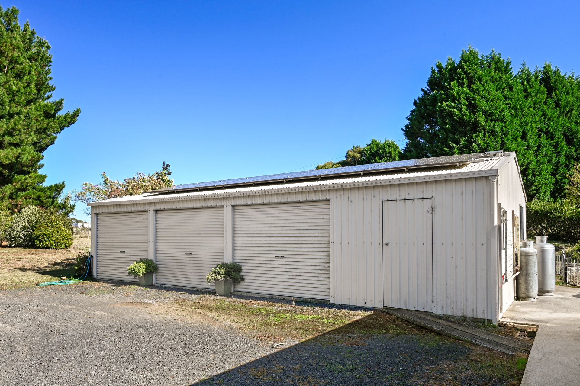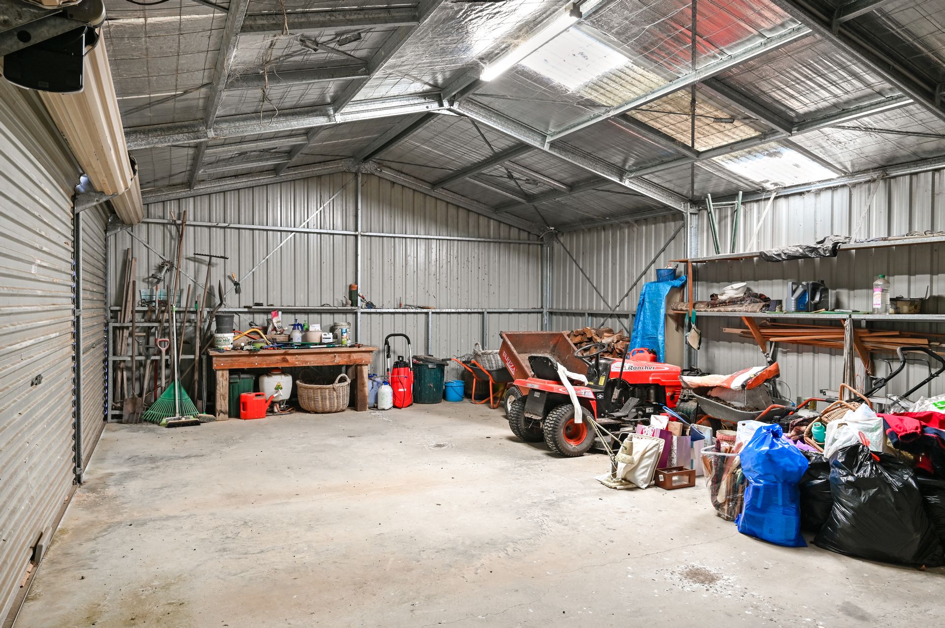 - Four bay garage with three roller doors, one enclosed end with shelving for the ultimate workshop and storage.