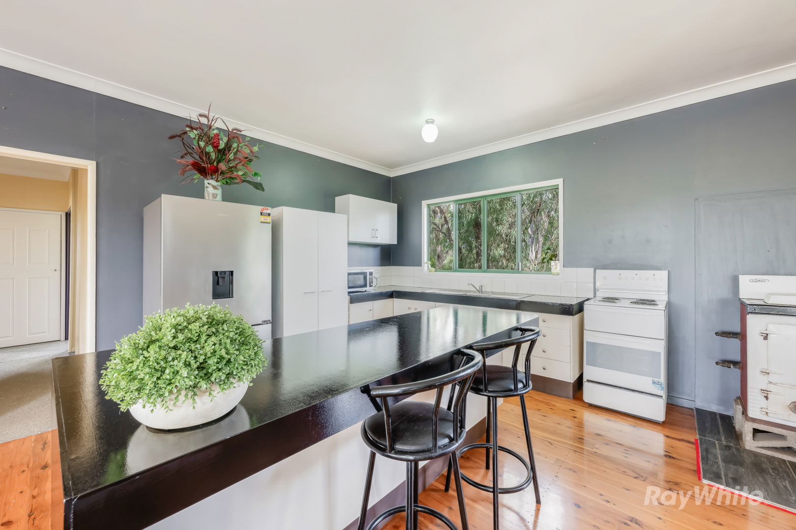 - Kitchen features Electric Stove, Island Bench & Breakfast Bar as well as an Antique Woodburning Stove