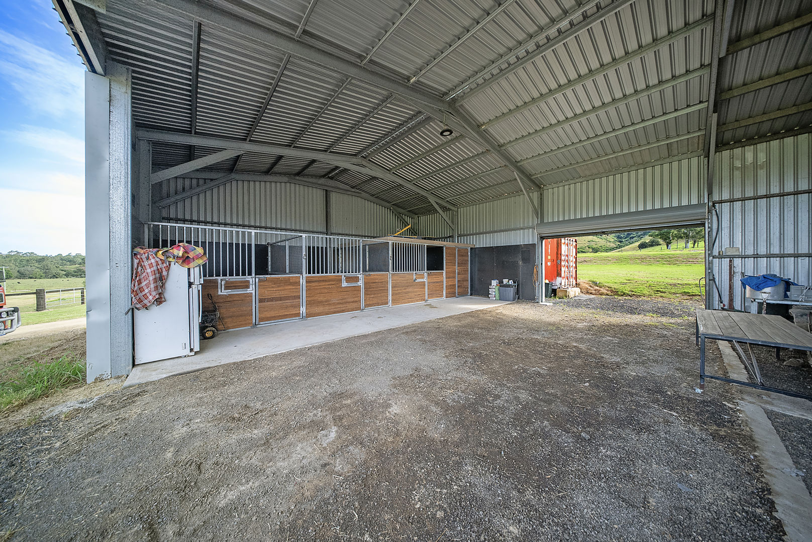 • 30m x 12m rural shed with concrete bay, 3 stables, tack room & drive-through access