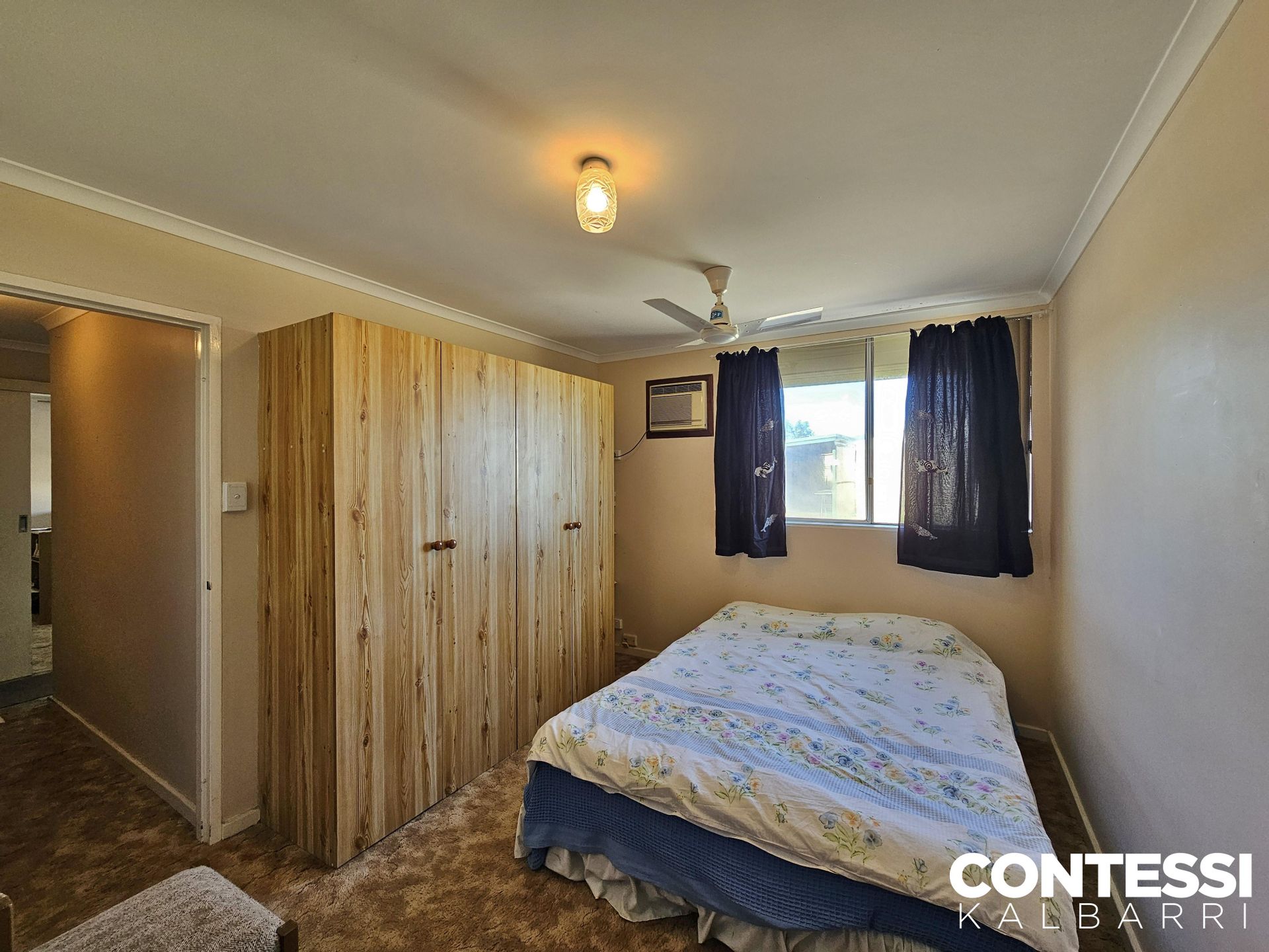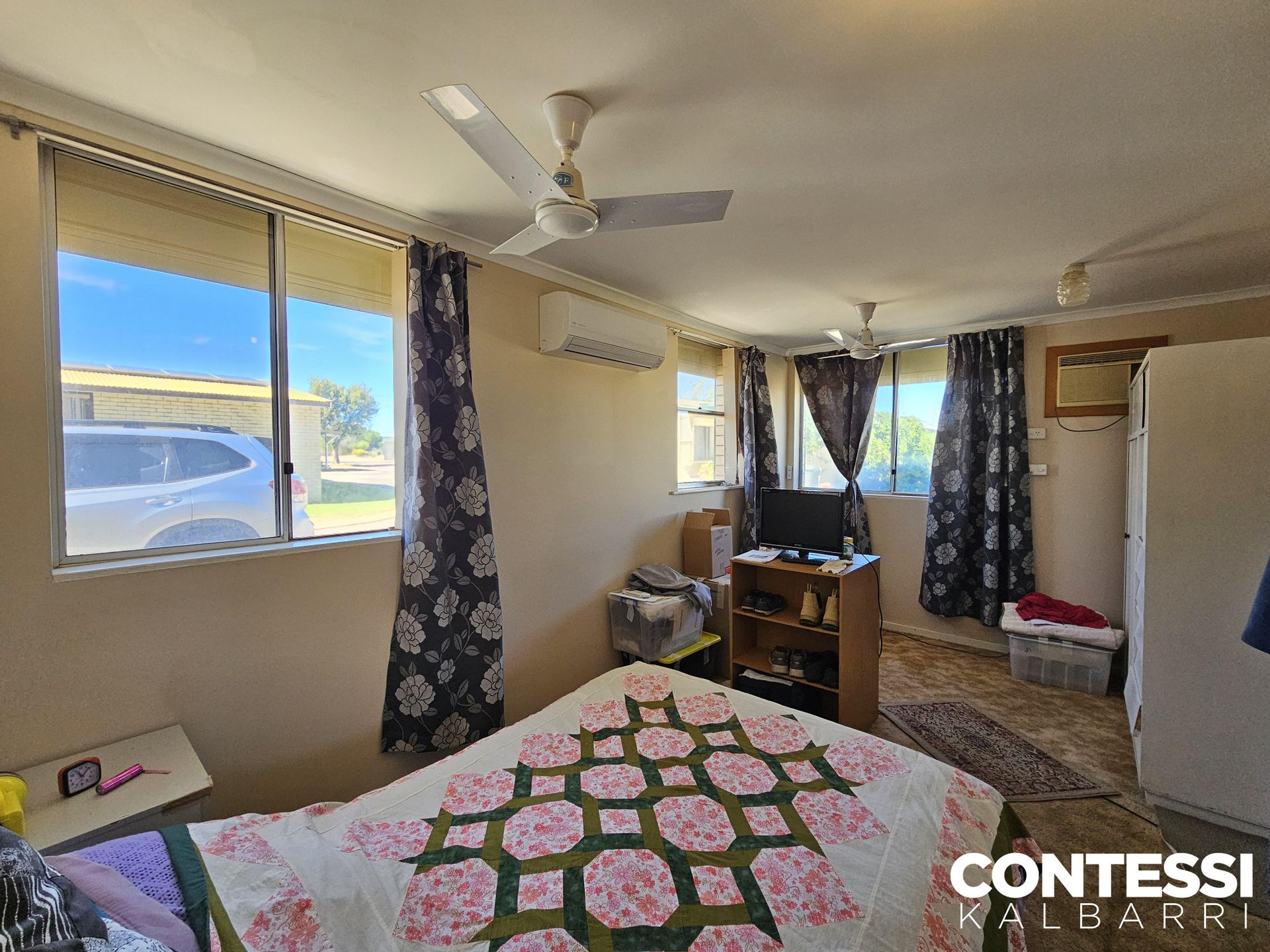 • Bedroom 2: Air-conditioning, built-in robe, ceiling fan, and roller shutters on all three windows