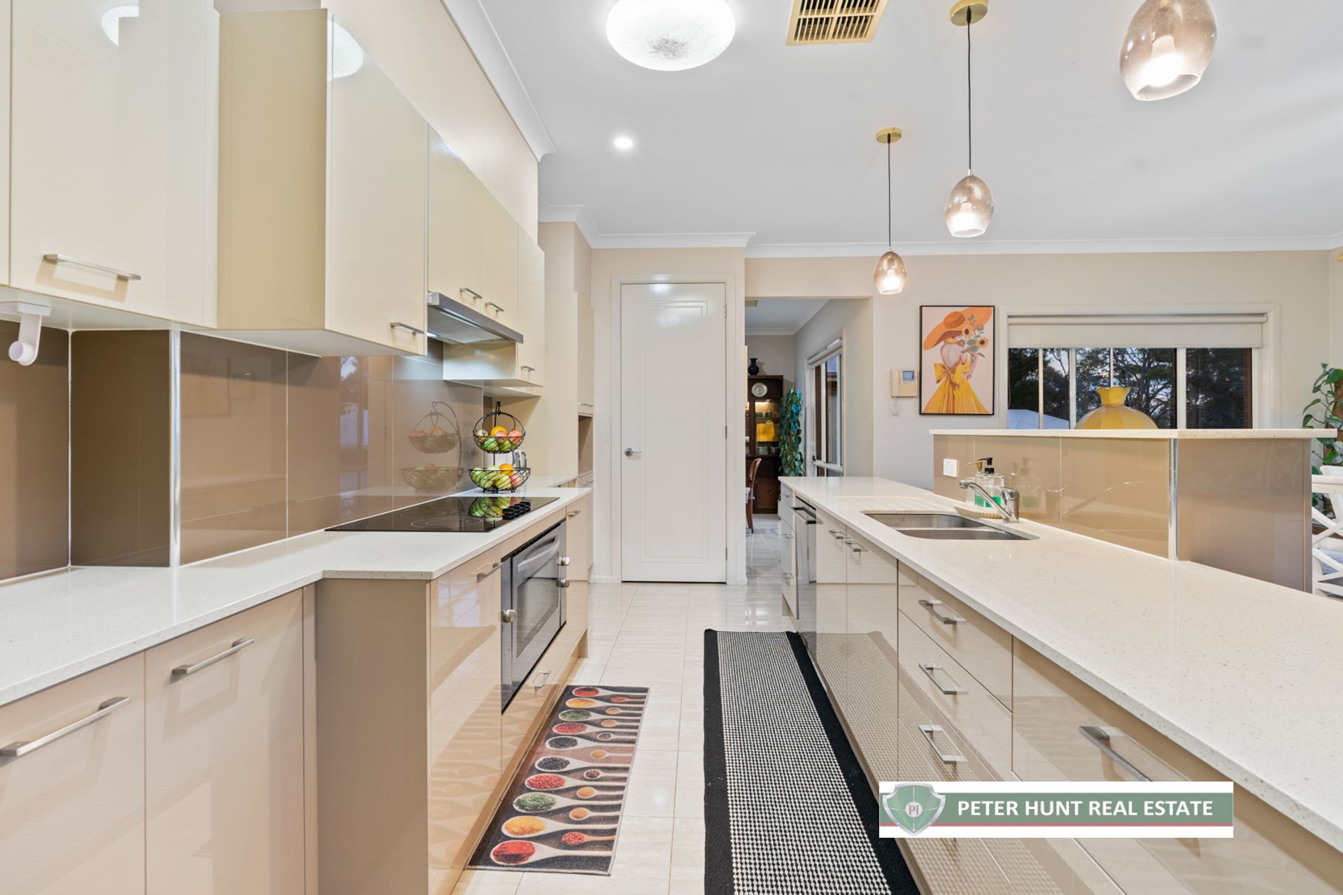 • Central Kitchen – 20mm Caesarstone benchtops, 900mm S/S Westinghouse oven, island bar with raised counter with open access to the spacious meals area and views.